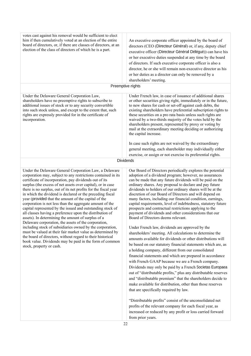 22 votes cast against his removal would be sufficient to elect him if then cumulatively voted at an election of the entire board of directors, or, if there are classes of directors, at an election of the class of directors of which he is a part. An executive corporate officer appointed by the board of directors (CEO (Directeur Général) or, if any, deputy chief executive officer (Directeur Général Délégué)) can have his or her executive duties suspended at any time by the board of directors. If such executive corporate officer is also a director, he or she will remain non-executive director as his or her duties as a director can only be removed by a shareholders’ meeting. Preemptive rights Under the Delaware General Corporation Law, shareholders have no preemptive rights to subscribe to additional issues of stock or to any security convertible into such stock unless, and except to the extent that, such rights are expressly provided for in the certificate of incorporation. Under French law, in case of issuance of additional shares or other securities giving right, immediately or in the future, to new shares for cash or set-off against cash debts, the existing shareholders have preferential subscription rights to these securities on a pro rata basis unless such rights are waived by a two-thirds majority of the votes held by the shareholders present, represented by proxy or voting by mail at the extraordinary meeting deciding or authorizing the capital increase. In case such rights are not waived by the extraordinary general meeting, each shareholder may individually either exercise, or assign or not exercise its preferential rights. Dividends Under the Delaware General Corporation Law, a Delaware corporation may, subject to any restrictions contained in its certificate of incorporation, pay dividends out of its surplus (the excess of net assets over capital), or in case there is no surplus, out of its net profits for the fiscal year in which the dividend is declared or the preceding fiscal year (provided that the amount of the capital of the corporation is not less than the aggregate amount of the capital represented by the issued and outstanding stock of all classes having a preference upon the distribution of assets). In determining the amount of surplus of a Delaware corporation, the assets of the corporation, including stock of subsidiaries owned by the corporation, must be valued at their fair market value as determined by the board of directors, without regard to their historical book value. Dividends may be paid in the form of common stock, property or cash. Our Board of Directors periodically explores the potential adoption of a dividend program; however, no assurances can be made that any future dividends will be paid on the ordinary shares. Any proposal to declare and pay future dividends to holders of our ordinary shares will be at the discretion of our Board of Directors and will depend on many factors, including our financial condition, earnings, capital requirements, level of indebtedness, statutory future prospects and contractual restrictions applying to the payment of dividends and other considerations that our Board of Directors deems relevant. Under French law, dividends are approved by the shareholders’ meeting. All calculations to determine the amounts available for dividends or other distributions will be based on our statutory financial statements which are, as a holding company, different from our consolidated financial statements and which are prepared in accordance with French GAAP because we are a French company. Dividends may only be paid by a French Societas Europaea out of “distributable profits,” plus any distributable reserves and “distributable premium” that the shareholders decide to make available for distribution, other than those reserves that are specifically required by law. “Distributable profits” consist of the unconsolidated net profits of the relevant company for each fiscal year, as increased or reduced by any profit or loss carried forward from prior years.
