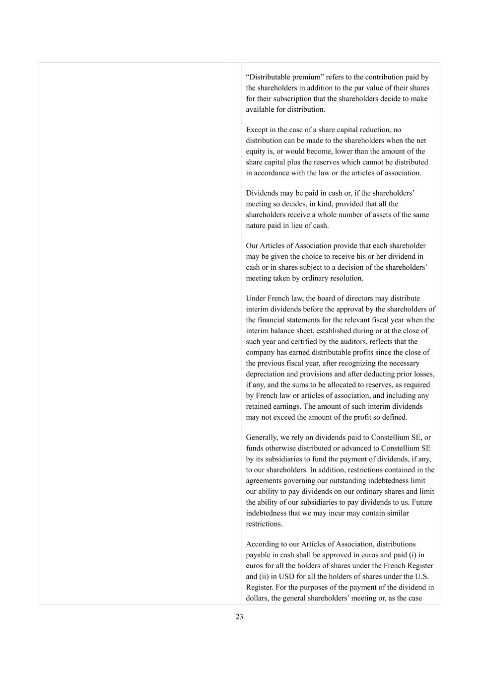 23 “Distributable premium” refers to the contribution paid by the shareholders in addition to the par value of their shares for their subscription that the shareholders decide to make available for distribution. Except in the case of a share capital reduction, no distribution can be made to the shareholders when the net equity is, or would become, lower than the amount of the share capital plus the reserves which cannot be distributed in accordance with the law or the articles of association. Dividends may be paid in cash or, if the shareholders’ meeting so decides, in kind, provided that all the shareholders receive a whole number of assets of the same nature paid in lieu of cash. Our Articles of Association provide that each shareholder may be given the choice to receive his or her dividend in cash or in shares subject to a decision of the shareholders’ meeting taken by ordinary resolution. Under French law, the board of directors may distribute interim dividends before the approval by the shareholders of the financial statements for the relevant fiscal year when the interim balance sheet, established during or at the close of such year and certified by the auditors, reflects that the company has earned distributable profits since the close of the previous fiscal year, after recognizing the necessary depreciation and provisions and after deducting prior losses, if any, and the sums to be allocated to reserves, as required by French law or articles of association, and including any retained earnings. The amount of such interim dividends may not exceed the amount of the profit so defined. Generally, we rely on dividends paid to Constellium SE, or funds otherwise distributed or advanced to Constellium SE by its subsidiaries to fund the payment of dividends, if any, to our shareholders. In addition, restrictions contained in the agreements governing our outstanding indebtedness limit our ability to pay dividends on our ordinary shares and limit the ability of our subsidiaries to pay dividends to us. Future indebtedness that we may incur may contain similar restrictions. According to our Articles of Association, distributions payable in cash shall be approved in euros and paid (i) in euros for all the holders of shares under the French Register and (ii) in USD for all the holders of shares under the U.S. Register. For the purposes of the payment of the dividend in dollars, the general shareholders’ meeting or, as the case