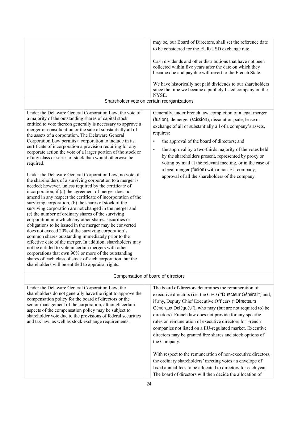 24 may be, our Board of Directors, shall set the reference date to be considered for the EUR/USD exchange rate. Cash dividends and other distributions that have not been collected within five years after the date on which they became due and payable will revert to the French State. We have historically not paid dividends to our shareholders since the time we became a publicly listed company on the NYSE. Shareholder vote on certain reorganizations Under the Delaware General Corporation Law, the vote of a majority of the outstanding shares of capital stock entitled to vote thereon generally is necessary to approve a merger or consolidation or the sale of substantially all of the assets of a corporation. The Delaware General Corporation Law permits a corporation to include in its certificate of incorporation a provision requiring for any corporate action the vote of a larger portion of the stock or of any class or series of stock than would otherwise be required. Under the Delaware General Corporation Law, no vote of the shareholders of a surviving corporation to a merger is needed; however, unless required by the certificate of incorporation, if (a) the agreement of merger does not amend in any respect the certificate of incorporation of the surviving corporation, (b) the shares of stock of the surviving corporation are not changed in the merger and (c) the number of ordinary shares of the surviving corporation into which any other shares, securities or obligations to be issued in the merger may be converted does not exceed 20% of the surviving corporation’s common shares outstanding immediately prior to the effective date of the merger. In addition, shareholders may not be entitled to vote in certain mergers with other corporations that own 90% or more of the outstanding shares of each class of stock of such corporation, but the shareholders will be entitled to appraisal rights. Generally, under French law, completion of a legal merger (fusion), demerger (scission), dissolution, sale, lease or exchange of all or substantially all of a company’s assets, requires: •  the approval of the board of directors; and •  the approval by a two-thirds majority of the votes held by the shareholders present, represented by proxy or voting by mail at the relevant meeting, or in the case of a legal merger (fusion) with a non-EU company, approval of all the shareholders of the company. Compensation of board of directors Under the Delaware General Corporation Law, the shareholders do not generally have the right to approve the compensation policy for the board of directors or the senior management of the corporation, although certain aspects of the compensation policy may be subject to shareholder vote due to the provisions of federal securities and tax law, as well as stock exchange requirements. The board of directors determines the remuneration of executive directors (i.e. the CEO (“Directeur Général”) and, if any, Deputy Chief Executive Officers (“Directeurs Généraux Délégués”), who may (but are not required to) be directors). French law does not provide for any specific rules on remuneration of executive directors for French companies not listed on a EU-regulated market. Executive directors may be granted free shares and stock options of the Company. With respect to the remuneration of non-executive directors, the ordinary shareholders’ meeting votes an envelope of fixed annual fees to be allocated to directors for each year. The board of directors will then decide the allocation of