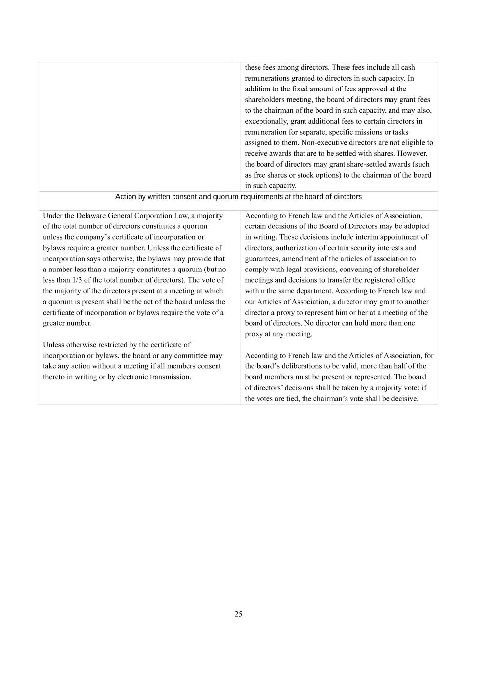 25 these fees among directors. These fees include all cash remunerations granted to directors in such capacity. In addition to the fixed amount of fees approved at the shareholders meeting, the board of directors may grant fees to the chairman of the board in such capacity, and may also, exceptionally, grant additional fees to certain directors in remuneration for separate, specific missions or tasks assigned to them. Non-executive directors are not eligible to receive awards that are to be settled with shares. However, the board of directors may grant share-settled awards (such as free shares or stock options) to the chairman of the board in such capacity. Action by written consent and quorum requirements at the board of directors Under the Delaware General Corporation Law, a majority of the total number of directors constitutes a quorum unless the company’s certificate of incorporation or bylaws require a greater number. Unless the certificate of incorporation says otherwise, the bylaws may provide that a number less than a majority constitutes a quorum (but no less than 1/3 of the total number of directors). The vote of the majority of the directors present at a meeting at which a quorum is present shall be the act of the board unless the certificate of incorporation or bylaws require the vote of a greater number. Unless otherwise restricted by the certificate of incorporation or bylaws, the board or any committee may take any action without a meeting if all members consent thereto in writing or by electronic transmission. According to French law and the Articles of Association, certain decisions of the Board of Directors may be adopted in writing. These decisions include interim appointment of directors, authorization of certain security interests and guarantees, amendment of the articles of association to comply with legal provisions, convening of shareholder meetings and decisions to transfer the registered office within the same department. According to French law and our Articles of Association, a director may grant to another director a proxy to represent him or her at a meeting of the board of directors. No director can hold more than one proxy at any meeting. According to French law and the Articles of Association, for the board’s deliberations to be valid, more than half of the board members must be present or represented. The board of directors’ decisions shall be taken by a majority vote; if the votes are tied, the chairman’s vote shall be decisive.