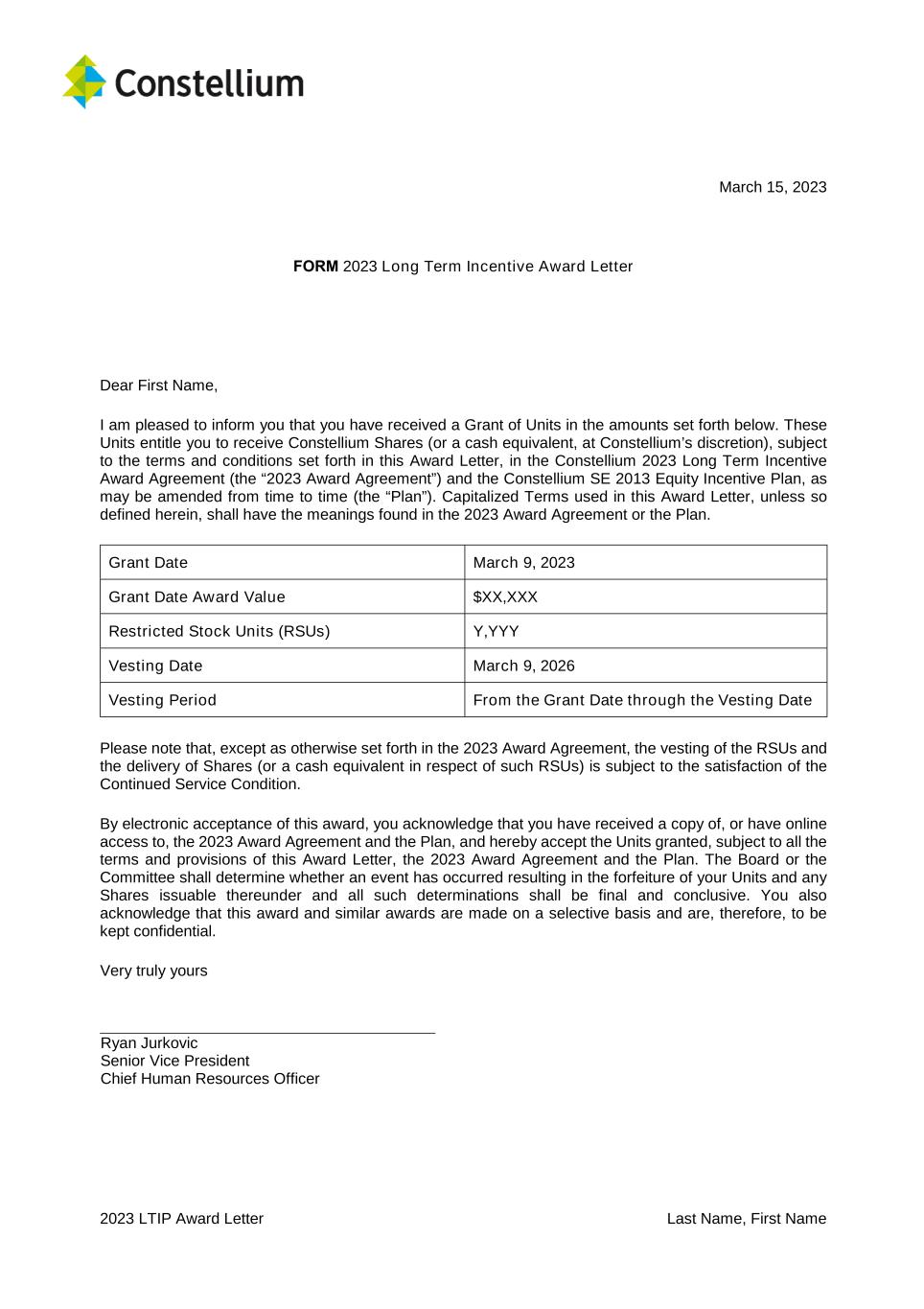 2023 LTIP Award Letter Last Name, First Name March 15, 2023 FORM 2023 Long Term Incentive Award Letter Dear First Name, I am pleased to inform you that you have received a Grant of Units in the amounts set forth below. These Units entitle you to receive Constellium Shares (or a cash equivalent, at Constellium’s discretion), subject to the terms and conditions set forth in this Award Letter, in the Constellium 2023 Long Term Incentive Award Agreement (the “2023 Award Agreement”) and the Constellium SE 2013 Equity Incentive Plan, as may be amended from time to time (the “Plan”). Capitalized Terms used in this Award Letter, unless so defined herein, shall have the meanings found in the 2023 Award Agreement or the Plan. Grant Date March 9, 2023 Grant Date Award Value $XX,XXX Restricted Stock Units (RSUs) Y,YYY Vesting Date March 9, 2026 Vesting Period From the Grant Date through the Vesting Date Please note that, except as otherwise set forth in the 2023 Award Agreement, the vesting of the RSUs and the delivery of Shares (or a cash equivalent in respect of such RSUs) is subject to the satisfaction of the Continued Service Condition. By electronic acceptance of this award, you acknowledge that you have received a copy of, or have online access to, the 2023 Award Agreement and the Plan, and hereby accept the Units granted, subject to all the terms and provisions of this Award Letter, the 2023 Award Agreement and the Plan. The Board or the Committee shall determine whether an event has occurred resulting in the forfeiture of your Units and any Shares issuable thereunder and all such determinations shall be final and conclusive. You also acknowledge that this award and similar awards are made on a selective basis and are, therefore, to be kept confidential. Very truly yours Ryan Jurkovic Senior Vice President Chief Human Resources Officer