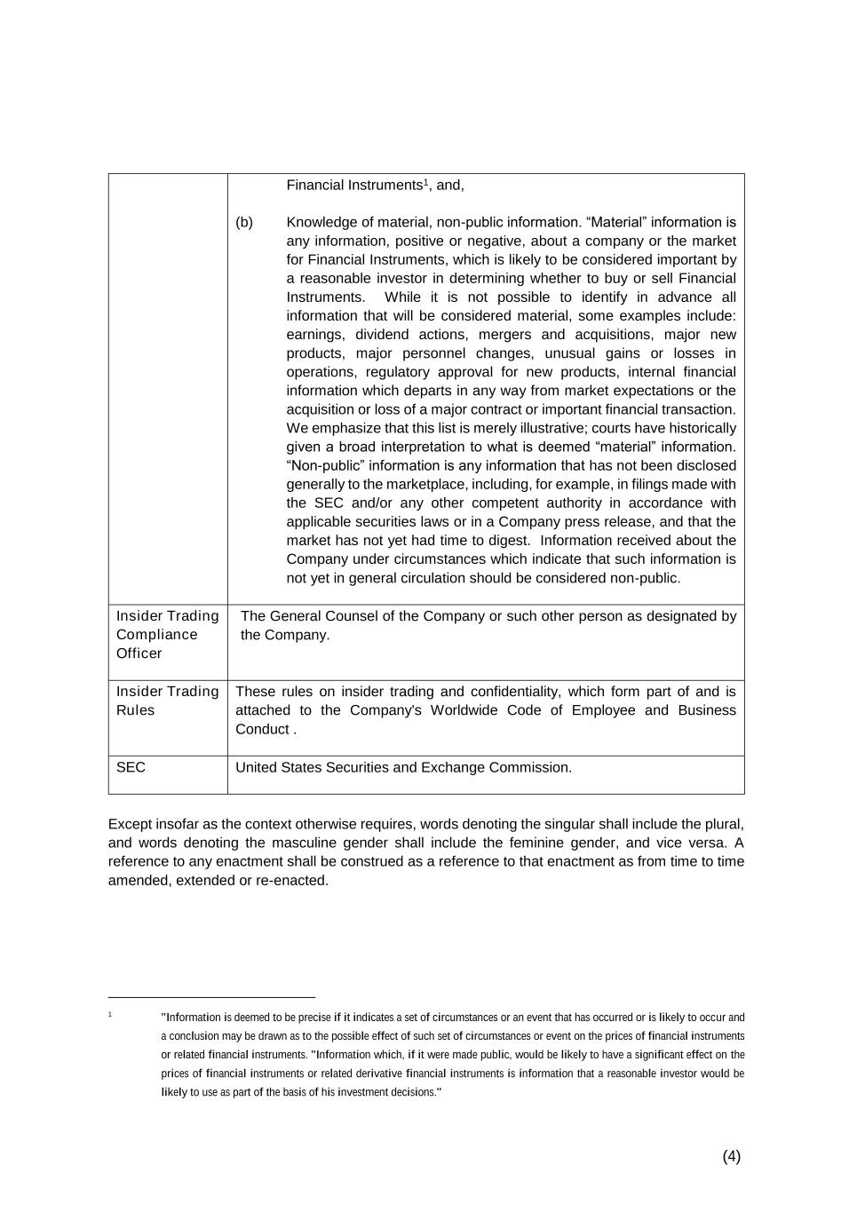 (4) Financial Instruments1, and, (b) Knowledge of material, non-public information. “Material” information is any information, positive or negative, about a company or the market for Financial Instruments, which is likely to be considered important by a reasonable investor in determining whether to buy or sell Financial Instruments. While it is not possible to identify in advance all information that will be considered material, some examples include: earnings, dividend actions, mergers and acquisitions, major new products, major personnel changes, unusual gains or losses in operations, regulatory approval for new products, internal financial information which departs in any way from market expectations or the acquisition or loss of a major contract or important financial transaction. We emphasize that this list is merely illustrative; courts have historically given a broad interpretation to what is deemed “material” information. “Non-public” information is any information that has not been disclosed generally to the marketplace, including, for example, in filings made with the SEC and/or any other competent authority in accordance with applicable securities laws or in a Company press release, and that the market has not yet had time to digest. Information received about the Company under circumstances which indicate that such information is not yet in general circulation should be considered non-public. Insider Trading Compliance Officer The General Counsel of the Company or such other person as designated by the Company. Insider Trading Rules These rules on insider trading and confidentiality, which form part of and is attached to the Company's Worldwide Code of Employee and Business Conduct . SEC United States Securities and Exchange Commission. Except insofar as the context otherwise requires, words denoting the singular shall include the plural, and words denoting the masculine gender shall include the feminine gender, and vice versa. A reference to any enactment shall be construed as a reference to that enactment as from time to time amended, extended or re-enacted. 1 "Information is deemed to be precise if it indicates a set of circumstances or an event that has occurred or is likely to occur and a conclusion may be drawn as to the possible effect of such set of circumstances or event on the prices of financial instruments or related financial instruments. "Information which, if it were made public, would be likely to have a significant effect on the prices of financial instruments or related derivative financial instruments is information that a reasonable investor would be likely to use as part of the basis of his investment decisions."