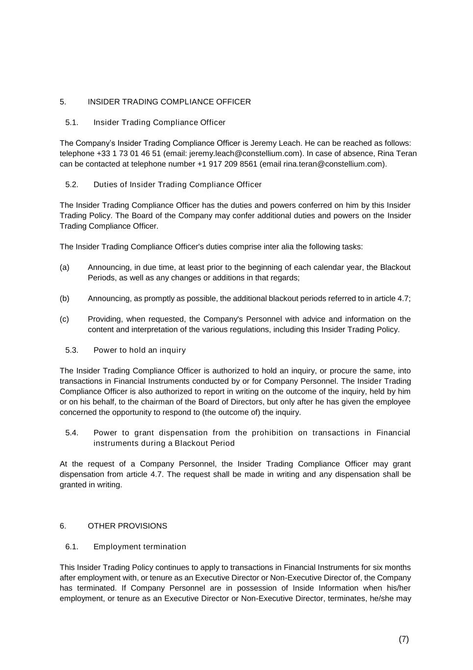 (7) 5. INSIDER TRADING COMPLIANCE OFFICER 5.1. Insider Trading Compliance Officer The Company’s Insider Trading Compliance Officer is Jeremy Leach. He can be reached as follows: telephone +33 1 73 01 46 51 (email: jeremy.leach@constellium.com). In case of absence, Rina Teran can be contacted at telephone number +1 917 209 8561 (email rina.teran@constellium.com). 5.2. Duties of Insider Trading Compliance Officer The Insider Trading Compliance Officer has the duties and powers conferred on him by this Insider Trading Policy. The Board of the Company may confer additional duties and powers on the Insider Trading Compliance Officer. The Insider Trading Compliance Officer's duties comprise inter alia the following tasks: (a) Announcing, in due time, at least prior to the beginning of each calendar year, the Blackout Periods, as well as any changes or additions in that regards; (b) Announcing, as promptly as possible, the additional blackout periods referred to in article 4.7; (c) Providing, when requested, the Company's Personnel with advice and information on the content and interpretation of the various regulations, including this Insider Trading Policy. 5.3. Power to hold an inquiry The Insider Trading Compliance Officer is authorized to hold an inquiry, or procure the same, into transactions in Financial Instruments conducted by or for Company Personnel. The Insider Trading Compliance Officer is also authorized to report in writing on the outcome of the inquiry, held by him or on his behalf, to the chairman of the Board of Directors, but only after he has given the employee concerned the opportunity to respond to (the outcome of) the inquiry. 5.4. Power to grant dispensation from the prohibition on transactions in Financial instruments during a Blackout Period At the request of a Company Personnel, the Insider Trading Compliance Officer may grant dispensation from article 4.7. The request shall be made in writing and any dispensation shall be granted in writing. 6. OTHER PROVISIONS 6.1. Employment termination This Insider Trading Policy continues to apply to transactions in Financial Instruments for six months after employment with, or tenure as an Executive Director or Non-Executive Director of, the Company has terminated. If Company Personnel are in possession of Inside Information when his/her employment, or tenure as an Executive Director or Non-Executive Director, terminates, he/she may