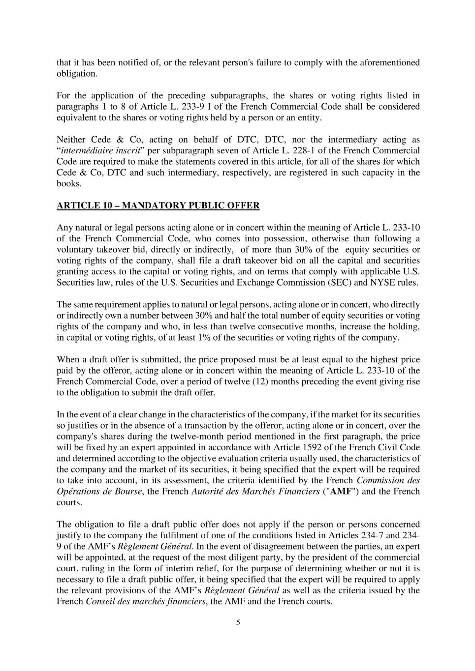 5 that it has been notified of, or the relevant person's failure to comply with the aforementioned obligation. For the application of the preceding subparagraphs, the shares or voting rights listed in paragraphs 1 to 8 of Article L. 233-9 I of the French Commercial Code shall be considered equivalent to the shares or voting rights held by a person or an entity. Neither Cede & Co, acting on behalf of DTC, DTC, nor the intermediary acting as “intermédiaire inscrit” per subparagraph seven of Article L. 228-1 of the French Commercial Code are required to make the statements covered in this article, for all of the shares for which Cede & Co, DTC and such intermediary, respectively, are registered in such capacity in the books. ARTICLE 10 – MANDATORY PUBLIC OFFER Any natural or legal persons acting alone or in concert within the meaning of Article L. 233-10 of the French Commercial Code, who comes into possession, otherwise than following a voluntary takeover bid, directly or indirectly, of more than 30% of the equity securities or voting rights of the company, shall file a draft takeover bid on all the capital and securities granting access to the capital or voting rights, and on terms that comply with applicable U.S. Securities law, rules of the U.S. Securities and Exchange Commission (SEC) and NYSE rules. The same requirement applies to natural or legal persons, acting alone or in concert, who directly or indirectly own a number between 30% and half the total number of equity securities or voting rights of the company and who, in less than twelve consecutive months, increase the holding, in capital or voting rights, of at least 1% of the securities or voting rights of the company. When a draft offer is submitted, the price proposed must be at least equal to the highest price paid by the offeror, acting alone or in concert within the meaning of Article L. 233-10 of the French Commercial Code, over a period of twelve (12) months preceding the event giving rise to the obligation to submit the draft offer. In the event of a clear change in the characteristics of the company, if the market for its securities so justifies or in the absence of a transaction by the offeror, acting alone or in concert, over the company's shares during the twelve-month period mentioned in the first paragraph, the price will be fixed by an expert appointed in accordance with Article 1592 of the French Civil Code and determined according to the objective evaluation criteria usually used, the characteristics of the company and the market of its securities, it being specified that the expert will be required to take into account, in its assessment, the criteria identified by the French Commission des Opérations de Bourse, the French Autorité des Marchés Financiers ("AMF") and the French courts. The obligation to file a draft public offer does not apply if the person or persons concerned justify to the company the fulfilment of one of the conditions listed in Articles 234-7 and 234- 9 of the AMF’s Règlement Général. In the event of disagreement between the parties, an expert will be appointed, at the request of the most diligent party, by the president of the commercial court, ruling in the form of interim relief, for the purpose of determining whether or not it is necessary to file a draft public offer, it being specified that the expert will be required to apply the relevant provisions of the AMF’s Règlement Général as well as the criteria issued by the French Conseil des marchés financiers, the AMF and the French courts.