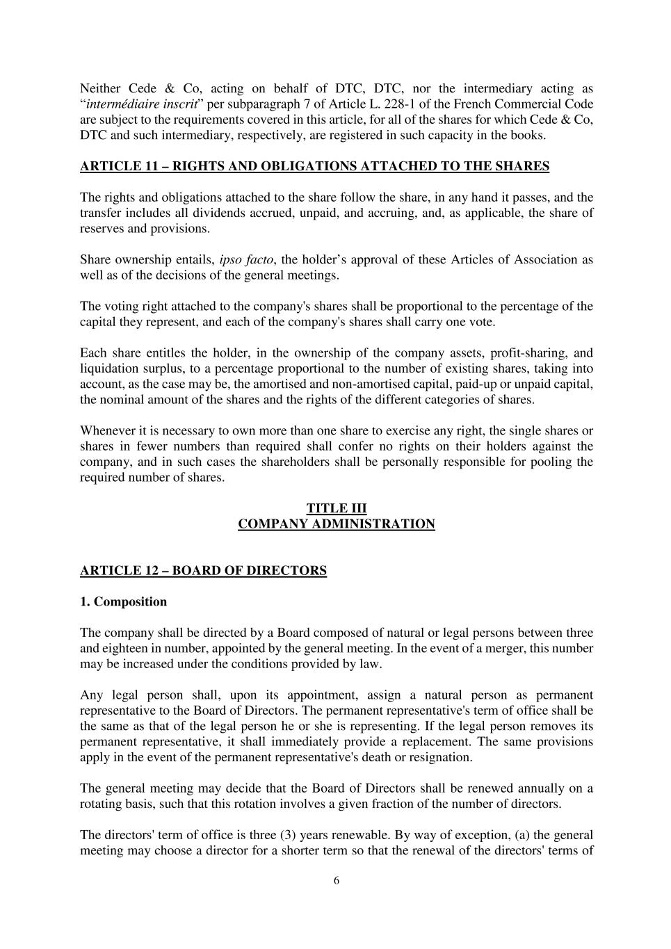 6 Neither Cede & Co, acting on behalf of DTC, DTC, nor the intermediary acting as “intermédiaire inscrit” per subparagraph 7 of Article L. 228-1 of the French Commercial Code are subject to the requirements covered in this article, for all of the shares for which Cede & Co, DTC and such intermediary, respectively, are registered in such capacity in the books. ARTICLE 11 – RIGHTS AND OBLIGATIONS ATTACHED TO THE SHARES The rights and obligations attached to the share follow the share, in any hand it passes, and the transfer includes all dividends accrued, unpaid, and accruing, and, as applicable, the share of reserves and provisions. Share ownership entails, ipso facto, the holder’s approval of these Articles of Association as well as of the decisions of the general meetings. The voting right attached to the company's shares shall be proportional to the percentage of the capital they represent, and each of the company's shares shall carry one vote. Each share entitles the holder, in the ownership of the company assets, profit-sharing, and liquidation surplus, to a percentage proportional to the number of existing shares, taking into account, as the case may be, the amortised and non-amortised capital, paid-up or unpaid capital, the nominal amount of the shares and the rights of the different categories of shares. Whenever it is necessary to own more than one share to exercise any right, the single shares or shares in fewer numbers than required shall confer no rights on their holders against the company, and in such cases the shareholders shall be personally responsible for pooling the required number of shares. TITLE III COMPANY ADMINISTRATION ARTICLE 12 – BOARD OF DIRECTORS 1. Composition The company shall be directed by a Board composed of natural or legal persons between three and eighteen in number, appointed by the general meeting. In the event of a merger, this number may be increased under the conditions provided by law. Any legal person shall, upon its appointment, assign a natural person as permanent representative to the Board of Directors. The permanent representative's term of office shall be the same as that of the legal person he or she is representing. If the legal person removes its permanent representative, it shall immediately provide a replacement. The same provisions apply in the event of the permanent representative's death or resignation. The general meeting may decide that the Board of Directors shall be renewed annually on a rotating basis, such that this rotation involves a given fraction of the number of directors. The directors' term of office is three (3) years renewable. By way of exception, (a) the general meeting may choose a director for a shorter term so that the renewal of the directors' terms of