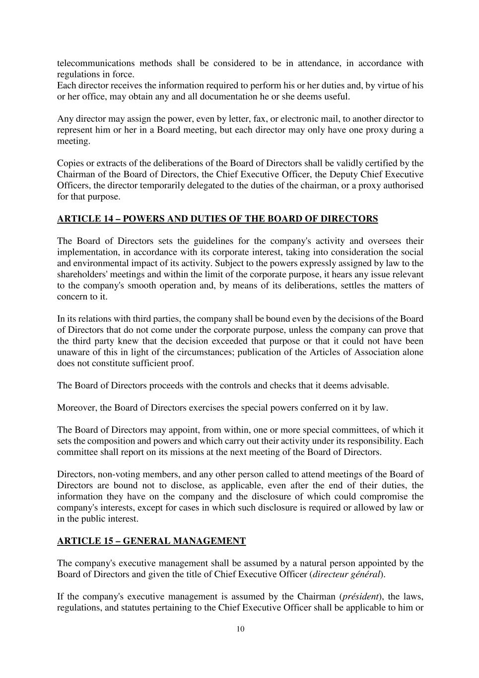 10 telecommunications methods shall be considered to be in attendance, in accordance with regulations in force. Each director receives the information required to perform his or her duties and, by virtue of his or her office, may obtain any and all documentation he or she deems useful. Any director may assign the power, even by letter, fax, or electronic mail, to another director to represent him or her in a Board meeting, but each director may only have one proxy during a meeting. Copies or extracts of the deliberations of the Board of Directors shall be validly certified by the Chairman of the Board of Directors, the Chief Executive Officer, the Deputy Chief Executive Officers, the director temporarily delegated to the duties of the chairman, or a proxy authorised for that purpose. ARTICLE 14 – POWERS AND DUTIES OF THE BOARD OF DIRECTORS The Board of Directors sets the guidelines for the company's activity and oversees their implementation, in accordance with its corporate interest, taking into consideration the social and environmental impact of its activity. Subject to the powers expressly assigned by law to the shareholders' meetings and within the limit of the corporate purpose, it hears any issue relevant to the company's smooth operation and, by means of its deliberations, settles the matters of concern to it. In its relations with third parties, the company shall be bound even by the decisions of the Board of Directors that do not come under the corporate purpose, unless the company can prove that the third party knew that the decision exceeded that purpose or that it could not have been unaware of this in light of the circumstances; publication of the Articles of Association alone does not constitute sufficient proof. The Board of Directors proceeds with the controls and checks that it deems advisable. Moreover, the Board of Directors exercises the special powers conferred on it by law. The Board of Directors may appoint, from within, one or more special committees, of which it sets the composition and powers and which carry out their activity under its responsibility. Each committee shall report on its missions at the next meeting of the Board of Directors. Directors, non-voting members, and any other person called to attend meetings of the Board of Directors are bound not to disclose, as applicable, even after the end of their duties, the information they have on the company and the disclosure of which could compromise the company's interests, except for cases in which such disclosure is required or allowed by law or in the public interest. ARTICLE 15 – GENERAL MANAGEMENT The company's executive management shall be assumed by a natural person appointed by the Board of Directors and given the title of Chief Executive Officer (directeur général). If the company's executive management is assumed by the Chairman (président), the laws, regulations, and statutes pertaining to the Chief Executive Officer shall be applicable to him or