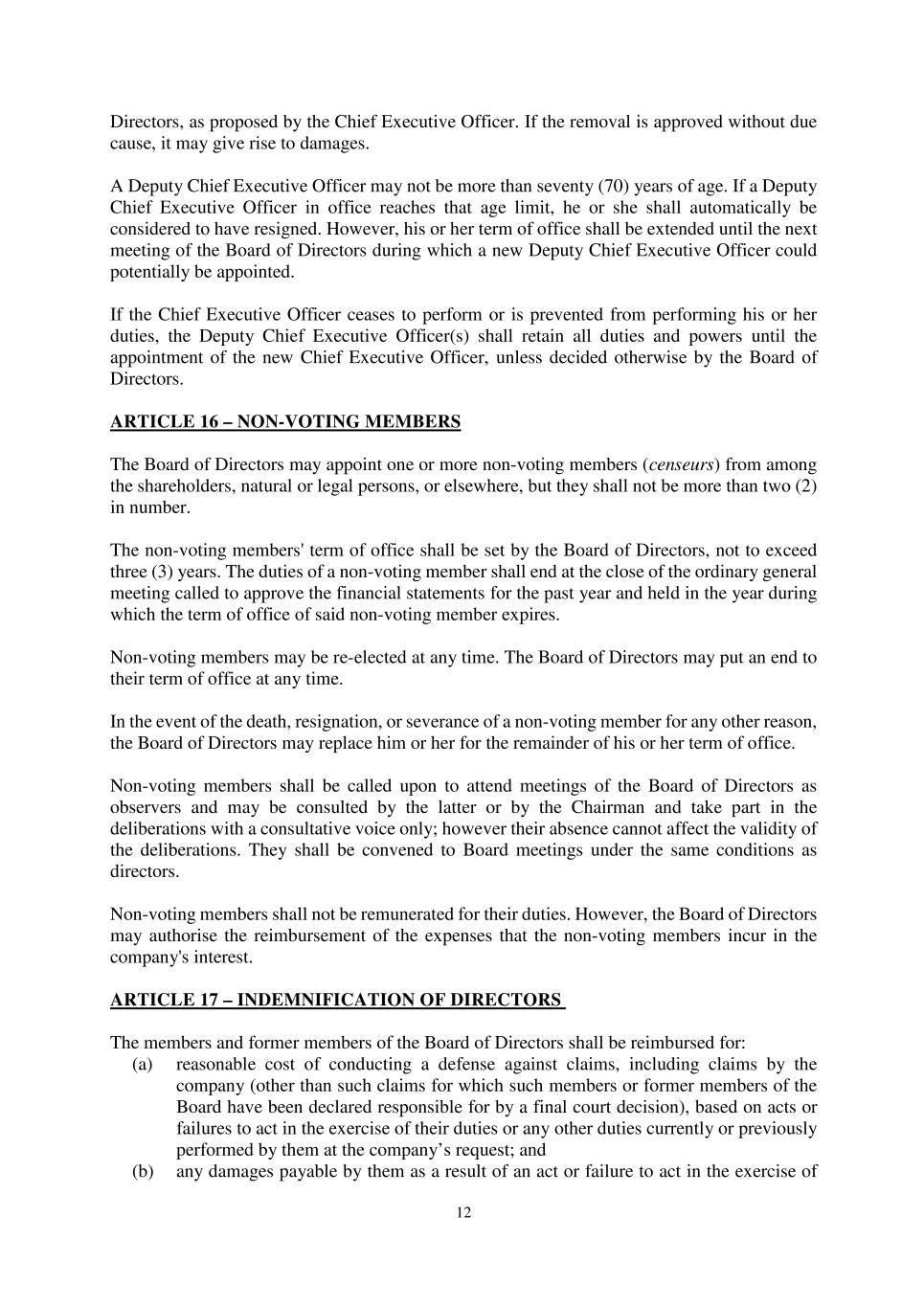 12 Directors, as proposed by the Chief Executive Officer. If the removal is approved without due cause, it may give rise to damages. A Deputy Chief Executive Officer may not be more than seventy (70) years of age. If a Deputy Chief Executive Officer in office reaches that age limit, he or she shall automatically be considered to have resigned. However, his or her term of office shall be extended until the next meeting of the Board of Directors during which a new Deputy Chief Executive Officer could potentially be appointed. If the Chief Executive Officer ceases to perform or is prevented from performing his or her duties, the Deputy Chief Executive Officer(s) shall retain all duties and powers until the appointment of the new Chief Executive Officer, unless decided otherwise by the Board of Directors. ARTICLE 16 – NON-VOTING MEMBERS The Board of Directors may appoint one or more non-voting members (censeurs) from among the shareholders, natural or legal persons, or elsewhere, but they shall not be more than two (2) in number. The non-voting members' term of office shall be set by the Board of Directors, not to exceed three (3) years. The duties of a non-voting member shall end at the close of the ordinary general meeting called to approve the financial statements for the past year and held in the year during which the term of office of said non-voting member expires. Non-voting members may be re-elected at any time. The Board of Directors may put an end to their term of office at any time. In the event of the death, resignation, or severance of a non-voting member for any other reason, the Board of Directors may replace him or her for the remainder of his or her term of office. Non-voting members shall be called upon to attend meetings of the Board of Directors as observers and may be consulted by the latter or by the Chairman and take part in the deliberations with a consultative voice only; however their absence cannot affect the validity of the deliberations. They shall be convened to Board meetings under the same conditions as directors. Non-voting members shall not be remunerated for their duties. However, the Board of Directors may authorise the reimbursement of the expenses that the non-voting members incur in the company's interest. ARTICLE 17 – INDEMNIFICATION OF DIRECTORS The members and former members of the Board of Directors shall be reimbursed for: (a) reasonable cost of conducting a defense against claims, including claims by the company (other than such claims for which such members or former members of the Board have been declared responsible for by a final court decision), based on acts or failures to act in the exercise of their duties or any other duties currently or previously performed by them at the company’s request; and (b) any damages payable by them as a result of an act or failure to act in the exercise of