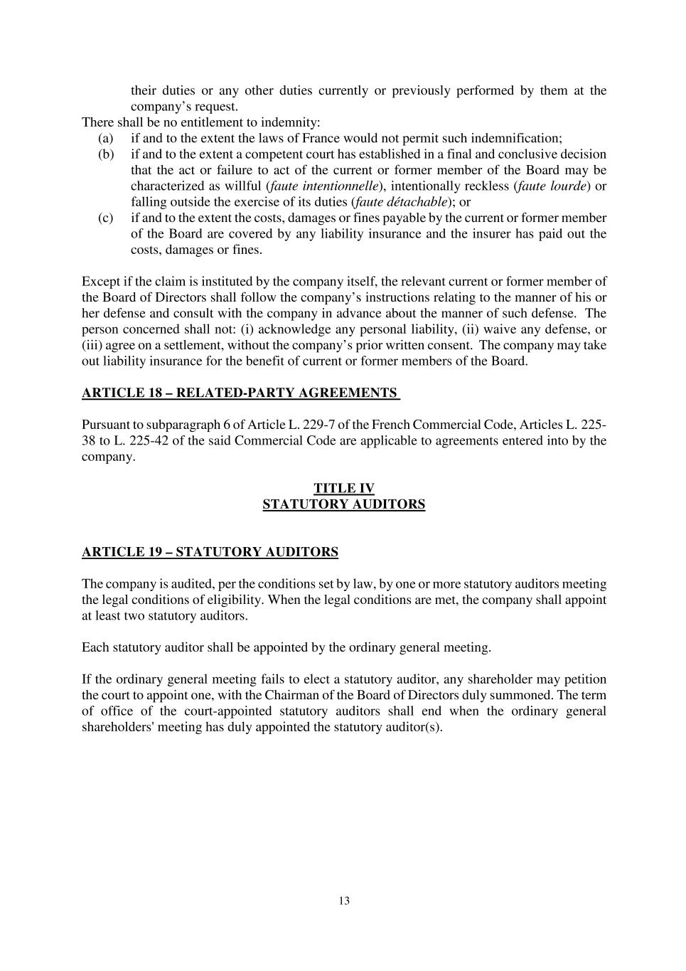 13 their duties or any other duties currently or previously performed by them at the company’s request. There shall be no entitlement to indemnity: (a) if and to the extent the laws of France would not permit such indemnification; (b) if and to the extent a competent court has established in a final and conclusive decision that the act or failure to act of the current or former member of the Board may be characterized as willful (faute intentionnelle), intentionally reckless (faute lourde) or falling outside the exercise of its duties (faute détachable); or (c) if and to the extent the costs, damages or fines payable by the current or former member of the Board are covered by any liability insurance and the insurer has paid out the costs, damages or fines. Except if the claim is instituted by the company itself, the relevant current or former member of the Board of Directors shall follow the company’s instructions relating to the manner of his or her defense and consult with the company in advance about the manner of such defense. The person concerned shall not: (i) acknowledge any personal liability, (ii) waive any defense, or (iii) agree on a settlement, without the company’s prior written consent. The company may take out liability insurance for the benefit of current or former members of the Board. ARTICLE 18 – RELATED-PARTY AGREEMENTS Pursuant to subparagraph 6 of Article L. 229-7 of the French Commercial Code, Articles L. 225- 38 to L. 225-42 of the said Commercial Code are applicable to agreements entered into by the company. TITLE IV STATUTORY AUDITORS ARTICLE 19 – STATUTORY AUDITORS The company is audited, per the conditions set by law, by one or more statutory auditors meeting the legal conditions of eligibility. When the legal conditions are met, the company shall appoint at least two statutory auditors. Each statutory auditor shall be appointed by the ordinary general meeting. If the ordinary general meeting fails to elect a statutory auditor, any shareholder may petition the court to appoint one, with the Chairman of the Board of Directors duly summoned. The term of office of the court-appointed statutory auditors shall end when the ordinary general shareholders' meeting has duly appointed the statutory auditor(s).