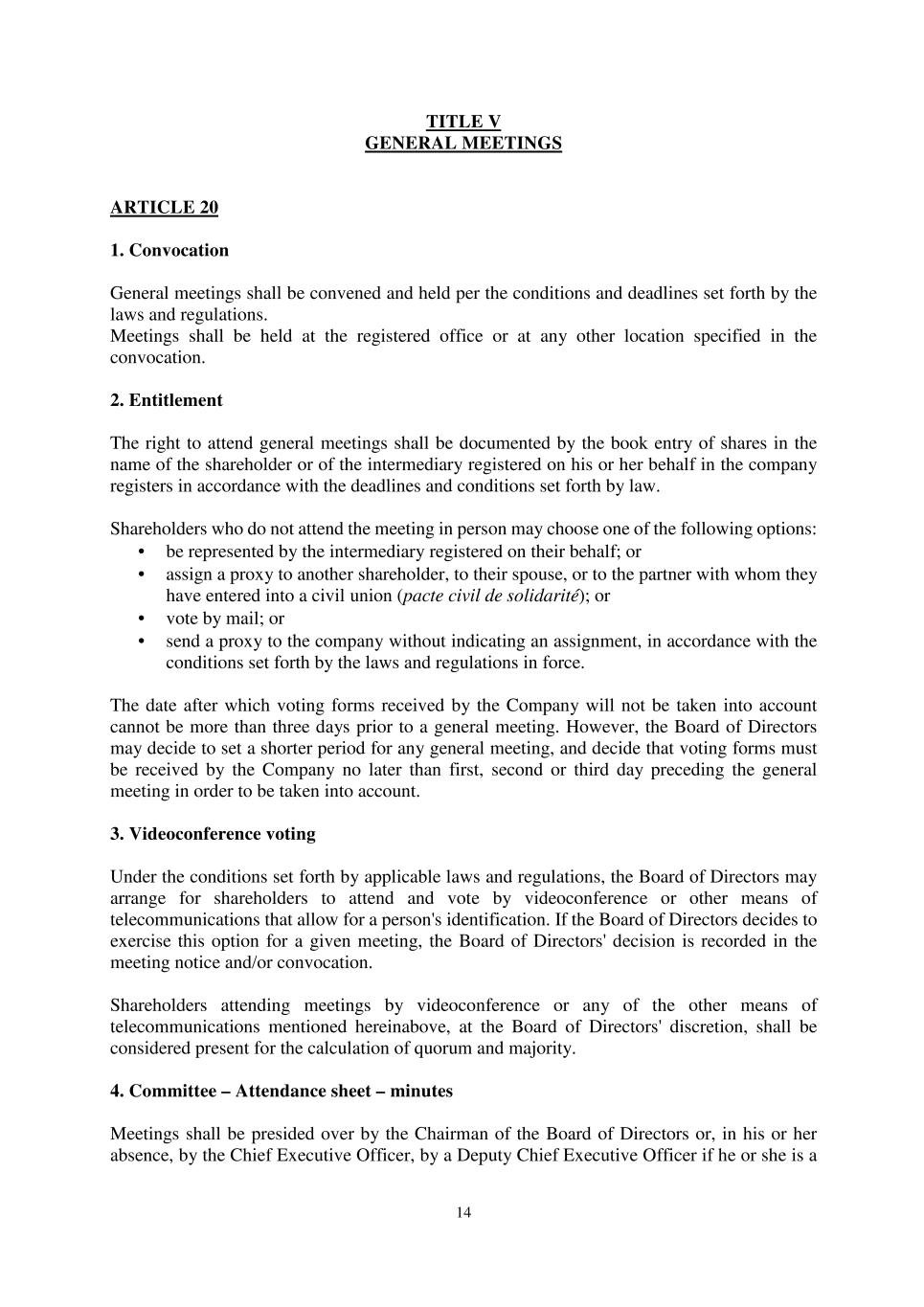 14 TITLE V GENERAL MEETINGS ARTICLE 20 1. Convocation General meetings shall be convened and held per the conditions and deadlines set forth by the laws and regulations. Meetings shall be held at the registered office or at any other location specified in the convocation. 2. Entitlement The right to attend general meetings shall be documented by the book entry of shares in the name of the shareholder or of the intermediary registered on his or her behalf in the company registers in accordance with the deadlines and conditions set forth by law. Shareholders who do not attend the meeting in person may choose one of the following options: • be represented by the intermediary registered on their behalf; or • assign a proxy to another shareholder, to their spouse, or to the partner with whom they have entered into a civil union (pacte civil de solidarité); or • vote by mail; or • send a proxy to the company without indicating an assignment, in accordance with the conditions set forth by the laws and regulations in force. The date after which voting forms received by the Company will not be taken into account cannot be more than three days prior to a general meeting. However, the Board of Directors may decide to set a shorter period for any general meeting, and decide that voting forms must be received by the Company no later than first, second or third day preceding the general meeting in order to be taken into account. 3. Videoconference voting Under the conditions set forth by applicable laws and regulations, the Board of Directors may arrange for shareholders to attend and vote by videoconference or other means of telecommunications that allow for a person's identification. If the Board of Directors decides to exercise this option for a given meeting, the Board of Directors' decision is recorded in the meeting notice and/or convocation. Shareholders attending meetings by videoconference or any of the other means of telecommunications mentioned hereinabove, at the Board of Directors' discretion, shall be considered present for the calculation of quorum and majority. 4. Committee – Attendance sheet – minutes Meetings shall be presided over by the Chairman of the Board of Directors or, in his or her absence, by the Chief Executive Officer, by a Deputy Chief Executive Officer if he or she is a