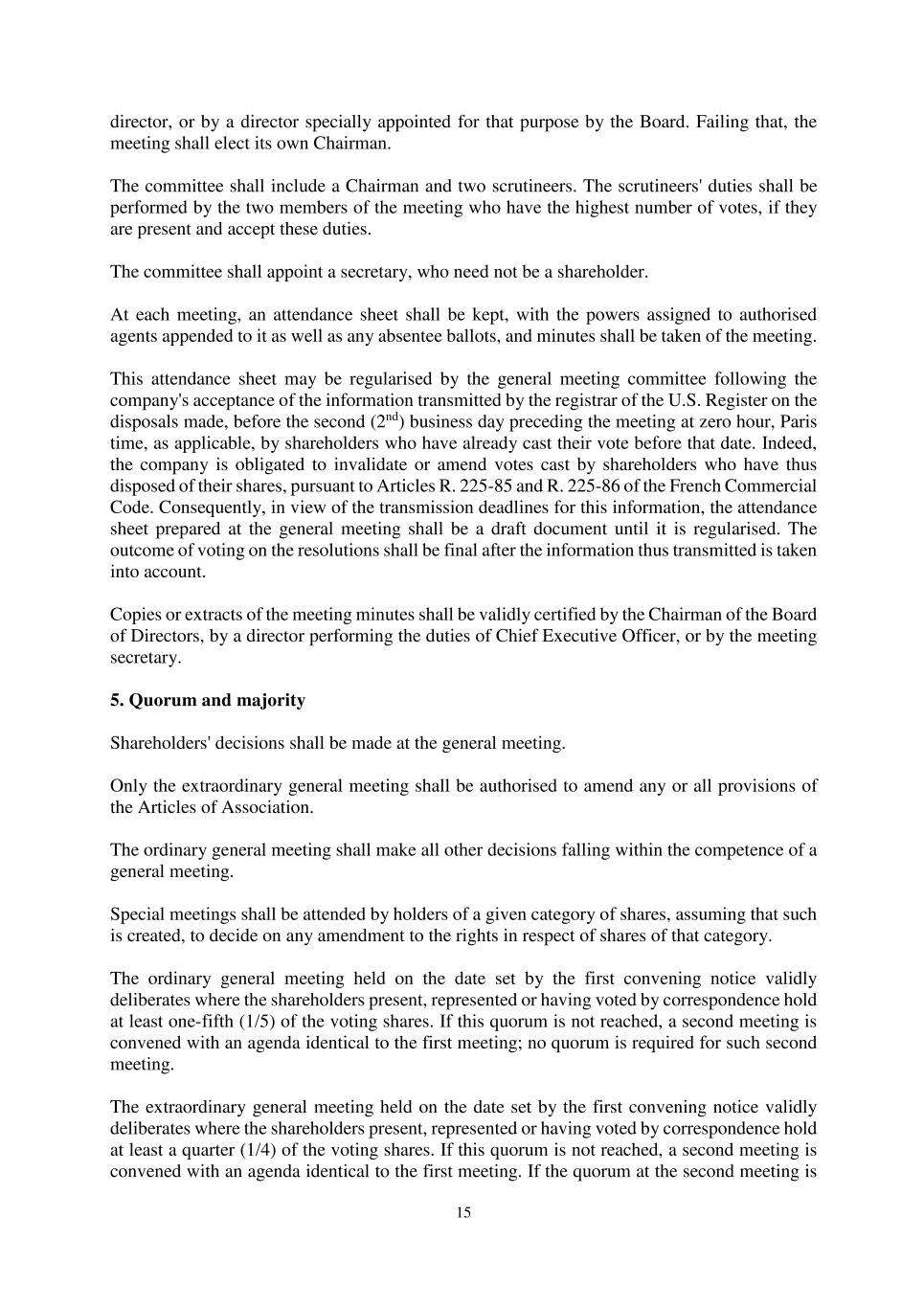15 director, or by a director specially appointed for that purpose by the Board. Failing that, the meeting shall elect its own Chairman. The committee shall include a Chairman and two scrutineers. The scrutineers' duties shall be performed by the two members of the meeting who have the highest number of votes, if they are present and accept these duties. The committee shall appoint a secretary, who need not be a shareholder. At each meeting, an attendance sheet shall be kept, with the powers assigned to authorised agents appended to it as well as any absentee ballots, and minutes shall be taken of the meeting. This attendance sheet may be regularised by the general meeting committee following the company's acceptance of the information transmitted by the registrar of the U.S. Register on the disposals made, before the second (2nd) business day preceding the meeting at zero hour, Paris time, as applicable, by shareholders who have already cast their vote before that date. Indeed, the company is obligated to invalidate or amend votes cast by shareholders who have thus disposed of their shares, pursuant to Articles R. 225-85 and R. 225-86 of the French Commercial Code. Consequently, in view of the transmission deadlines for this information, the attendance sheet prepared at the general meeting shall be a draft document until it is regularised. The outcome of voting on the resolutions shall be final after the information thus transmitted is taken into account. Copies or extracts of the meeting minutes shall be validly certified by the Chairman of the Board of Directors, by a director performing the duties of Chief Executive Officer, or by the meeting secretary. 5. Quorum and majority Shareholders' decisions shall be made at the general meeting. Only the extraordinary general meeting shall be authorised to amend any or all provisions of the Articles of Association. The ordinary general meeting shall make all other decisions falling within the competence of a general meeting. Special meetings shall be attended by holders of a given category of shares, assuming that such is created, to decide on any amendment to the rights in respect of shares of that category. The ordinary general meeting held on the date set by the first convening notice validly deliberates where the shareholders present, represented or having voted by correspondence hold at least one-fifth (1/5) of the voting shares. If this quorum is not reached, a second meeting is convened with an agenda identical to the first meeting; no quorum is required for such second meeting. The extraordinary general meeting held on the date set by the first convening notice validly deliberates where the shareholders present, represented or having voted by correspondence hold at least a quarter (1/4) of the voting shares. If this quorum is not reached, a second meeting is convened with an agenda identical to the first meeting. If the quorum at the second meeting is