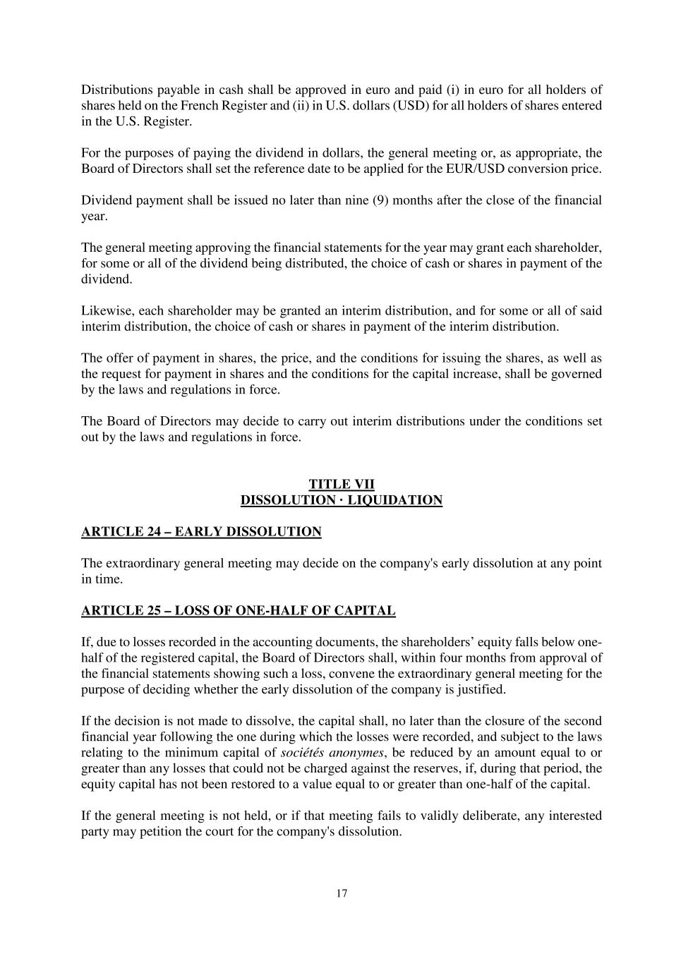 17 Distributions payable in cash shall be approved in euro and paid (i) in euro for all holders of shares held on the French Register and (ii) in U.S. dollars (USD) for all holders of shares entered in the U.S. Register. For the purposes of paying the dividend in dollars, the general meeting or, as appropriate, the Board of Directors shall set the reference date to be applied for the EUR/USD conversion price. Dividend payment shall be issued no later than nine (9) months after the close of the financial year. The general meeting approving the financial statements for the year may grant each shareholder, for some or all of the dividend being distributed, the choice of cash or shares in payment of the dividend. Likewise, each shareholder may be granted an interim distribution, and for some or all of said interim distribution, the choice of cash or shares in payment of the interim distribution. The offer of payment in shares, the price, and the conditions for issuing the shares, as well as the request for payment in shares and the conditions for the capital increase, shall be governed by the laws and regulations in force. The Board of Directors may decide to carry out interim distributions under the conditions set out by the laws and regulations in force. TITLE VII DISSOLUTION · LIQUIDATION ARTICLE 24 – EARLY DISSOLUTION The extraordinary general meeting may decide on the company's early dissolution at any point in time. ARTICLE 25 – LOSS OF ONE-HALF OF CAPITAL If, due to losses recorded in the accounting documents, the shareholders’ equity falls below one- half of the registered capital, the Board of Directors shall, within four months from approval of the financial statements showing such a loss, convene the extraordinary general meeting for the purpose of deciding whether the early dissolution of the company is justified. If the decision is not made to dissolve, the capital shall, no later than the closure of the second financial year following the one during which the losses were recorded, and subject to the laws relating to the minimum capital of sociétés anonymes, be reduced by an amount equal to or greater than any losses that could not be charged against the reserves, if, during that period, the equity capital has not been restored to a value equal to or greater than one-half of the capital. If the general meeting is not held, or if that meeting fails to validly deliberate, any interested party may petition the court for the company's dissolution.