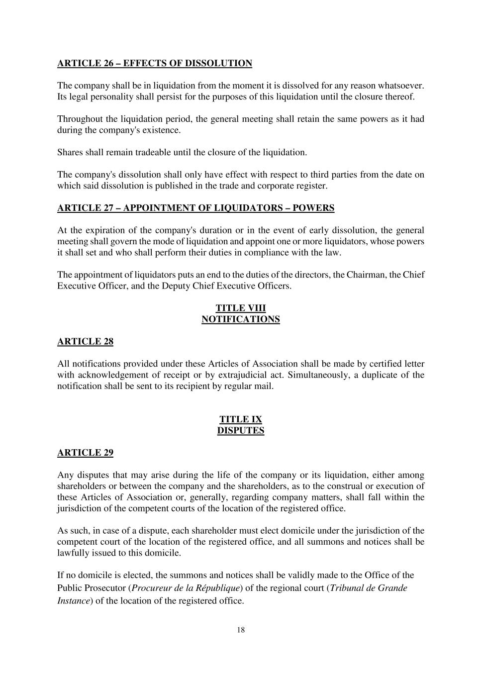 18 ARTICLE 26 – EFFECTS OF DISSOLUTION The company shall be in liquidation from the moment it is dissolved for any reason whatsoever. Its legal personality shall persist for the purposes of this liquidation until the closure thereof. Throughout the liquidation period, the general meeting shall retain the same powers as it had during the company's existence. Shares shall remain tradeable until the closure of the liquidation. The company's dissolution shall only have effect with respect to third parties from the date on which said dissolution is published in the trade and corporate register. ARTICLE 27 – APPOINTMENT OF LIQUIDATORS – POWERS At the expiration of the company's duration or in the event of early dissolution, the general meeting shall govern the mode of liquidation and appoint one or more liquidators, whose powers it shall set and who shall perform their duties in compliance with the law. The appointment of liquidators puts an end to the duties of the directors, the Chairman, the Chief Executive Officer, and the Deputy Chief Executive Officers. TITLE VIII NOTIFICATIONS ARTICLE 28 All notifications provided under these Articles of Association shall be made by certified letter with acknowledgement of receipt or by extrajudicial act. Simultaneously, a duplicate of the notification shall be sent to its recipient by regular mail. TITLE IX DISPUTES ARTICLE 29 Any disputes that may arise during the life of the company or its liquidation, either among shareholders or between the company and the shareholders, as to the construal or execution of these Articles of Association or, generally, regarding company matters, shall fall within the jurisdiction of the competent courts of the location of the registered office. As such, in case of a dispute, each shareholder must elect domicile under the jurisdiction of the competent court of the location of the registered office, and all summons and notices shall be lawfully issued to this domicile. If no domicile is elected, the summons and notices shall be validly made to the Office of the Public Prosecutor (Procureur de la République) of the regional court (Tribunal de Grande Instance) of the location of the registered office.