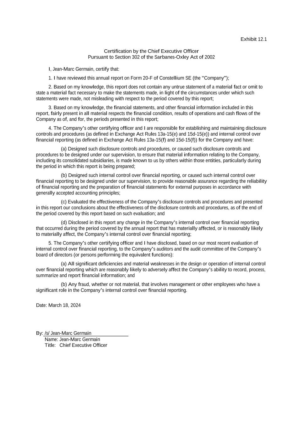 Exhibit 12.1 Certification by the Chief Executive Officer Pursuant to Section 302 of the Sarbanes-Oxley Act of 2002 I, Jean-Marc Germain, certify that: 1. I have reviewed this annual report on Form 20-F of Constellium SE (the “Company”); 2. Based on my knowledge, this report does not contain any untrue statement of a material fact or omit to state a material fact necessary to make the statements made, in light of the circumstances under which such statements were made, not misleading with respect to the period covered by this report; 3. Based on my knowledge, the financial statements, and other financial information included in this report, fairly present in all material respects the financial condition, results of operations and cash flows of the Company as of, and for, the periods presented in this report; 4. The Company’s other certifying officer and I are responsible for establishing and maintaining disclosure controls and procedures (as defined in Exchange Act Rules 13a-15(e) and 15d-15(e)) and internal control over financial reporting (as defined in Exchange Act Rules 13a-15(f) and 15d-15(f)) for the Company and have: (a) Designed such disclosure controls and procedures, or caused such disclosure controls and procedures to be designed under our supervision, to ensure that material information relating to the Company, including its consolidated subsidiaries, is made known to us by others within those entities, particularly during the period in which this report is being prepared; (b) Designed such internal control over financial reporting, or caused such internal control over financial reporting to be designed under our supervision, to provide reasonable assurance regarding the reliability of financial reporting and the preparation of financial statements for external purposes in accordance with generally accepted accounting principles; (c) Evaluated the effectiveness of the Company’s disclosure controls and procedures and presented in this report our conclusions about the effectiveness of the disclosure controls and procedures, as of the end of the period covered by this report based on such evaluation; and (d) Disclosed in this report any change in the Company’s internal control over financial reporting that occurred during the period covered by the annual report that has materially affected, or is reasonably likely to materially affect, the Company’s internal control over financial reporting; 5. The Company’s other certifying officer and I have disclosed, based on our most recent evaluation of internal control over financial reporting, to the Company’s auditors and the audit committee of the Company’s board of directors (or persons performing the equivalent functions): (a) All significant deficiencies and material weaknesses in the design or operation of internal control over financial reporting which are reasonably likely to adversely affect the Company’s ability to record, process, summarize and report financial information; and (b) Any fraud, whether or not material, that involves management or other employees who have a significant role in the Company’s internal control over financial reporting. Date: March 18, 2024 By: /s/ Jean-Marc Germain Name: Jean-Marc Germain Title: Chief Executive Officer