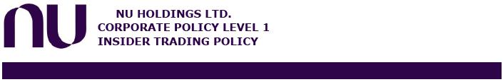 In order to take an active role in the prevention of insider trading violations by officers, directors, employees and interns ("Nubankers[1]") and other potential insiders of Nu Holdings Ltd. and its controlled affiliates (collectively, the "Company"), the Company has adopted this Insider Trading Policy (the “Policy”).