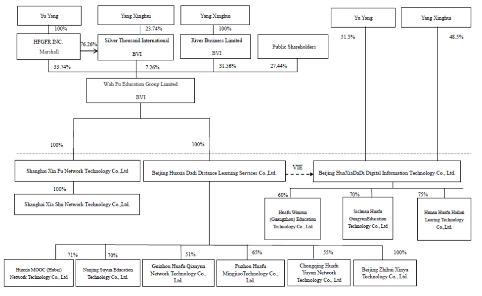 Wah Fu Education Group Ltd. is a British Virgin Islands holding company and currently conducts substantially all of our business operations in the PRC through our wholly foreign owned entities (“WFOEs”) incorporated in the PRC and certain business operations through the PRC consolidated variable interest entity (“VIE”) as a subsidiary of our WFOE. Due to PRC legal restrictions on foreign ownership and investment in the value-added telecommunications market, we rely on a series of contractual arrangements among VIE and its shareholders to operate our online and mobile platforms in China. These contractual arrangements entered into with the VIE allow us to (i) exercise effective control over the VIE, (ii) receive substantially all of the economic benefits of the VIE, and (iii) have an exclusive option to purchase all or part of the equity interests in the VIE when and to the extent permitted by PRC law. These contractual arrangements include exclusive business cooperation agreement, exclusive option agreement, equity interest pledge agreement, power of attorney, as the case may be. As a result of these contractual arrangements, we exert effective control over, and are considered the primary beneficiary of, the VIE and consolidate its operating results in our financial statements under U.S. GAAP. As used in this annual report, unless otherwise indicated, “we,” “us,” “our,” the “Company,” “Wah Fu” or similar terms refer to Wah Fu Education Group Limited, a company organized in the British Virgin Islands and/or its consolidated subsidiaries, other than the variable interest entity, Beijing Huaxia Dadi Digital Information Technology Co. (“Beijing Digital Information”), a PRC company, and its subsidiaries, unless the context otherwise indicates; and “VIE” refers respectively to the variable interest entity and its subsidiaries, Huafu Wanrun (Guangzhou) Education Technology, Sichuan Huafu Gengyun Education Technology Co., Ltd., and Hunan Huafu Haihui Learning Technology Co., Ltd.