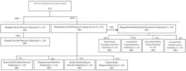 Wah Fu Education Group Ltd. is a British Virgin Islands holding company and currently conducts substantially all of our business operations in the PRC through our subsidiaries incorporated in the PRC, and our PRC consolidated variable interest entity (“VIE”). Due to PRC legal restrictions on foreign ownership and investment in the value-added telecommunications market, we rely on a series of contractual arrangements among VIE and its shareholders to operate our online and mobile platforms in China. These contractual arrangements entered into with the VIE allow us to (i) exercise effective control over the VIE, (ii) receive substantially all of the economic benefits of the VIE, and (iii) have an exclusive option to purchase all or part of the equity interests in the VIE when and to the extent permitted by PRC law. These contractual arrangements include exclusive business cooperation agreement, exclusive option agreement, equity interest pledge agreement, power of attorney, as the case may be. As a result of these contractual arrangements, we exert effective control over, and are considered the primary beneficiary of, the VIE and consolidate its operating results in our financial statements under U.S. GAAP. As used in this annual report, “we,” “us,” “our company,” “our,” or “Wah Fu” refers to Wah Fu Education Group Ltd., and, in the context of describing our consolidated financial information, business operations and operating data, our consolidated VIE, “variable interest entities” or “VIE” refers to Beijing HuaXiaDadi Digital Information Technology Co., Ltd. (“Beijing Digital Information”)