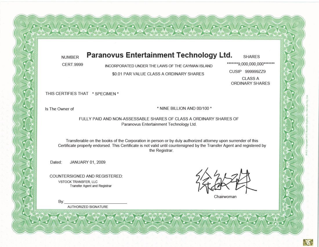 EX-2.1 3 pavs_ex21.htm SPECIMEN CERTIFICATE pavs_ex21.htm