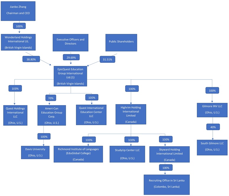In this Annual Report on Form 20-F (the “Annual Report”), unless otherwise indicated, “we,” “us,” “our,” “EpicQuest Education,” “EpicQuest,” and “Company” refers to EpicQuest Education Group International Limited, a British Virgin Islands (“BVI”) company, and its subsidiaries, including Quest Holdings International LLC, an Ohio limited liability company (“QHI”); Quest International Education Center LLC, an Ohio limited liability company (“QIE”); Ameri-Can Education Group Corp., an Ohio corporation (“Ameri-Can”); Davis College Inc. (d.b.a. Davis University), an Ohio limited liability company (“Davis University,” “Davis,” or “DU”); Study Up Center LLC, an Ohio limited liability company (“SUPC”); Gilmore INV LLC, an Ohio limited liability company (“Gilmore”); SouthGilmore LLC, an Ohio limited liability company (“SouthGilmore”); Richmond Institute of Language Inc., a Canadian company, d.b.a. EduGlobal College (“RIL” or “EduGlobal College”); Highrim Holding International Limited, a Canadian company (“HHI”); and Skyward Holding International Limited, a Canadian company (“Skyward”).