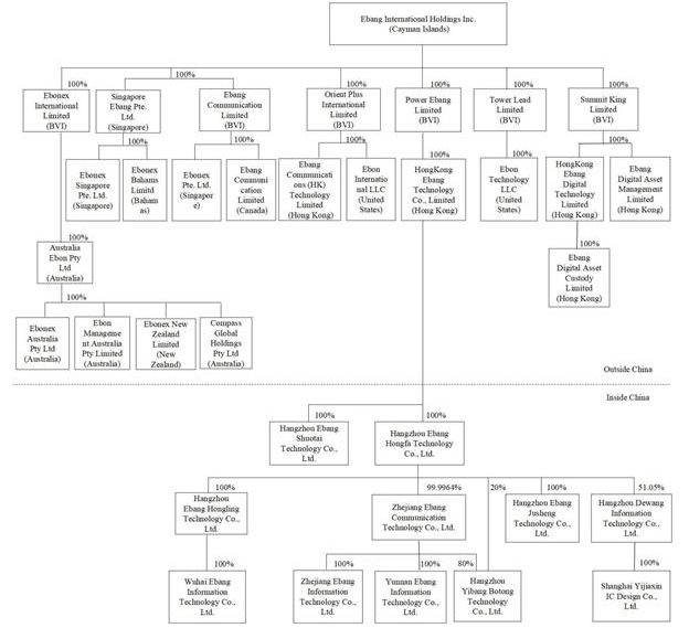 | ● | “operating subsidiaries” are to, for the purpose of this annual report, primarily, PRC operating subsidiaries, Ebonex Australia Pty Ltd (“Ebonex Australia”), Ebon Management Australia Pty Limited, Compass Global Holdings Pty Ltd, Ebang Communications (HK) Technology Limited (“HK Ebang Communications”) and HongKong Ebang Digital Technology Limited (“HK Ebang Digital”); |
