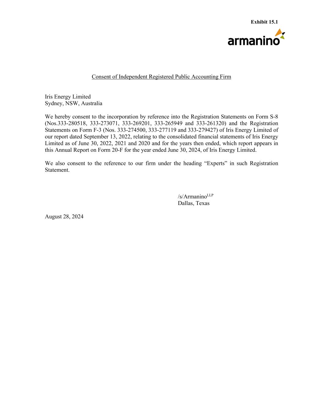 Exhibit 15.1 Consent of Independent Registered Public Accounting Firm Iris Energy Limited Sydney, NSW, Australia We hereby consent to the incorporation by reference into the Registration Statements on Form S-8 (Nos.333-280518, 333-273071, 333-269201, 333-265949 and 333-261320) and the Registration Statements on Form F-3 (Nos. 333-274500, 333-277119 and 333-279427) of Iris Energy Limited of our report dated September 13, 2022, relating to the consolidated financial statements of Iris Energy Limited as of June 30, 2022, 2021 and 2020 and for the years then ended, which report appears in this Annual Report on Form 20-F for the year ended June 30, 2024, of Iris Energy Limited. We also consent to the reference to our firm under the heading “Experts” in such Registration Statement. /s/ArmaninoLLP Dallas, Texas August 28, 2024