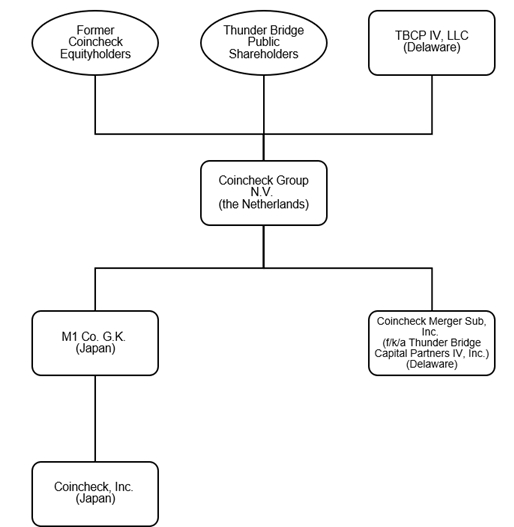 On December 10, 2024 (the “Closing Date”), Coincheck Group N.V., a Dutch public limited liability company (naamloze vennootschap) (“Coincheck Group” or “PubCo”), consummated the previously announced business combination pursuant to the Business Combination Agreement (the “Business Combination”), dated as of March 22, 2022, as amended from time to time (the “Business Combination Agreement”), by and among Thunder Bridge Capital Partners IV, Inc., a Delaware corporation (“Thunder Bridge”), Coincheck Group B.V., a Dutch private limited liability company (besloten vennootschap met beperkte aansprakelijkheid) (which was converted into a Dutch public limited liability company (naamloze vennootschap) and renamed Coincheck Group N.V. immediately prior to the Business Combination), M1 Co G.K., a Japanese limited liability company (godo kaisha) (“M1 GK”), Coincheck Merger Sub, Inc., a Delaware corporation and a wholly owned subsidiary of PubCo (“Merger Sub”) and Coincheck, Inc., a Japanese joint stock company (kabushiki kaisha) (“Coincheck”). Pursuant to the terms set forth in the Business Combination Agreement, (i) PubCo issued ordinary shares in its share capital (the “Ordinary Shares”) to M1 GK and, pursuant to a share exchange, M1 GK, at that time a wholly owned subsidiary of PubCo, exchanged all of its shares of PubCo for all of the outstanding common shares of Coincheck (the “Share Exchange”), resulting in Coincheck becoming a direct wholly owned subsidiary of M1 GK and an indirect wholly-owned subsidiary of PubCo. Immediately after giving effect to the Share Exchange, PubCo changed its legal form from a Dutch private limited liability company (besloten vennootschap met beperkte aansprakelijkheid) to a Dutch public limited liability company (naamloze vennootschap); (ii) Merger Sub merged with and into Thunder Bridge on the Closing Date, with Thunder Bridge continuing as the surviving corporation (the “Merger”); (iii) as a result of the Merger, each outstanding Thunder Bridge share sold as part of a unit in Thunder Bridge’s initial public offering (the “IPO” or “Thunder Bridge’s IPO”; each unit, a “Thunder Bridge Unit”; and each Thunder Bridge share, a “Thunder Bridge Public Share”), for the avoidance of doubt, not including any Thunder Bridge Shares held by TBCP IV, LLC, Thunder Bridge’s sponsor (the “Thunder Bridge Sponsor”), as of the date of the Business Combination Agreement (the “Sponsor Shares”), was exchanged for one Ordinary Share; (iv) as a result of the Merger, each Sponsor Share was exchanged for one Ordinary Share and (v) as a result of the Merger, each outstanding private warrant exercisable for Thunder Bridge shares (a “Thunder Bridge Private Warrant”) and each outstanding public warrant exercisable for Thunder Bridge shares sold as part of a unit in Thunder Bridge’s IPO (a “Thunder Bridge Public Warrant” and the Thunder Bridge Public Warrants together with the Private Warrants, the “Thunder Bridge Warrants”) became a warrant exercisable for such number of Ordinary Shares per Thunder Bridge Warrant that the holder thereof was entitled to acquire if such Thunder Bridge Warrant was exercised prior to the Business Combination (each such private and public warrant exercisable for Ordinary Shares, a “Private Warrant” and “Public Warrant,” respectively).