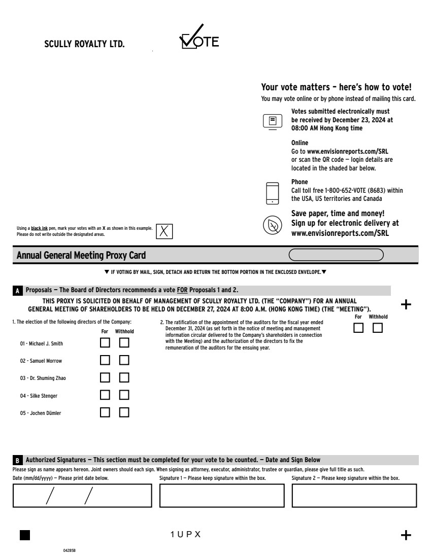 01 - Michael J. Smith 02 - Samuel Morrow 03 - Dr. Shuming Zhao 04 - Silke Stenger 05 - Jochen Dümler 2. The ratification of the appointment of the auditors for the fiscal year ended December 31, 2024 (as set forth in the notice of meeting and management information circular delivered to the Company’s shareholders in connection with the Meeting) and the authorization of the directors to fix the remuneration of the auditors for the ensuing year. 83; For Withhold For Withhold 1. The election of the following directors of the Company: SCULLY ROYALTY LTD. A Proposals — The Board of Directors recommends a vote FOR Proposals 1 and 2. 042B5B THIS PROXY IS SOLICITED ON BEHALF OF MANAGEMENT OF SCULLY ROYALTY LTD. (THE “COMPANY”) FOR AN ANNUAL GENERAL MEETING OF SHAREHOLDERS TO BE HELD ON DECEMBER 27, 2024 AT 8:00 A.M. (HONG KONG TIME) (THE “MEETING”). Please sign as name appears hereon. Joint owners should each sign. When signing as attorney, executor, administrator, trustee or guardian, please give full title as such. Date (mm/dd/yyyy) — Please print date below. Signature 1 — Please keep signature within the box. Signature 2 — Please keep signature within the box. B Authorized Signatures — This section must be completed for your vote to be counted. — Date and Sign Below Annual General Meeting Proxy Card Using a black ink pen, mark your votes with an X as shown in this example. Please do not write outside the designated areas. T IF VOTING BY MAIL, SIGN, DETACH AND RETURN THE BOTTOM PORTION IN THE ENCLOSED ENVELOPE.T You may vote online or by phone instead of mailing this card. Online Go to www.envisionreports.com/SRL or scan the QR code — login details are located in the shaded bar below. Your vote matters – here’s how to vote! Votes submitted electronically must be received by December 23, 2024 at 08:00 AM Hong Kong time Save paper, time and money! Sign up for electronic delivery at www.envisionreports.com/SRL Phone Call toll free 1-800-652-VOTE (8683) within the USA, US territories and Canada