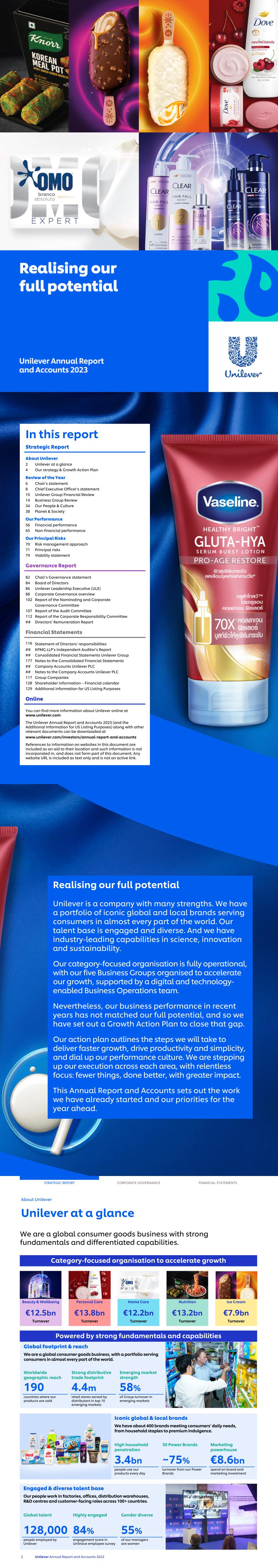 In this report Strategic Report About Unilever 2 Unilever at a glance 4 Our strategy & Growth Action Plan Review of the Year 6 Chair’s statement 8 Chief Executive Officer’s statement 10 Unilever Group Financial Review 14 Business Group Review 34 Our People & Culture 38 Planet & Society Our Performance 56 Financial performance 65 Non-financial performance Our Principal Risks 70 Risk management approach 71 Principal risks 79 Viability statement Governance Report 82 Chair’s Governance statement 84 Board of Directors 86 Unilever Leadership Executive (ULE) 88 Corporate Governance overview 102 Report of the Nominating and Corporate Governance Committee 107 Report of the Audit Committee 112 Report of the Corporate Responsibility Committee ## Directors’ Remuneration Report Financial Statements 116 Statement of Directors’ responsibilities ## KPMG LLP’s Independent Auditor’s Report ## Consolidated Financial Statements Unilever Group 177 Notes to the Consolidated Financial Statements ## Company Accounts Unilever PLC ## Notes to the Company Accounts Unilever PLC 117 Group Companies 128 Shareholder information – Financial calendar 129 Additional Information for US Listing Purposes Online You can find more information about Unilever online at www.unilever.com The Unilever Annual Report and Accounts 2023 (and the Additional Information for US Listing Purposes) along with other relevant documents can be downloaded at www.unilever.com/investors/annual-report-and-accounts References to information on websites in this document are included as an aid to their location and such information is not incorporated in, and does not form part of this document. Any website URL is included as text only and is not an active link. Realising our full potential Unilever is a company with many strengths. We have a portfolio of iconic global and local brands serving consumers in almost every part of the world. Our talent base is engaged and diverse. And we have industry-leading capabilities in science, innovation and sustainability. Our category-focused organisation is fully operational, with our five Business Groups organised to accelerate our growth, supported by a digital and technology- enabled Business Operations team. Nevertheless, our business performance in recent years has not matched our full potential, and so we have set out a Growth Action Plan to close that gap. Our action plan outlines the steps we will take to deliver faster growth, drive productivity and simplicity, and dial up our performance culture. We are stepping up our execution across each area, with relentless focus: fewer things, done better, with greater impact. This Annual Report and Accounts sets out the work we have already started and our priorities for the year ahead. Category-focused organisation to accelerate growth Beauty & Wellbeing Personal Care Home Care Nutrition Ice Cream €12.5bn €13.8bn €12.2bn €13.2bn €7.9bn Turnover Turnover Turnover Turnover Turnover Powered by strong fundamentals and capabilities STRATEGIC REPORT CORPORATE GOVERNANCE FINANCIAL STATEMENTS About Unilever Unilever at a glance 2 Unilever Annual Report and Accounts 2023 We are a global consumer goods business with strong fundamentals and differentiated capabilities. Global footprint & reach We are a global consumer goods business, with a portfolio serving consumers in almost every part of the world. Worldwide geographic reach Strong distributive trade footprint Emerging market strength 190 4.4m 58% countries where our products are sold retail stores served by distributors in top 10 emerging markets of Group turnover in emerging markets Iconic global & local brands We have about 400 brands meeting consumers’ daily needs, from household staples to premium indulgence. High household penetration 30 Power Brands Marketing powerhouse 3.4bn ~75% €8.6bn people use our products every day turnover from our Power Brands spend on brand and marketing investment Engaged & diverse talent base Our people work in factories, offices, distribution warehouses, R&D centres and customer-facing roles across 100+ countries. Global talent Highly engaged Gender diverse 128,000 84% 55% people employed by Unilever engagement score in UniVoice employee survey of our managers are women