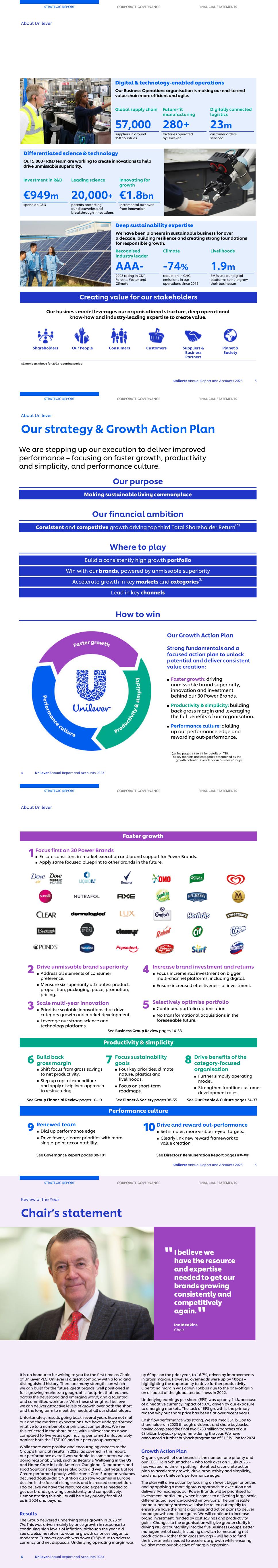 Digital & technology-enabled operations Our Business Operations organisation is making our end-to-end value chain more efficient and agile. Global supply chain Future-fit manufacturing Digitally connected logistics 57,000 280+ 23m suppliers in around 150 countries factories operated by Unilever customer orders serviced Differentiated science & technology Our 5,000+ R&D team are working to create innovations to help drive unmissable superiority. Investment in R&D Leading science Innovating for growth €949m 20,000+ €1.8bn spend on R&D patents protecting our discoveries and breakthrough innovations incremental turnover from innovation Deep sustainability expertise We have been pioneers in sustainable business for over a decade, building resilience and creating strong foundations for responsible growth. Recognised industry leader Climate Livelihoods AAA- -74% 1.9m 2023 rating in CDP Forests, Water and Climate reduction in GHG emissions in our operations since 2015 SMEs use our digital platforms to help grow their businesses Creating value for our stakeholders Our business model leverages our organisational structure, deep operational know-how and industry-leading expertise to create value. Shareholders Our People Consumers Customers Suppliers & Business Partners Planet & Society All numbers above for 2023 reporting period STRATEGIC REPORT CORPORATE GOVERNANCE FINANCIAL STATEMENTS About Unilever Unilever Annual Report and Accounts 2023 3 STRATEGIC REPORT CORPORATE GOVERNANCE FINANCIAL STATEMENTS About Unilever Our strategy & Growth Action Plan 4 Unilever Annual Report and Accounts 2023 We are stepping up our execution to deliver improved performance – focusing on faster growth, productivity and simplicity, and performance culture. Our purpose Making sustainable living commonplace Our financial ambition Consistent and competitive growth driving top third Total Shareholder Return(a) Where to play Build a consistently high growth portfolio Win with our brands, powered by unmissable superiority Accelerate growth in key markets and categories(b) Lead in key channels How to win Our Growth Action Plan Strong fundamentals and a focused action plan to unlock potential and deliver consistent value creation: ■ Faster growth: driving unmissable brand superiority, innovation and investment behind our 30 Power Brands. ■ Productivity & simplicity: building back gross margin and leveraging the full benefits of our organisation. ■ Performance culture: dialling up our performance edge and rewarding out-performance. (a) See pages ## to ## for details on TSR. (b) Key markets and categories determined by the growth potential in each of our Business Groups. STRATEGIC REPORT CORPORATE GOVERNANCE FINANCIAL STATEMENTS About Unilever Unilever Annual Report and Accounts 2023 5 1Focus first on 30 Power Brands ■ Ensure consistent in-market execution and brand support for Power Brands. ■ Apply same focused blueprint to other brands in the future. 2 Drive unmissable brand superiority ■ Address all elements of consumer preference. ■ Measure six superiority attributes: product, proposition, packaging, place, promotion, pricing. 3 Scale multi-year innovation ■ Prioritise scalable innovations that drive category growth and market development. ■ Leverage our strong science and technology platforms. Productivity & simplicity 6 Build back gross margin ■ Shift focus from gross savings to net productivity. ■ Step up capital expenditure and apply disciplined approach to restructuring. 7 Focus sustainability goals ■ Four key priorities: climate, nature, plastics and livelihoods. ■ Focus on short-term roadmaps. 8 Drive benefits of the category-focused organisation ■ Further simplify operating model. ■ Strengthen frontline customer development roles. 4 Increase brand investment and returns ■ Focus incremental investment on bigger multi-channel platforms, including digital. ■ Ensure increased effectiveness of investment. 5 Selectively optimise portfolio ■ Continued portfolio optimisation. ■ No transformational acquisitions in the foreseeable future. Performance culture 9 Renewed team ■ Dial up performance edge. ■ Drive fewer, clearer priorities with more single-point accountability. 10 Drive and reward out-performance ■ Set simpler, more visible in-year targets. ■ Clearly link new reward framework to value creation. See Business Group Review pages 14-33 See Group Financial Review pages 10-13 See Planet & Society pages 38-55 See Our People & Culture pages 34-37 See Governance Report pages 88-101 See Directors' Remuneration Report pages ##-## Faster growth It is an honour to be writing to you for the first time as Chair of Unilever PLC. Unilever is a great company with a long and distinguished history. There are many strengths on which we can build for the future: great brands, well positioned in fast-growing markets; a geographic footprint that reaches across the developed and emerging world; and a talented and committed workforce. With these strengths, I believe we can deliver attractive levels of growth over both the short and the long term to meet the needs of all our stakeholders. Unfortunately, results going back several years have not met our and the markets' expectations. We have underperformed relative to a number of our principal competitors. We see this reflected in the share price, with Unilever shares down compared to five years ago, having performed unfavourably against both the FTSE100 and our peer group average. While there were positive and encouraging aspects to the Group’s financial results in 2023, as covered in this report, our performance overall was variable. In some areas we are doing reasonably well, such as Beauty & Wellbeing in the US and Home Care in Latin America. Our global Deodorants and Food Solutions businesses also both did well last year. But Ice Cream performed poorly, while Home Care European volumes declined double-digit. Nutrition a