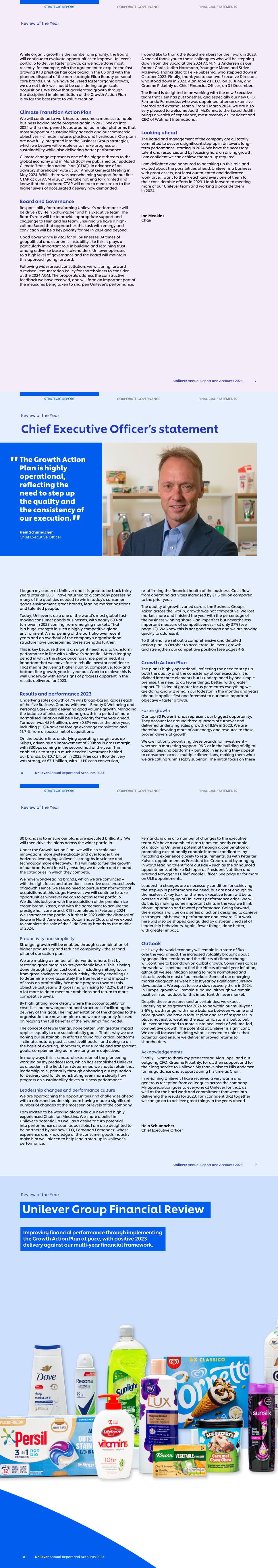 While organic growth is the number one priority, the Board will continue to evaluate opportunities to improve Unilever’s portfolio to deliver faster growth, as we have done most recently, for example, with the agreement to acquire the fast- growing K18 prestige hair care brand in the US and with the planned disposal of the non-strategic Elida Beauty personal care brands. Until we have delivered faster organic growth, we do not think we should be considering large-scale acquisitions. We know that accelerated growth through the disciplined implementation of the Growth Action Plan is by far the best route to value creation. Climate Transition Action Plan We will continue to work hard to become a more sustainable business having made progress again in 2023. We go into 2024 with a sharpened focus around four major platforms that most support our sustainability agenda and our commercial objectives – climate, nature, plastics and livelihoods. Our plans are now fully integrated into the Business Group strategies, which we believe will enable us to make progress on sustainability while also delivering better performance. Climate change represents one of the biggest threats to the global economy and in March 2024 we published our updated Climate Transition Action Plan (CTAP), in advance of an advisory shareholder vote at our Annual General Meeting in May 2024. While there was overwhelming support for our first CTAP at our AGM in 2021, we take nothing for granted and know that the updated CTAP will need to measure up to the higher levels of accelerated delivery now demanded. Board and Governance Responsibility for transforming Unilever’s performance will be driven by Hein Schumacher and his Executive team. The Board’s role will be to provide appropriate support and challenge to Hein and his team. Ensuring we have a high- calibre Board that approaches this task with energy and conviction will be a key priority for me in 2024 and beyond. Good governance is vital for all businesses. At times of geopolitical and economic instability like this, it plays a particularly important role in building and retaining trust among a diverse base of stakeholders. Unilever operates to a high level of governance and the Board will maintain this approach going forward. Following widespread consultation, we will bring forward a revised Remuneration Policy for shareholders to consider at the 2024 AGM. The proposals address the constructive feedback we have received, and will form an important part of the measures being taken to sharpen Unilever’s performance. I would like to thank the Board members for their work in 2023. A special thank you to those colleagues who will be stepping down from the Board at the 2024 AGM: Nils Andersen as our former Chair, Judith Hartmann, Youngme Moon and Strive Masiyiwa. Thanks also to Feike Sijbesma, who stepped down in October 2023. Finally, thank you to our two Executive Directors who stood down in 2023: Alan Jope as CEO, on 30 June, and Graeme Pitkethly as Chief Financial Officer, on 31 December. The Board is delighted to be working with the new Executive team that Hein has put together, and especially our new CFO, Fernando Fernandez, who was appointed after an extensive internal and external search. From 1 March 2024, we are also very pleased to welcome Judith McKenna to the Board. Judith brings a wealth of experience, most recently as President and CEO of Walmart International. Looking ahead The Board and management of the company are all totally committed to deliver a significant step-up in Unilever’s long- term performance, starting in 2024. We have the necessary talent and resources and by focusing hard on driving growth, I am confident we can achieve the step-up required. I am delighted and honoured to be taking up this role and excited about the possibilities ahead. Unilever is a business with great assets, not least our talented and dedicated workforce. I want to thank each and every one of them for their considerable efforts in 2023. I look forward to meeting more of our Unilever team and working alongside them in 2024. Ian Meakins Chair STRATEGIC REPORT CORPORATE GOVERNANCE FINANCIAL STATEMENTS Review of the Year Unilever Annual Report and Accounts 2023 7 I began my career at Unilever and it is great to be back thirty years later as CEO. I have returned to a company possessing many of the qualities needed to win in today’s consumer goods environment: great brands, leading market positions and talented people. Today, Unilever is also one of the world’s most global fast- moving consumer goods businesses, with nearly 60% of turnover in 2023 coming from emerging markets. That is a huge strength in such a highly competitive global environment. A sharpening of the portfolio over recent years and an overhaul of the company’s organisational structure have underpinned these strengths further. This is key because there is an urgent need now to transform performance in line with Unilever’s potential. After a lengthy period in which the share price has underperformed, it is important that we move fast to rebuild investor confidence. That means delivering higher quality, competitive, top- and bottom-line growth, year in, year out. Work to achieve this is well underway with early signs of progress apparent in the results delivered for 2023. Results and performance 2023 Underlying sales growth of 7% was broad-based, across each of the five Business Groups, with two – Beauty & Wellbeing and Personal Care – also delivering good volume growth. Managing the balance of price and volume growth in a period of more normalised inflation will be a key priority for the year ahead. Turnover was €59.6 billion, down (0.8)% versus the prior year, including (5.7)% adverse foreign exchange translation and (1.7)% from disposals net of acquisitions. On the bottom line, underlying operating margin was up 60bps, driven by an improvement of 200bps in gross margin, 