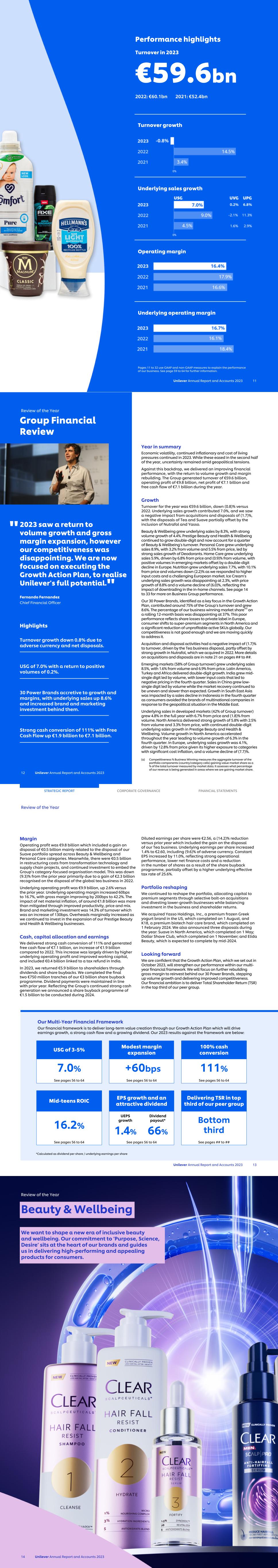 Unilever Annual Report and Accounts 2023 11 Performance highlights Turnover in 2023 €59.6bn 2022: €60.1bn 2021: €52.4bn Turnover growth Underlying sales growth Operating margin Underlying operating margin Pages 11 to 32 use GAAP and non-GAAP measures to explain the performance of our business. See page 59 to 64 for further information. 2023 saw a return to volume growth and gross margin expansion, however our competitiveness was disappointing. We are now focused on executing the Growth Action Plan, to realise Unilever's full potential. Fernando Fernandez Chief Financial Officer Highlights Turnover growth down 0.8% due to adverse currency and net disposals. USG of 7.0% with a return to positive volumes of 0.2%. 30 Power Brands accretive to growth and margins, with underlying sales up 8.6% and increased brand and marketing investment behind them. Strong cash conversion of 111% with Free Cash Flow up €1.9 billion to €7.1 billion. Year in summary Economic volatility, continued inflationary and cost of living pressures continued in 2023. While these eased in the second half of the year, uncertainty remained amid geopolitical tensions. Against this backdrop, we delivered an improving financial performance, with the return to volume growth and margin rebuilding. The Group generated turnover of €59.6 billion, operating profit of €9.8 billion, net profit of €7.1 billion and free cash flow of €7.1 billion during the year. Growth Turnover for the year was €59.6 billion, down (0.8)% versus 2022. Underlying sales growth contributed 7.0%, and we saw a negative impact from acquisitions and disposals of (1.7)%, with the disposals of Tea and Suave partially offset by the inclusion of Nutrafol and Yasso. Beauty & Wellbeing grew underlying sales by 8.3%, with strong volume growth of 4.4%. Prestige Beauty and Health & Wellbeing continued to grow double-digit and now account for a quarter of Beauty & Wellbeing’s turnover. Personal Care grew underlying sales 8.9%, with 3.2% from volume and 5.5% from price, led by strong sales growth of Deodorants. Home Care grew underlying sales 5.9%, driven by 6.8% from price and (0.9)% from volume, with positive volumes in emerging markets offset by a double-digit decline in Europe. Nutrition grew underlying sales 7.7%, with 10.1% from price and volumes down (2.2)% as we responded to higher input costs and a challenging European market. Ice Cream’s underlying sales growth was disappointing at 2.3%, with price growth of 8.8% and a volume decline of (6.0)%, reflecting the impact of downtrading in the in-home channels. See page 14 to 33 for more on Business Group performance. Our 30 Power Brands, identified as a key focus in the Growth Action Plan, contributed around 75% of the Group’s turnover and grew 8.6%. The percentage of our business winning market share(a) on a rolling 12-month basis was disappointing at 37%. This poor performance reflects share losses to private label in Europe, consumer shifts to super-premium segments in North America and a significant reduction of unprofitable active SKUs globally. Our competitiveness is not good enough and we are moving quickly to address it. Acquisition and disposal activities had a negative impact of (1.7)% to turnover, driven by the Tea business disposal, partly offset by strong growth in Nutrafol, which we acquired in 2022. More details on acquisitions and disposals are in note 21 on pages ## to ##. Emerging markets (58% of Group turnover) grew underlying sales 8.5%, with 1.6% from volume and 6.9% from price. Latin America, Turkey and Africa delivered double-digit growth. India grew mid- single digit led by volume, with lower input costs that led to negative pricing in the fourth quarter. Sales in China grew low- single digit led by volume while the market recovery continued to be uneven and slower than expected. Growth in South East Asia was impacted by a sales decline in Indonesia in the fourth quarter as consumers avoided the brands of multinational companies in response to the geopolitical situation in the Middle East. Underlying sales in developed markets (42% of Group turnover) grew 4.8% in the full year with 6.7% from price and (1.8)% from volume. North America delivered strong growth of 5.8% with 2.5% from volume and 3.3% from price, with continued double-digit underlying sales growth in Prestige Beauty and Health & Wellbeing. Volume growth in North America accelerated throughout the year leading to volume growth of 6.3% in the fourth quarter. In Europe, underlying sales growth was 4.1%, driven by 12.8% from price given its higher exposure to categories with significant cost inflation, and a volume decline of (7.7)%. Review of the Year 12 Unilever Annual Report and Accounts 2023 " " Group Financial Review (a) Competitiveness % Business Winning measures the aggregate turnover of the portfolio components (country/category cells) gaining value market share as a % of the total turnover measured by market data. It assesses what percentage of our revenue is being generated in areas where we are gaining market share. Margin Operating profit was €9.8 billion which included a gain on disposal of €0.5 billion mainly related to the disposal of our Suave portfolio spread across Beauty & Wellbeing and Personal Care categories. Meanwhile, there were €0.5 billion in restructuring costs from transformation technology and supply chain projects, and continued investment to embed the Group’s category-focused organisation model. This was down (9.3)% from the prior year primarily due to a gain of €2.3 billion recognised on the disposal of the global tea business in 2022. Underlying operating profit was €9.9 billion, up 2.6% versus the prior year. Underlying operating margin increased 60bps to 16.7%, with gross margin improving by 200bps to 42.2%. The impact of net material inflation, of around €1.8 billion was more than mitigated through improved productivity, price and mix. Bra