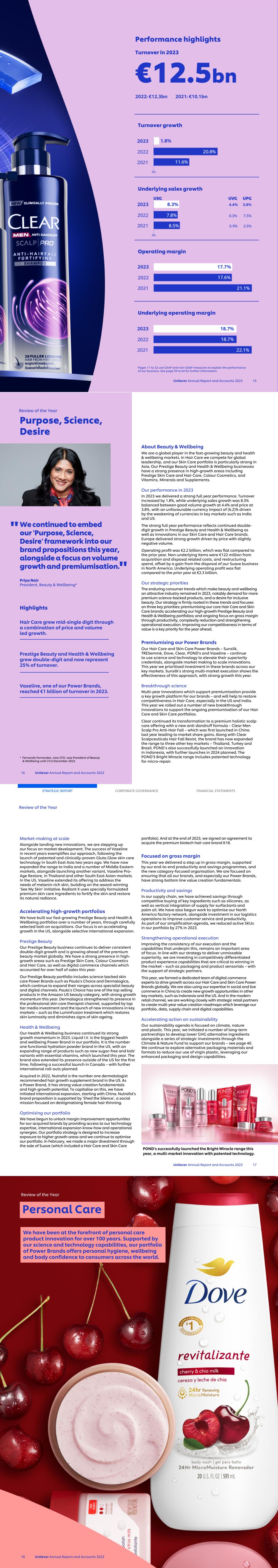 Unilever Annual Report and Accounts 2023 15 Performance highlights Turnover in 2023 €12.5bn 2022: €12.3bn 2021: €10.1bn Turnover growth Underlying sales growth Operating margin Underlying operating margin Pages 11 to 32 use GAAP and non-GAAP measures to explain the performance of our business. See page 59 to 64 for further information. We continued to embed our 'Purpose, Science, Desire' framework into our brand propositions this year, alongside a focus on volume growth and premiumisation. Priya Nair President, Beauty & Wellbeing* Highlights Hair Care grew mid-single digit through a combination of price and volume led growth. Prestige Beauty and Health & Wellbeing grew double-digit and now represent 25% of turnover. Vaseline, one of our Power Brands, reached €1 billion of turnover in 2023. * Fernando Fernandez, now CFO, was President of Beauty & Wellbeing until 31st December 2023. About Beauty & Wellbeing We are a global player in the fast-growing beauty and health & wellbeing markets. In Hair Care we compete for global leadership, and our Skin Care portfolio is particularly strong in Asia. Our Prestige Beauty and Health & Wellbeing businesses have a strong presence in high-growth areas including Prestige Skin Care and Hair Care, Colour Cosmetics, and Vitamins, Minerals and Supplements. Our performance in 2023 In 2023 we delivered a strong full year performance. Turnover increased by 1.8%, while underlying sales growth was 8.3% balanced between good volume growth at 4.4% and price at 3.8%, with an unfavourable currency impact of (6.2)% driven by the weakening of currencies in key markets such as India and US. The strong full year performance reflects continued double- digit growth in Prestige Beauty and Health & Wellbeing as well as innovations in our Skin Care and Hair Care brands. Europe delivered strong growth driven by price with slightly negative volume. Operating profit was €2.2 billion, which was flat compared to the prior year. Non-underlying items were €122 million from acquisition and disposal related costs, and restructuring spend, offset by a gain from the disposal of our Suave business in North America. Underlying operating profit was flat compared to the prior year at €2.3 billion. Our strategic priorities The enduring consumer trends which make beauty and wellbeing an attractive industry remained in 2023, notably demand for more premium science-backed products, and a desire for inclusive beauty. Our strategy is firmly rooted in these trends and focuses on three key priorities: premiumising our core Hair Care and Skin Care brands; accelerating our high-growth Prestige Beauty and Health & Wellbeing portfolios; and ongoing focus on gross margin through productivity, complexity reduction and strengthening operational execution. Improving our competitiveness in terms of value is a key priority for the year ahead. Premiumising our Power Brands Our Hair Care and Skin Care Power Brands – Sunsilk, TRESemmé, Dove, Clear, POND's and Vaseline – continue to use science and technology to elevate their superiority credentials, alongside market making to scale innovations. This year we prioritised investment in these brands across our key markets. Sunsilk’s strong multi-market execution shows the effectiveness of this approach, with strong growth this year. Breakthrough science Multi-year innovations which support premiumisation provide a key growth platform for our brands – and will help to restore competitiveness in Hair Care, especially in the US and India. This year we rolled out a number of new breakthrough innovations to support the ongoing premiumisation of our Hair Care and Skin Care portfolios. Clear continued its transformation to a premium holistic scalp care offering with a new anti-dandruff formula – Clear Men Scalp Pro Anti-Hair Fall – which was first launched in China last year leading to market share gains. Along with Clear Scalpceuticals Hair Fall Resist, the brand has now expanded the range to three other key markets – Thailand, Turkey and Brazil. POND’s also successfully launched an innovation in Indonesia, with further launches in 2024 planned. The POND'S Bright Miracle range includes patented technology for micro-repair. Review of the Year 16 Unilever Annual Report and Accounts 2023 Purpose, Science, Desire " " Market-making at scale Alongside landing new innovations, we are stepping up our focus on market development. The success of Vaseline in recent years exemplifies our approach, following the launch of patented and clinically-proven Gluta Glow skin care technology in South East Asia two years ago. We have now expanded the range to India and a number of Middle Eastern markets, alongside launching another variant, Vaseline Pro- Age Restore, in Thailand and other South East Asian markets. In the US, Vaseline extended its offering to address the needs of melanin-rich skin, building on the award-winning ‘See My Skin’ initiative. Radiant X uses specially formulated premium skin care ingredients to fortify the skin and restore its natural radiance. Accelerating high-growth portfolios We have built our fast-growing Prestige Beauty and Health & Wellbeing portfolios over a number of years, through carefully selected bolt-on acquisitions. Our focus is on accelerating growth in the US, alongside selective international expansion. Prestige Beauty Our Prestige Beauty business continues to deliver consistent double-digit growth and is growing ahead of the premium beauty market globally. We have a strong presence in high- growth areas such as Prestige Skin Care, Colour Cosmetics and Hair Care, as well as digital commerce channels which accounted for over half of sales this year. Our Prestige Beauty portfolio includes science-backed skin care Power Brands such as Paula’s Choice and Dermalogica, which continue to expand their ranges across specialist beauty and digital channels. Paula’s Choice has one of the top sel