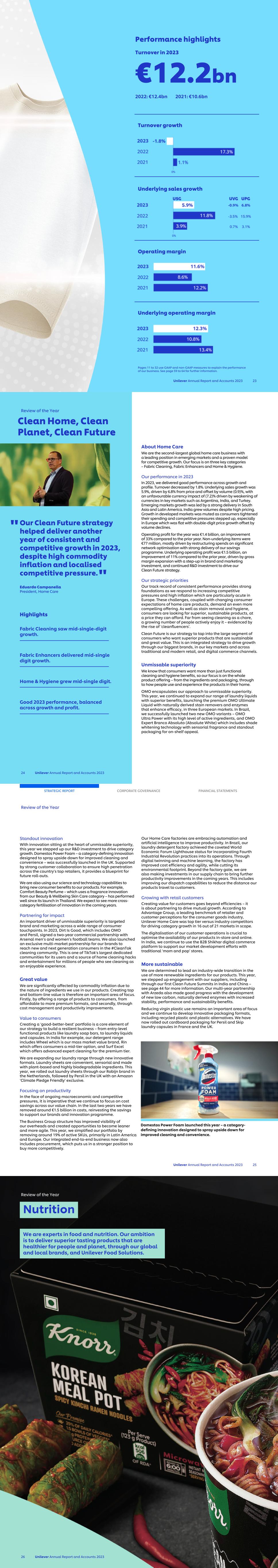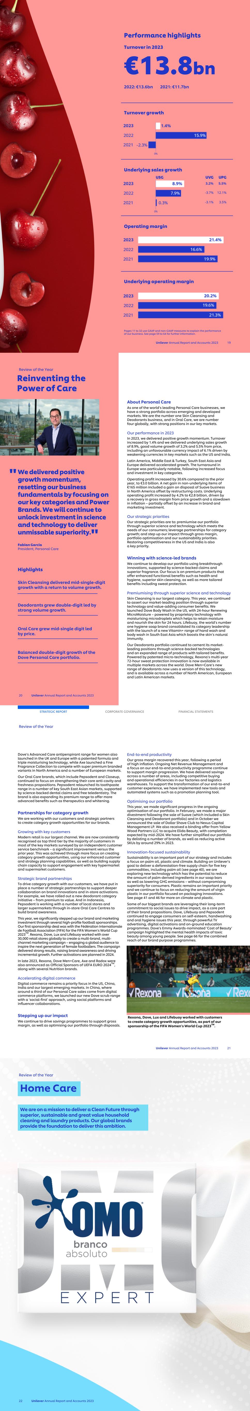 Unilever Annual Report and Accounts 2023 23 Performance highlights Turnover in 2023 €12.2bn 2022: €12.4bn 2021: €10.6bn Turnover growth Underlying sales growth Operating margin Underlying operating margin Pages 11 to 32 use GAAP and non-GAAP measures to explain the performance of our business. See page 59 to 64 for further information. Our Clean Future strategy helped deliver another year of consistent and competitive growth in 2023, despite high commodity inflation and localised competitive pressure. Eduardo Campanella President, Home Care Highlights Fabric Cleaning saw mid-single-digit growth. Fabric Enhancers delivered mid-single digit growth. Home & Hygiene grew mid-single digit. Good 2023 performance, balanced across growth and profit. About Home Care We are the second-largest global home care business with a leading position in emerging markets and a proven model for competitive growth. Our focus is on three key categories – Fabric Cleaning, Fabric Enhancers and Home & Hygiene. Our performance in 2023 In 2023, we delivered good performance across growth and profile. Turnover decreased by 1.8%. Underlying sales growth was 5.9%, driven by 6.8% from price and offset by volume (0.9)%, with an unfavourable currency impact of (7.2)% driven by weakening of currencies in key markets such as Argentina, India, and Turkey. Emerging markets growth was led by a strong delivery in South Asia and Latin America. India grew volumes despite high pricing. Growth in developed markets was muted as consumers tightened their spending and competitive pressures stepped up, especially in Europe which was flat with double-digit price growth offset by volume declines. Operating profit for the year was €1.4 billion, an improvement of 33% compared to the prior year. Non-underlying items were €77 million, mostly driven by restructuring spends on significant network optimisation with strong delivery of our savings programme. Underlying operating profit was €1.5 billion, an improvement of 11% compared to the prior year, driven by gross margin expansion with a step-up in brand and marketing investment, and continued R&D investment to drive our Clean Future strategy. Our strategic priorities Our track record of consistent performance provides strong foundations as we respond to increasing competitive pressures and high inflation which are particularly acute in Europe. These challenges, coupled with changing consumer expectations of home care products, demand an even more compelling offering. As well as stain removal and hygiene, consumers are looking for superior, sustainable products, at a price they can afford. Far from seeing cleaning as a chore, a growing number of people actively enjoy it – evidenced by the rise of ‘cleanfluencers’. Clean Future is our strategy to tap into the large segment of consumers who want superior products that are sustainable and great value. This is an integrated strategy to drive growth through our biggest brands, in our key markets and across traditional and modern retail, and digital commerce channels. Unmissable superiority We know that consumers want more than just functional cleaning and hygiene benefits, so our focus is on the whole product offering – from the ingredients and packaging, through to how people use and experience the products in their home. OMO encapsulates our approach to unmissable superiority. This year, we continued to expand our range of laundry liquids with superior benefits, launching the premium OMO Ultimate Liquid with naturally derived stain removers and enzymes that enhance efficacy, in three European markets. In Brazil, we successfully launched two new OMO variants – OMO Ultra Power with its high level of active ingredients, and OMO Expert Branco Absoluto (Absolute White) which includes shade whitening technology with sensorial fragrance and standout packaging for on-shelf appeal. Review of the Year 24 Unilever Annual Report and Accounts 2023 Clean Home, Clean Planet, Clean Future " " Standout innovation With innovation sitting at the heart of unmissable superiority, this year we stepped up our R&D investment to drive category growth. Domestos Power Foam – a category-defining innovation designed to spray upside down for improved cleaning and convenience – was successfully launched in the UK. Supported by strong customer collaboration to ensure high penetration across the country’s top retailers, it provides a blueprint for future roll-outs. We are also using our science and technology capabilities to bring new consumer benefits to our products. For example, Comfort Beauty Perfume – which uses a fragrance innovation from our Beauty & Wellbeing Skin Care category – has performed well since its launch in Thailand. We expect to see more cross- category fertilisation of innovation in the coming years. Partnering for impact An important driver of unmissable superiority is targeted brand and marketing across a wide range of consumer touchpoints. In 2023, Dirt Is Good, which includes OMO and Persil, signed a two-year commercial partnership with Arsenal men’s and women’s football teams. We also launched an exclusive multi-market partnership for our brands to reach new and next generation consumers in the #CleanTok cleaning community. This is one of TikTok's largest dedicated communities for its users and a source of home cleaning hacks and entertainment for millions of people who see cleaning as an enjoyable experience. Great value We are significantly affected by commodity inflation due to the nature of ingredients we use in our products. Creating top and bottom-line value is therefore an important area of focus. Firstly, by offering a range of products to consumers, from affordable to more premium formats, and secondly, through cost management and productivity improvements. Value to consumers Creating a ‘good-better-best’ portfolio is a core element of our strategy to build a resilient business 