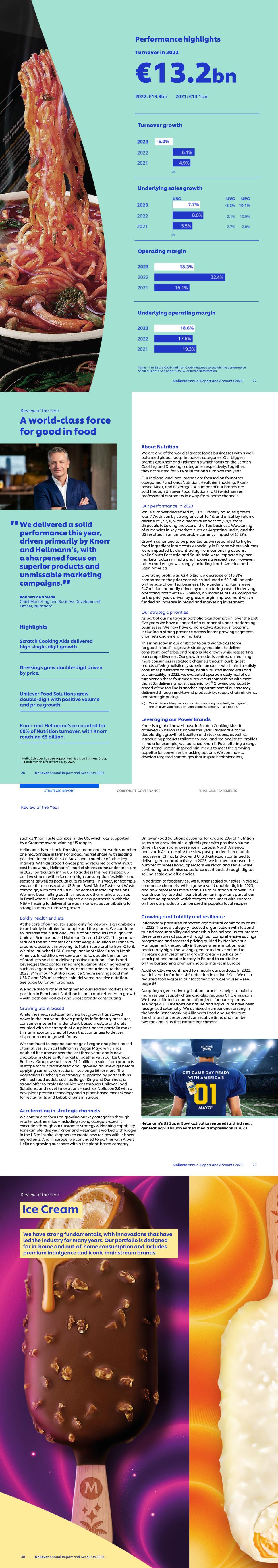 Unilever Annual Report and Accounts 2023 27 Performance highlights Turnover in 2023 €13.2bn 2022: €13.9bn 2021: €13.1bn Turnover growth Underlying sales growth Operating margin Underlying operating margin Pages 11 to 32 use GAAP and non-GAAP measures to explain the performance of our business. See page 59 to 64 for further information. We delivered a solid performance this year, driven primarily by Knorr and Hellmann’s, with a sharpened focus on superior products and unmissable marketing campaigns. Robbert de Vreede Chief Marketing and Business Development Officer, Nutrition* Highlights Scratch Cooking Aids delivered high single-digit growth. Dressings grew double-digit driven by price. Unilever Food Solutions grew double-digit with positive volume and price growth. Knorr and Hellmann's accounted for 60% of Nutrition turnover, with Knorr reaching €5 billion. * Heiko Schipper has been appointed Nutrition Business Group President with effect from 1 May 2024. About Nutrition We are one of the world’s largest foods businesses with a well- balanced global footprint across categories. Our biggest brands are Knorr and Hellmann’s which focus on the Scratch Cooking and Dressings categories respectively. Together, they accounted for 60% of Nutrition’s turnover this year. Our regional and local brands are focused on four other categories: Functional Nutrition, Healthier Snacking, Plant- based Meat, and Beverages. A number of our brands are sold through Unilever Food Solutions (UFS) which serves professional customers in away-from-home channels. Our performance in 2023 While turnover decreased by 5.0%, underlying sales growth was 7.7% driven by strong price of 10.1% and offset by volume decline of (2.2)%, with a negative impact of (6.9)% from disposals following the sale of the Tea business. Weakening of currencies in key markets such as Argentina, India, and the US resulted in an unfavourable currency impact of (5.2)%. Growth continued to be price-led as we responded to higher food ingredient input costs especially in Europe where volumes were impacted by downtrading from our pricing actions, while South East Asia and South Asia were impacted by local markets factors in India and Indonesia respectively. However, other markets grew strongly including North America and Latin America. Operating profit was €2.4 billion, a decrease of (46.3)% compared to the prior year which included a €2.3 billion gain on the sale of our Tea business. Non-underlying items were €47 million, primarily driven by restructuring costs. Underlying operating profit was €2.5 billion, an increase of 0.4% compared to the prior year, driven by gross margin improvement which funded an increase in brand and marketing investment. Our strategic priorities As part of our multi-year portfolio transformation, over the last five years we have disposed of a number of under-performing businesses. We now have a more advantageous footprint, including a strong presence across faster-growing segments, channels and emerging markets. This is reflected in our ambition to be ‘a world-class force for good in food’ – a growth strategy that aims to deliver consistent, profitable and responsible growth while reasserting our competitiveness. Our growth model is centred on reaching more consumers in strategic channels through our biggest brands offering holistically superior products which aim to satisfy consumer preference on taste, health, trusted ingredients and sustainability. In 2023, we evaluated approximately half of our turnover on these four measures versus competition with more than 80% delivering holistic superiority.(a) Growing profitability ahead of the top line is another important part of our strategy, delivered through end-to-end productivity, supply chain efficiency and strategic pricing. (a) We will be evolving our approach to measuring superiority to align with the Unilever-wide focus on 'unmissable superiority' – see page 5. Leveraging our Power Brands Knorr is a global powerhouse in Scratch Cooking Aids. It achieved €5 billion in turnover this year, largely due to the double-digit growth of bouillon and stock cubes, as well as introducing products tailored to local and regional taste profiles. In India for example, we launched Knorr K-Pots, offering a range of on-trend Korean-inspired mini meals to meet the growing appetite for convenient snacking options. We continue to develop targeted campaigns that inspire healthier diets, Review of the Year 28 Unilever Annual Report and Accounts 2023 A world-class force for good in food " " such as ‘Knorr Taste Combos’ in the US, which was supported by a Grammy award-winning US rapper. Hellmann’s is our iconic Dressings brand and the world’s number one mayonnaise in terms of global market share, with leading positions in the US, the UK, Brazil and a number of other key markets. With disproportionate pricing required to offset input cost headwinds, Hellmann’s market shares came under pressure in 2023, particularly in the US. To address this, we stepped up our investment with a focus on high consumption festivities and seasons as well as popular culture events. This year, for example, was our third consecutive US Super Bowl ‘Make Taste, Not Waste’ campaign, with around 9.8 billion earned media impressions. We have been rolling out this model to other markets such as in Brazil where Hellmann’s signed a new partnership with the NBA – helping to deliver share gains as well as contributing to strong in-market turnover growth. Boldly healthier diets At the core of our holistic superiority framework is an ambition to be boldly healthier for people and the planet. We continue to increase the nutritional value of our products to align with Unilever Science-based Nutrition Criteria (USNC). This year, we reduced the salt content of Knorr Veggie Bouillon in France by around a quarter, improving its Nutri-Score profile from C to B. We a