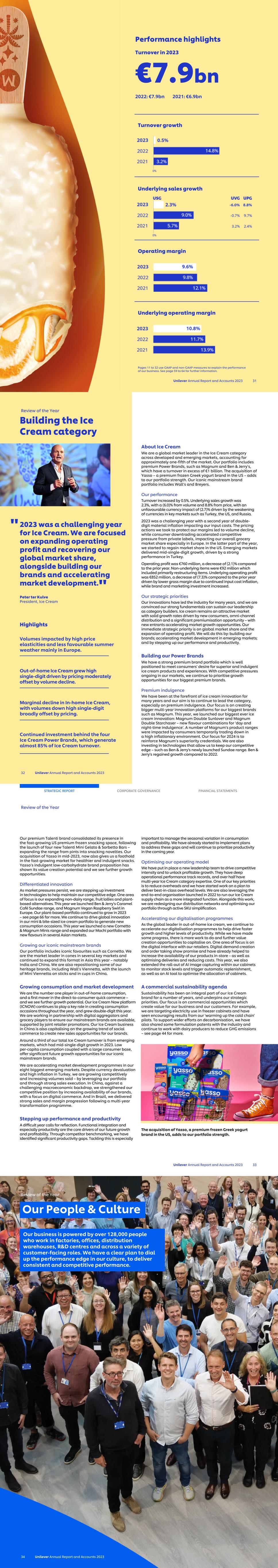 Unilever Annual Report and Accounts 2023 31 Performance highlights Turnover in 2023 €7.9bn 2022: €7.9bn 2021: €6.9bn Turnover growth Underlying sales growth Operating margin Underlying operating margin Pages 11 to 32 use GAAP and non-GAAP measures to explain the performance of our business. See page 59 to 64 for further information. 2023 was a challenging year for Ice Cream. We are focused on expanding operating profit and recovering our global market share, alongside building our brands and accelerating market development. Peter ter Kulve President, Ice Cream Highlights Volumes impacted by high price elasticities and less favourable summer weather mainly in Europe. Out-of-home Ice Cream grew high single-digit driven by pricing moderately offset by volume decline. Marginal decline in In-home Ice Cream, with volumes down high single-digit broadly offset by pricing. Continued investment behind the four Ice Cream Power Brands, which generate almost 85% of Ice Cream turnover. About Ice Cream We are a global market leader in the Ice Cream category across developed and emerging markets, accounting for approximately one-fifth of the market. Our portfolio includes premium Power Brands, such as Magnum and Ben & Jerry’s, which have a turnover in excess of €1 billion. The acquisition of Yasso – a premium frozen Greek yogurt brand in the US – adds to our portfolio strength. Our iconic mainstream brand portfolio includes Wall’s and Breyers. Our performance Turnover increased by 0.5%. Underlying sales growth was 2.3%, with a (6.0)% from volume and 8.8% from price, with an unfavourable currency impact of (2.7)% driven by the weakening of currencies in key markets such as Turkey, the US, and Russia. 2023 was a challenging year with a second year of double- digit material inflation impacting our input costs. The pricing actions we took to protect our margins led to volume decline, while consumer downtrading accelerated competitive pressure from private labels, impacting our overall grocery market share especially in Europe. In the latter part of the year, we started to regain market share in the US. Emerging markets delivered mid-single-digit growth, driven by a strong performance in Turkey. Operating profit was €760 million, a decrease of (2.1)% compared to the prior year. Non-underlying items were €92 million which included primarily restructuring items. Underlying operating profit was €852 million, a decrease of (7.3)% compared to the prior year driven by lower gross margin due to continued input cost inflation, while brand and marketing investment increased. Our strategic priorities Our innovations have led the industry for many years, and we are convinced our strong fundamentals can sustain our leadership as category builders. Ice cream remains an attractive market with solid growth rates driven by new consumers, omni-channel distribution and a significant premiumisation opportunity – with new entrants accelerating market growth opportunities. Our immediate strategic priority is on global market share and the expansion of operating profit. We will do this by: building our brands; accelerating market development in emerging markets; and by stepping up our performance and productivity. Building our Power Brands We have a strong premium brand portfolio which is well positioned to meet consumers' desire for superior and indulgent ice cream products and experiences. With competitive pressures ongoing in our markets, we continue to prioritise growth opportunities for our biggest premium brands. Premium indulgence We have been at the forefront of ice cream innovation for many years and our aim is to continue to lead the category, especially on premium indulgence. Our focus is on creating bigger multi-year innovation platforms for our biggest brands such as Magnum. This year, we launched our biggest ever ice cream innovation: Magnum Double Sunlover and Magnum Double Starchaser – new flavour combinations for ‘day and night-time indulgence’. A number of Magnum's product ranges were impacted by consumers temporarily trading down in a high inflationary environment. Our focus for 2024 is to reinforce Magnum’s superiority credentials. We are also investing in technologies that allow us to keep our competitive edge – such as Ben & Jerry's newly launched Sundae range. Ben & Jerry's regained growth compared to 2022. Review of the Year 32 Unilever Annual Report and Accounts 2023 Building the Ice Cream category " " Our premium Talenti brand consolidated its presence in the fast-growing US premium frozen snacking space, following the launch of four new Talenti Mini Gelato & Sorbetto Bars – expanding the range from pints into snacking novelties. Our acquisition of Yasso in mid-2023, now also gives us a foothold in the fast-growing market for healthier and indulgent snacks. Yasso’s indulgent low-carbohydrate brand proposition has shown its value creation potential and we see further growth opportunities. Differentiated innovation As market pressures persist, we are stepping up investment in technologies to help maintain our competitive edge. One area of focus is our expanding non-dairy range, fruit lollies and plant- based alternatives. This year we launched Ben & Jerry’s Caramel Café Sundae range, and Magnum Vegan Raspberry Swirl in Europe. Our plant-based portfolio continued to grow in 2023 – see page 66 for more. We continue to drive global innovation in our mini & bite-sized ice cream portfolio to generate new consumption occasions. This year we launched a new Cornetto & Magnum Minis range and expanded our Mochi portfolio with new flavours in several Asian markets. Growing our iconic mainstream brands Our portfolio includes iconic favourites such as Cornetto. We are the market leader in cones in several key markets and continued to expand this format in Asia this year – notably India and China. We are also repositioning some of our heritage brands, incl