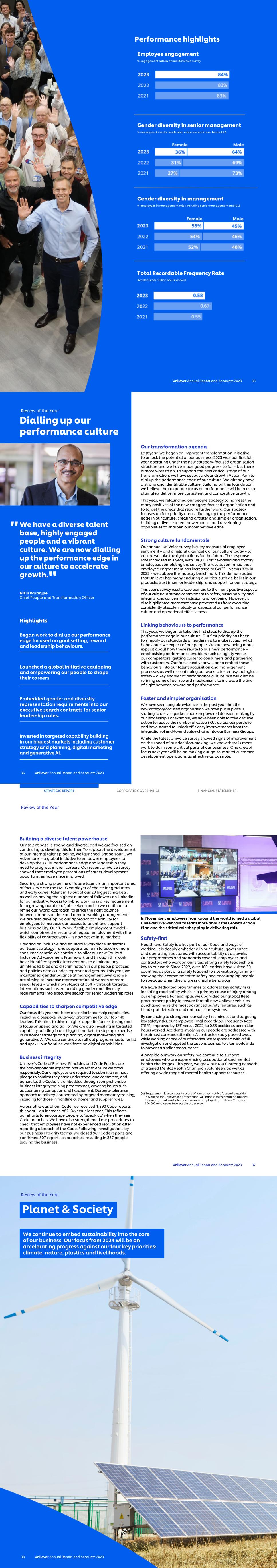 Unilever Annual Report and Accounts 2023 35 Performance highlights Employee engagement % engagement rate in annual UniVoice survey Total Recordable Frequency Rate Accidents per million hours worked Gender diversity in senior management % employees in senior leadership roles one work level below ULE Gender diversity in management % employees in management roles including senior management and ULE We have a diverse talent base, highly engaged people and a vibrant culture. We are now dialling up the performance edge in our culture to accelerate growth. Nitin Paranjpe Chief People and Transformation Officer Highlights Began work to dial up our performance edge focused on goal setting, reward and leadership behaviours. Launched a global initiative equipping and empowering our people to shape their careers. Embedded gender and diversity representation requirements into our executive search contracts for senior leadership roles. Invested in targeted capability building in our biggest markets including customer strategy and planning, digital marketing and generative AI. Our transformation agenda Last year, we began an important transformation initiative to unlock the potential of our business. 2023 was our first full year operating under the new category-focused organisation structure and we have made good progress so far – but there is more work to do. To support the next critical stage of our transformation, we have set out a clear Growth Action Plan to dial up the performance edge of our culture. We already have a strong and identifiable culture. Building on this foundation, we believe that a greater focus on performance will help us to ultimately deliver more consistent and competitive growth. This year, we relaunched our people strategy to harness the many positives of the new category-focused organisation and to target the areas that require further work. Our strategy focuses on four priority areas: dialling up the performance edge in our culture, creating a faster and simpler organisation, building a diverse talent powerhouse, and developing capabilities to sharpen our competitive edge. Strong culture fundamentals Our annual UniVoice survey is a key measure of employee sentiment – and a helpful diagnostic of our culture today – to ensure we take the right actions for the future. The response rate increased this year, with 106,000 office-based and factory employees completing the survey. The results confirmed that employee engagement has increased to 84%(a) – versus 83% in 2022 – well above the industry benchmark. This demonstrates that Unilever has many enduring qualities, such as: belief in our products; trust in senior leadership; and support for our strategy. This year’s survey results also pointed to the many positive aspects of our culture: a strong commitment to safety, sustainability and integrity, and concern for inclusion and wellbeing. However, it also highlighted areas that have prevented us from executing consistently at scale, notably on aspects of our performance culture and operational effectiveness. Linking behaviours to performance This year, we began to take the first steps to dial up the performance edge in our culture. Our first priority has been to simplify our standards of leadership to make it clear what behaviours we expect of our people. We are now being more explicit about how these relate to business performance – emphasising performance enablers such as agility versus our competitors, getting closer to consumers and partnering with customers. Our focus next year will be to embed these behaviours into our talent acquisition and management processes as well as continuing our work to foster psychological safety – a key enabler of performance culture. We will also be refining some of our reward mechanisms to increase the line of sight between reward and performance. Faster and simpler organisation We have seen tangible evidence in the past year that the new category-focused organisation we have put in place is starting to deliver quicker, more empowered decision-making by our leadership. For example, we have been able to take decisive action to reduce the number of active SKUs across our portfolio and have started to unlock efficiency improvements from the integration of end-to-end value chains into our Business Groups. While the latest UniVoice survey showed signs of improvement on the speed of our decision-making, we know there is more work to do in some critical parts of our business. One area of focus next year will be on making our go-to-market customer development operations as effective as possible. Review of the Year 36 Unilever Annual Report and Accounts 2023 Dialling up our performance culture " " Building a diverse talent powerhouse Our talent base is strong and diverse, and we are focused on continuing to develop this further. To support the development of our internal talent pipeline, we launched ‘Shape Your Own Adventure’ – a global initiative to empower employees to develop the skills, performance edge and leadership they need to progress in their careers. Our recent UniVoice survey showed that employee perceptions of career development opportunities have since improved. Securing a strong pipeline of future talent is an important area of focus. We are the FMCG employer of choice for graduates and early career talent in 10 out of our 20 biggest markets, as well as having the highest number of followers on LinkedIn for our industry. Access to hybrid working is a key requirement for a growing number of jobseekers and so we continue to refine our hybrid approach, to strike the right balance between in-person time and remote working arrangements. We are also developing our approach to flexibility for employees to increase our access to talent and support business agility. Our ‘U-Work’ flexible employment model – which combines the security of regular employment with the flexibility of contract 