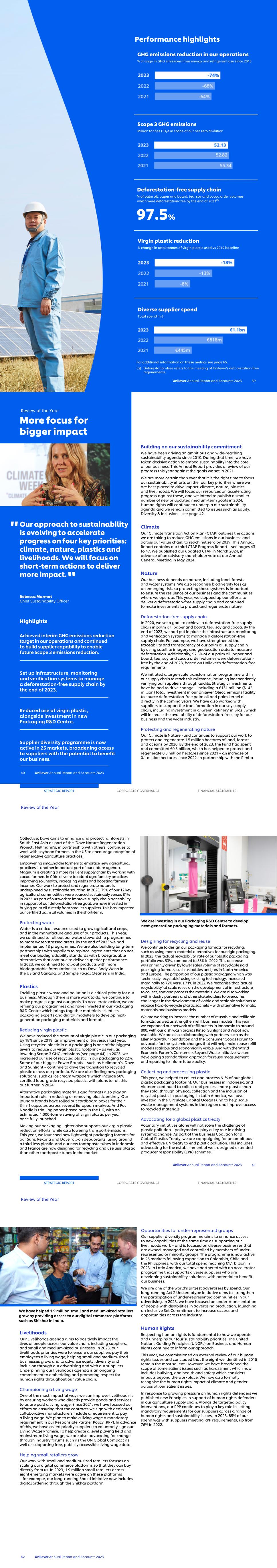 Unilever Annual Report and Accounts 2023 39 Performance highlights For additional information on these metrics see page 65. (a) Deforestation-free refers to the meeting of Unilever's deforestation-free requirements. 97.5% GHG emissions reduction in our operations % change in GHG emissions from energy and refrigerant use since 2015 Virgin plastic reduction % change in total tonnes of virgin plastic used vs 2019 baseline Scope 3 GHG emissions Million tonnes CO2e in scope of our net zero ambition Deforestation-free supply chain % of palm oil, paper and board, tea, soy and cocoa order volumes which were deforestation-free by the end of 2023(a) Diverse supplier spend Total spend in € Our approach to sustainability is evolving to accelerate progress on four key priorities: climate, nature, plastics and livelihoods. We will focus on short-term actions to deliver more impact. Rebecca Marmot Chief Sustainability Officer Highlights Achieved interim GHG emissions reduction target in our operations and continued to build supplier capability to enable future Scope 3 emissions reduction. Set up infrastructure, monitoring and verification systems to manage a deforestation-free supply chain by the end of 2023. Reduced use of virgin plastic, alongside investment in new Packaging R&D Centre. Supplier diversity programme is now active in 25 markets, broadening access to suppliers with the potential to benefit our business. Building on our sustainability commitment We have been driving an ambitious and wide-reaching sustainability agenda since 2010. During that time, we have taken decisive action to embed sustainability into the core of our business. This Annual Report provides a review of our progress this year against the goals we set in 2021. We are more certain than ever that it is the right time to focus our sustainability efforts on the four key priorities where we are best placed to drive impact: climate, nature, plastics and livelihoods. We will focus our resources on accelerating progress against these, and we intend to publish a smaller number of new or updated medium-term goals in 2024. Human rights will continue to underpin our sustainability agenda and we remain committed to issues such as Equity, Diversity & Inclusion – see page 42. Climate Our Climate Transition Action Plan (CTAP) outlines the actions we are taking to reduce GHG emissions in our business and across our value chain, to reach net zero by 2039. This Annual Report contains our third CTAP Progress Report – see pages 43 to 47. We published our updated CTAP in March 2024, in advance of an advisory shareholder vote at our Annual General Meeting in May 2024. Nature Our business depends on nature, including land, forests and water systems. We also recognise biodiversity loss as an emerging risk, so protecting these systems is important to ensure the resilience of our business and the communities where we operate. This year, we stepped up our efforts to deliver a deforestation-free supply chain and continued to make investments to protect and regenerate nature. Deforestation-free supply chain In 2020, we set a goal to achieve a deforestation-free supply chain in palm oil, paper and board, tea, soy and cocoa. By the end of 2023, we had put in place the infrastructure, monitoring and verification systems to manage a deforestation-free supply chain. For example, we have strengthened the traceability and transparency of our palm oil supply chain by using satellite imagery and geolocation data to measure deforestation. Additionally, 97.5% of our palm oil, paper and board, tea, soy and cocoa order volumes were deforestation- free by the end of 2023, based on Unilever's deforestation-free requirements. We initiated a large-scale transformation programme within our supply chain to reach this milestone, including independently verifying our suppliers through audits. Strategic investments have helped to drive change – including a €131 million ($142 million) total investment in our Unilever Oleochemicals facility to source deforestation-free palm oil and palm kernel oil directly in the coming years. We have also worked with suppliers to support the transformation in our soy supply chain, including investment in a ‘Green Refinery’ in Brazil which will increase the availability of deforestation-free soy for our business and the wider industry. Protecting and regenerating nature Our Climate & Nature Fund continues to support our work to protect and regenerate 1.5 million hectares of land, forests and oceans by 2030. By the end of 2023, the Fund had spent and committed €0.3 billion, which has helped to protect and regenerate 0.3 million hectares since 2021 – an increase of 0.1 million hectares since 2022. In partnership with the Rimba Review of the Year 40 Unilever Annual Report and Accounts 2023 More focus for bigger impact " " Collective, Dove aims to enhance and protect rainforests in South East Asia as part of the ‘Dove Nature Regeneration Project’. Hellmann’s, in partnership with others, continues to work with soybean farmers in the US to encourage adoption of regenerative agriculture practices. Empowering smallholder farmers to embrace new agricultural practices is another important part of our nature agenda. Magnum is creating a more resilient supply chain by working with cocoa farmers in Côte d’Ivoire to adopt agroforestry practices – improving soil health, increasing yields and boosting farmers’ incomes. Our work to protect and regenerate nature is underpinned by sustainable sourcing. In 2023, 79% of our 12 key agricultural commodities were sourced sustainably versus 81% in 2022. As part of our work to improve supply chain traceability in support of our deforestation-free goal, we have invested in buying palm oil directly from smaller suppliers. This has impacted our certified palm oil volumes in the short-term. Protecting water Water is a critical resource used to grow agricultural cr