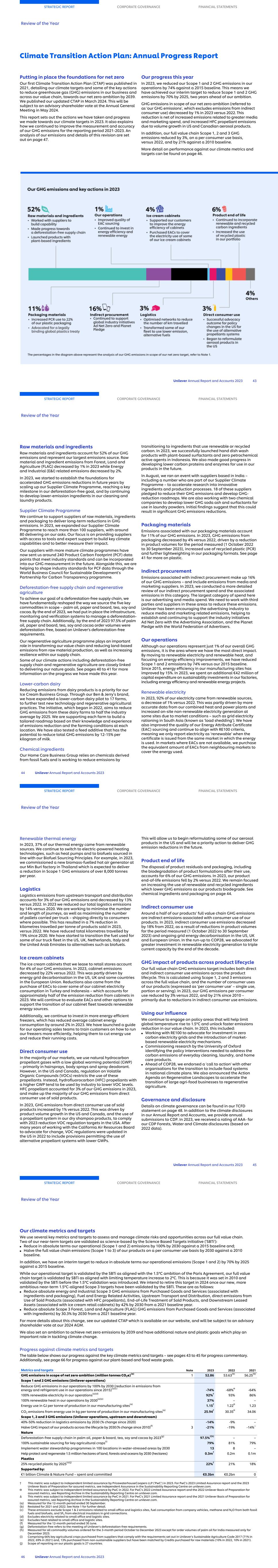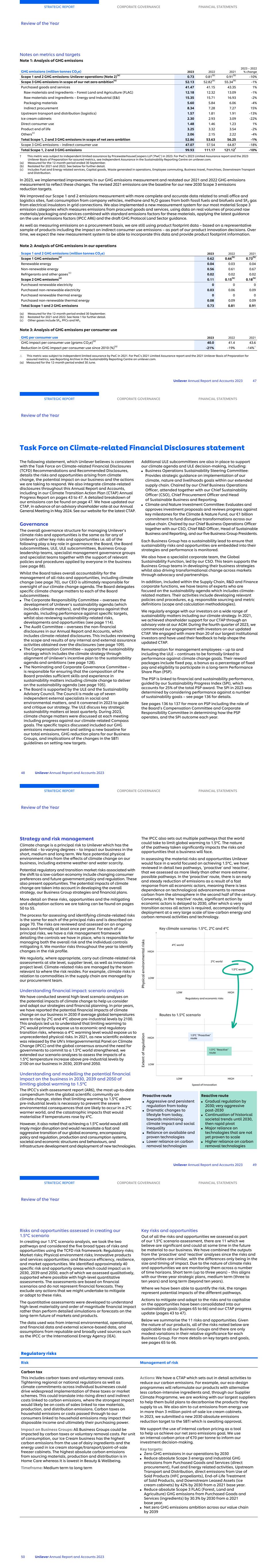 Notes on metrics and targets Note 1: Analysis of GHG emissions GHG emissions (million tonnes CO2e) 2023 2022 2021 2023 – 2022 % change Scope 1 and 2 GHG emissions: Unilever operations (Note 2)(a) 0.73 0.81(b) 0.91(b) -10% Scope 3 GHG emissions in scope of our net zero ambition(a) 52.13 52.82(b) 55.34(b) -1% Purchased goods and services 41.47 41.15 43.35 1% Raw materials and ingredients – Forest Land and Agriculture (FLAG) 12.18 12.32 13.09 -1% Raw materials and ingredients – Energy and Industrial (E&I) 15.35 15.71 16.93 -2% Packaging materials 5.60 5.84 6.06 -4% Indirect procurement 8.34 7.28 7.27 15% Upstream transport and distribution (logistics) 1.57 1.81 1.91 -13% Ice cream cabinets 2.30 2.93 3.09 -22% Direct consumer use 1.48 1.46 1.23 1% Product end of life 3.25 3.32 3.54 -2% Others(c) 2.06 2.15 2.22 -4% Total Scope 1, 2 and 3 GHG emissions in scope of net zero ambition 52.86 53.63 56.25 -1% Scope 3 GHG emissions – indirect consumer use 47.07 57.54 64.87 -18% Total Scope 1, 2 and 3 GHG emissions 99.93 111.17 121.12† -10% † This metric was subject to independent limited assurance by PricewaterhouseCoopers LLP (‘PwC’) in 2023. For PwC's 2023 Limited Assurance report and the 2023 Unilever Basis of Preparation for assured metrics, see Independent Assurance in the Sustainability Reporting Centre on unilever.com. (a) Measured for the 12-month period ended 30 September. (b) Restated for 2021 and 2022. See below for further detail. (c) Includes Fuel and Energy related services, Capital goods, Waste generated in operations, Employee commuting, Business travel, Franchises, Downstream Transport and Distribution. In 2023, we implemented improvements in our GHG emissions measurement and restated our 2021 and 2022 GHG emissions measurement to reflect these changes. The revised 2021 emissions are the baseline for our new 2030 Scope 3 emissions reduction targets. We improved our Scope 1 and 2 emissions measurement with more complete and accurate data related to small office and logistics sites, fuel consumption from company vehicles, methane and N2O gases from both fossil fuels and biofuels and SF6 gas from electrical insulators in grid connections. We also implemented a new measurement system for our most material Scope 3 emission categories which measures emissions from procured goods and services, using data on real volumes of procured raw materials/packaging and services combined with standard emissions factors for these materials, applying the latest guidance on the use of emissions factors (IPCC AR6) and the draft GHG Protocol Land Sector guidance. As well as measuring emissions on a procurement basis, we are still using product footprint data – based on a representative sample of products including the impact on indirect consumer use emissions – as part of our product innovation decisions. Over time, we expect the new measurement system to be able to incorporate this data and provide product footprint information. Note 2: Analysis of GHG emissions in our operations Scope 1 and 2 GHG emissions (million tonnes CO2e) 2023 2022 2021 Scope 1 GHG emissions(a) 0.62 0.66(b) 0.73(b) Renewable energy 0.04 0.03 0.04 Non-renewable energy 0.56 0.61 0.67 Refrigerants and other gases (c) 0.02 0.02 0.02 Scope 2 GHG emissions(a) 0.11 0.15(b) 0.18(b) Purchased renewable electricity 0 0 0 Purchased non-renewable electricity 0.03 0.06 0.09 Purchased renewable thermal energy 0 0 0 Purchased non-renewable thermal energy 0.08 0.09 0.09 Total Scope 1 and 2 GHG emissions 0.73 0.81 0.91 (a) Measured for the 12-month period ended 30 September.  (b) Restated for 2021 and 2022. See Note 1 for further detail.   (c) Other gases include SF6, PFCs and NF3. Note 3: Analysis of GHG emissions per consumer use GHG per consumer use 2023 2022 2021 GHG impact per consumer use (grams CO2e)(a) 40.0 41.4 43.6 Reduction in GHG impact per consumer use since 2010 (%)(a) -21% '-19% '-14%△ △ This metric was subject to independent limited assurance by PwC in 2021. For PwC's 2021 Limited Assurance report and the 2021 Unilever Basis of Preparation for assured metrics, see Reporting Archive in the Sustainability Reporting Centre on unilever.com. (a) Measured for the 12-month period ended 30 June. STRATEGIC REPORT CORPORATE GOVERNANCE FINANCIAL STATEMENTS Review of the Year Unilever Annual Report and Accounts 2023 47 Task Force on Climate-related Financial Disclosures statement The following statement, which Unilever believes is consistent with the Task Force on Climate-related Financial Disclosures (TCFD) Recommendations and Recommended Disclosures, details the risks and opportunities arising from climate change, the potential impact on our business and the actions we are taking to respond. We also integrate climate-related disclosures throughout this Annual Report and Accounts, including in our Climate Transition Action Plan (CTAP) Annual Progress Report on pages 43 to 47. A detailed breakdown of our emissions can be found on page 47. We have updated our CTAP, in advance of an advisory shareholder vote at our Annual General Meeting in May 2024. See our website for the latest CTAP. Governance The overall governance structure for managing Unilever’s climate risks and opportunities is the same as for any of Unilever’s other key risks and opportunities i.e. all of the following play a key role in governance: the Board, the Board subcommittees, ULE, ULE subcommittees, Business Group leadership teams, specialist management governance groups and specialist teams together with the support of relevant policies and procedures applied by everyone in the business (see page 88). Whilst the Board takes overall accountability for the management of all risks and opportunities, including climate change (see page 70), our CEO is ultimately responsible for oversight of our climate change agenda. The Board delegates specific climate change matters to each of the Board subcommittees: ■ The Corporate Responsibility Committee