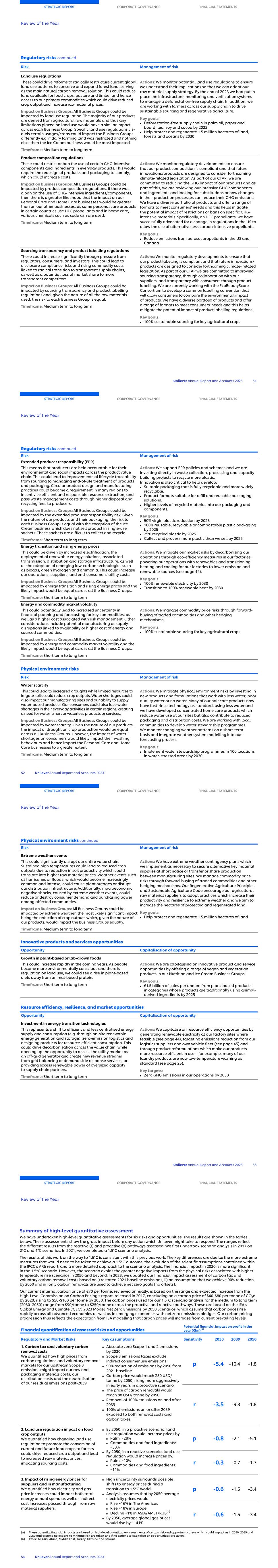 Risk Management of risk Land use regulations These could drive reforms to radically restructure current global land use patterns to conserve and expand forest land, serving as the main natural carbon removal solution. This could reduce land available for food crops, pasture and timber and hence access to our primary commodities which could drive reduced crop output and increase raw material prices. Impact on Business Groups: All Business Groups could be impacted by land use regulation. The majority of our products are derived from agricultural raw materials and thus any limitations placed on land use would have a similar impact across each Business Group. Specific land use regulations vis- à-vis certain usages/crops could impact the Business Groups differently e.g. if dairy farming land was restricted and nothing else, then the Ice Cream business would be most impacted. Timeframe: Medium term to long term Actions: We monitor potential land use regulations to ensure we understand their implications so that we can adapt our raw material supply strategy. By the end of 2023 we had put in place the infrastructure, monitoring and verification systems to manage a deforestation-free supply chain. In addition, we are working with farmers across our supply chain to drive sustainable sourcing and regenerative agriculture. Key goals: ■ Deforestation-free supply chain in palm oil, paper and board, tea, soy and cocoa by 2023 ■ Help protect and regenerate 1.5 million hectares of land, forests and oceans by 2030 Product composition regulations These could restrict or ban the use of certain GHG-intensive components and ingredients in everyday products. This would require the redesign of products and packaging to comply, which could increase costs. Impact on Business Groups: All Business Groups could be impacted by product composition regulations. If there was a ban on the use of GHG-intensive ingredients/components, then there is a greater likelihood that the impact on our Personal Care and Home Care businesses would be greater than on our other businesses, as some personal care products in certain countries use HFC propellants and in home care, various chemicals such as soda ash are used. Timeframe: Medium term to long term Actions: We monitor regulatory developments to ensure that our product composition is compliant and that future innovations/products are designed to consider forthcoming climate-related legislation. As part of our CTAP, we are committed to reducing the GHG impact of our products and as part of this, we are reviewing our intensive GHG components and ingredients and looking for substitutions or how changes in their production processes can reduce their GHG emissions. We have a diverse portfolio of products and offer a range of formats to meet consumers' needs and this helps mitigate the potential impact of restrictions or bans on specific GHG- intensive materials. Specifically, on HFC propellants, we have successfully advocated for a change in regulations in the US to allow the use of alternative less carbon-intensive propellants. Key goals: ■ Reduce emissions from aerosol propellants in the US and Canada Sourcing transparency and product labelling regulations These could increase significantly through pressure from regulators, consumers, and investors. This could lead to disclosure compliance risks and rising commodity costs linked to radical transition to transparent supply chains, as well as a potential loss of market share to more transparent competitors. Impact on Business Groups: All Business Groups could be impacted by sourcing transparency and product labelling regulations and, given the nature of all the raw materials used, the risk to each Business Group is equal. Timeframe: Medium term to long term Actions: We monitor regulatory developments to ensure that our product labelling is compliant and that future innovations/ products are designed to consider forthcoming climate- related legislation. As part of our CTAP we are committed to improving sourcing transparency, through collaboration with our suppliers, and transparency with consumers through product labelling. We are currently working with the EcoBeautyScore Consortium to develop a common labelling convention that will allow consumers to compare the environmental impact of products. We have a diverse portfolio of products and offer a range of formats to meet consumers' needs and this helps mitigate the potential impact of product labelling regulations. Key goals: ■ 100% sustainable sourcing for key agricultural crops Regulatory risks continued STRATEGIC REPORT CORPORATE GOVERNANCE FINANCIAL STATEMENTS Review of the Year Unilever Annual Report and Accounts 2023 51 Risk Management of risk Extended producer responsibility (EPR) This means that producers are held accountable for their environmental and social impacts across the product value chain. This could lead to improvements of lifecycle traceability from sourcing to managing end-of-life treatment of products and packaging. Circular product design and manufacturing practices could become a requirement in many regions to incentivise efficient and responsible resource extraction, and pass waste management costs through higher disposal and recycling fees to producers. Impact on Business Groups: All Business Groups could be impacted by the extended producer responsibility risk. Given the nature of our products and their packaging, the risk to each Business Group is equal with the exception of the Ice Cream business which does not sell product in single-use sachets. These sachets are difficult to collect and recycle. Timeframe: Short term to long term Actions: We support EPR policies and schemes and we are investing directly in waste collection, processing and capacity- building projects to recycle more plastic. Innovation is also critical to help develop: ■ Suitable packaging that is fully recyclable and more widely recyclable. ■ Product formats suita