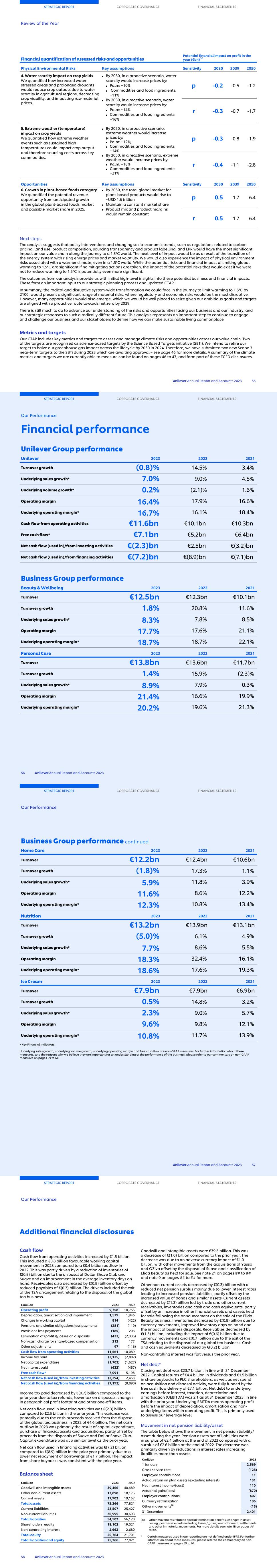Physical Environmental Risks Key assumptions Sensitivity 2030 2039 2050 4. Water scarcity impact on crop yields We quantified how increased water- stressed areas and prolonged droughts would reduce crop outputs due to water scarcity in agricultural regions, decreasing crop viability, and impacting raw material prices. ■ By 2050, in a proactive scenario, water scarcity would increase prices by: ■ Palm: ~10% ■ Commodities and food ingredients: ~11% ■ By 2050, in a reactive scenario, water scarcity would increase prices by: ■ Palm: ~14% ■ Commodities and food ingredients: ~16% p -0.2 -0.5 -1.2 r -0.3 -0.7 -1.7 5. Extreme weather (temperature) impact on crop yields We quantified how extreme weather events such as sustained high temperatures could impact crop output and therefore sourcing costs across key commodities. ■ By 2050, in a proactive scenario, extreme weather would increase prices by: ■ Palm: ~12%; ■ Commodities and food ingredients: ~14% ■ By 2050, in a reactive scenario, extreme weather would increase prices by: ■ Palm: ~18% ■ Commodities and food ingredients: ~21% p -0.3 -0.8 -1.9 r -0.4 -1.1 -2.8 Opportunities Key assumptions Sensitivity 2030 2039 2050 6. Growth in plant-based foods category We quantified the potential revenue opportunity from anticipated growth in the global plant-based foods market and possible market share in 2025. ■ By 2050, the total global market for plant-based products would rise to ~USD 1.6 trillion ■ Maintain a constant market share ■ Product mix and product margins would remain constant p 0.5 1.7 6.4 r 0.5 1.7 6.4 Financial quantification of assessed risks and opportunities Potential financial impact on profit in the year (€bn)(a) Next steps The analysis suggests that policy interventions and changing socio-economic trends, such as regulations related to carbon pricing, land use, product composition, sourcing transparency and product labelling, and EPR would have the most significant impact on our value chain along the journey to a 1.5°C world. The next level of impact would be as a result of the transition of the energy system with rising energy prices and market volatility. We would also experience the impact of physical environment risks associated with a warmer climate, even in a 1.5°C world. While the potential risks and financial impact of limiting global warming to 1.5°C are significant if no mitigating actions are taken, the impact of the potential risks that would exist if we were not to reduce warming to 1.5°C is potentially even more significant. The outcomes from our analysis provide us with initial high-level insights into these potential business and financial impacts. These form an important input to our strategic planning process and updated CTAP. In summary, the radical and disruptive system-wide transformation we could face in the journey to limit warming to 1.5°C by 2100, would present a significant range of material risks, where regulatory and economic risks would be the most disruptive. However, many opportunities would also emerge, which we would be well placed to seize given our ambitious goals and targets are aligned with a proactive route towards net zero by 2039. There is still much to do to advance our understanding of the risks and opportunities facing our business and our industry, and our strategic responses to such a radically different future. This analysis represents an important step to continue to engage and challenge our business and our stakeholders to define how we can make sustainable living commonplace. Metrics and targets Our CTAP includes key metrics and targets to assess and manage climate risks and opportunities across our value chain. Two of the targets are recognised as science-based targets by the Science Based Targets initiative (SBTi). We intend to retire our target to halve our greenhouse gas impact across the lifecycle by 2030 in 2024. Therefore, we have submitted two new Scope 3 near-term targets to the SBTi during 2023 which are awaiting approval – see page 46 for more details. A summary of the climate metrics and targets we are currently able to measure can be found on pages 46 to 47, and form part of these TCFD disclosures. STRATEGIC REPORT CORPORATE GOVERNANCE FINANCIAL STATEMENTS Review of the Year Unilever Annual Report and Accounts 2023 55 Unilever Group performance Unilever 2023 2022 2021 Turnover growth (0.8) % 14.5 % 3.4 % Underlying sales growth* 7.0 % 9.0 % 4.5 % Underlying volume growth* 0.2 % (2.1) % 1.6 % Operating margin 16.4 % 17.9 % 16.6 % Underlying operating margin* 16.7 % 16.1 % 18.4 % Cash flow from operating activities €11.6bn €10.1bn €10.3bn Free cash flow* €7.1bn €5.2bn €6.4bn Net cash flow (used in)/from investing activities €(2.3)bn €2.5bn €(3.2)bn Net cash flow (used in)/from financing activities €(7.2)bn €(8.9)bn €(7.1)bn Business Group performance Beauty & Wellbeing 2023 2022 2021 Turnover €12.5bn €12.3bn €10.1bn Turnover growth 1.8 % 20.8 % 11.6 % Underlying sales growth* 8.3 % 7.8 % 8.5 % Operating margin 17.7 % 17.6 % 21.1 % Underlying operating margin* 18.7 % 18.7 % 22.1 % Personal Care 2023 2022 2021 Turnover €13.8bn €13.6bn €11.7bn Turnover growth 1.4 % 15.9 % (2.3) % Underlying sales growth* 8.9 % 7.9 % 0.3 % Operating margin 21.4 % 16.6 % 19.9 % Underlying operating margin* 20.2 % 19.6 % 21.3 % STRATEGIC REPORT CORPORATE GOVERNANCE FINANCIAL STATEMENTS Our Performance Financial performance 56 Unilever Annual Report and Accounts 2023 Business Group performance continued Home Care 2023 2022 2021 Turnover €12.2bn €12.4bn €10.6bn Turnover growth (1.8) % 17.3 % 1.1 % Underlying sales growth* 5.9 % 11.8 % 3.9 % Operating margin 11.6 % 8.6 % 12.2 % Underlying operating margin* 12.3 % 10.8 % 13.4 % Nutrition 2023 2022 2021 Turnover €13.2bn €13.9bn €13.1bn Turnover growth (5.0) % 6.1 % 4.9 % Underlying sales growth* 7.7 % 8.6 % 5.5 % Operating margin 18.3 % 32.4 % 16.1 % Unde