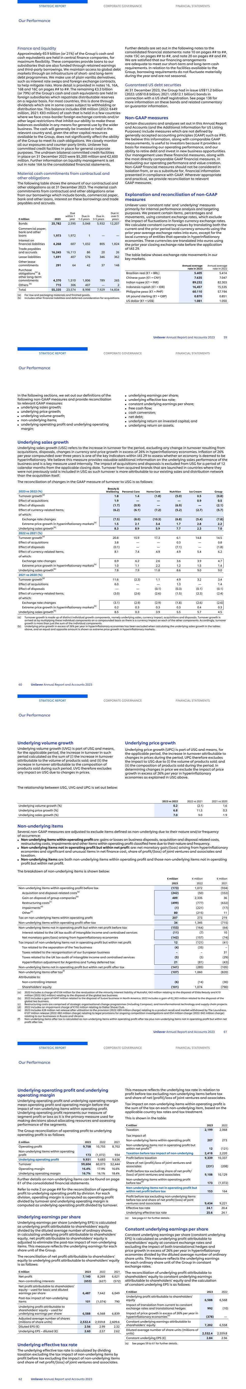 Finance and liquidity Approximately €0.9 billion (or 21%) of the Group’s cash and cash equivalents are held in central finance companies, for maximum flexibility. These companies provide loans to our subsidiaries that are also funded through retained earnings and third-party borrowings. We maintain access to global debt markets through an infrastructure of short- and long-term debt programmes. We make use of plain vanilla derivatives, such as interest rate swaps and foreign exchange contracts, to help mitigate risks. More detail is provided in notes 16, 16A, 16B and 16C on pages ## to ##. The remaining €3.3 billion (or 79%) of the Group’s cash and cash equivalents are held in foreign subsidiaries which repatriate distributable reserves on a regular basis. For most countries, this is done through dividends which are in some cases subject to withholding or distribution tax. This balance includes €98 million (2022: €449 million, 2021: €83 million) of cash that is held in a few countries where we face cross-border foreign exchange controls and/or other legal restrictions that inhibit our ability to make these balances available in any means for general use by the wider business. The cash will generally be invested or held in the relevant country and, given the other capital resources available to the Group, does not significantly affect the ability of the Group to meet its cash obligations. We closely monitor all our exposures and counter-party limits. Unilever has committed credit facilities in place for general corporate purposes. The undrawn bilateral committed credit facilities in place on 31 December 2023 were $5,200 million and €2,600 million. Further information on liquidity management is set out in note 16A to the consolidated financial statements. Material cash commitments from contractual and other obligations The following table shows the amount of our contractual and other obligations as at 31 December 2023. The material cash commitments from contractual and other obligations arise from our borrowings which include bonds, commercial paper, bank and other loans, interest on these borrowings and trade payables and accruals. € million 2023 Due within 1 year Due in 1-3 years Due in 3-5 years Due in over 5 years Bonds 25,782 2,595 5,048 5,932 12,207 Commercial paper, bank and other loans 1,973 1,972 1 — — Interest on financial liabilities 4,268 607 1,032 805 1,824 Trade payables and accruals 16,245 16,113 86 20 26 Lease liabilities 1,691 407 576 346 362 Other lease commitments 291 64 42 37 148 Purchase obligations(a) & other long-term commitments 4,370 1,510 1,806 789 265 Others (b) 715 306 407 — 2 Total 55,335 23,574 8,998 7,929 14,834 (a) For raw and packaging materials and finished goods. (b) Includes other financial liabilities and deferred consideration for acquisitions. Further details are set out in the following notes to the consolidated financial statements: note 10 on pages ## to ##, note 15C on pages ## to ##, and note 20 on pages ## and ##. We are satisfied that our financing arrangements are adequate to meet our short-term and long-term cash requirements. In relation to the facilities available to the Group, borrowing requirements do not fluctuate materially during the year and are not seasonal. Guaranteed US debt securities At 31 December 2023, the Group had in issue US$11.2 billion (2022: US$10.8 billion; 2021: US$12.1 billion) bonds in connection with a US shelf registration. See page 138 for more information on these bonds and related commentary on guarantor information. Non-GAAP measures Certain discussions and analyses set out in this Annual Report and Accounts (and the Additional Information for US Listing Purposes) include measures which are not defined by generally accepted accounting principles (GAAP) such as IFRS. We believe this information, along with comparable GAAP measurements, is useful to investors because it provides a basis for measuring our operating performance, and our ability to retire debt and invest in new business opportunities. Our management uses these financial measures, along with the most directly comparable GAAP financial measures, in evaluating our operating performance and value creation. Non-GAAP financial measures should not be considered in isolation from, or as a substitute for, financial information presented in compliance with GAAP. Wherever appropriate and practical, we provide reconciliation to relevant GAAP measures. Explanation and reconciliation of non-GAAP measures Unilever uses ‘constant rate’ and ‘underlying’ measures primarily for internal performance analysis and targeting purposes. We present certain items, percentages and movements, using constant exchange rates, which exclude the impact of fluctuations in foreign currency exchange rates. We calculate constant currency values by translating both the current and the prior period local currency amounts using the prior year average exchange rates into euro, except for the local currency of entities that operate in hyperinflationary economies. These currencies are translated into euros using the prior year closing exchange rate before the application of IAS 29. The table below shows exchange rate movements in our key markets. Annual average rate in 2023 Annual average rate in 2022 Brazilian real (€1 = BRL) 5.405 5.414 Chinese yuan (€1 = CNY) 7.635 7.047 Indian rupee (€1 = INR) 89.232 82.303 Indonesia rupiah (€1 = IDR) 16,457 15,535 Philippine peso (€1 = PHP) 60.110 57.194 UK pound sterling (€1 = GBP) 0.870 0.851 US dollar (€1 = US$) 1.081 1.050 STRATEGIC REPORT CORPORATE GOVERNANCE FINANCIAL STATEMENTS Our Performance Unilever Annual Report and Accounts 2023 59 In the following sections, we set out our definitions of the following non-GAAP measures and provide reconciliation to relevant GAAP measures: ■ underlying sales growth; ■ underlying price growth; ■ underlying volume growth; ■ non-underlying items