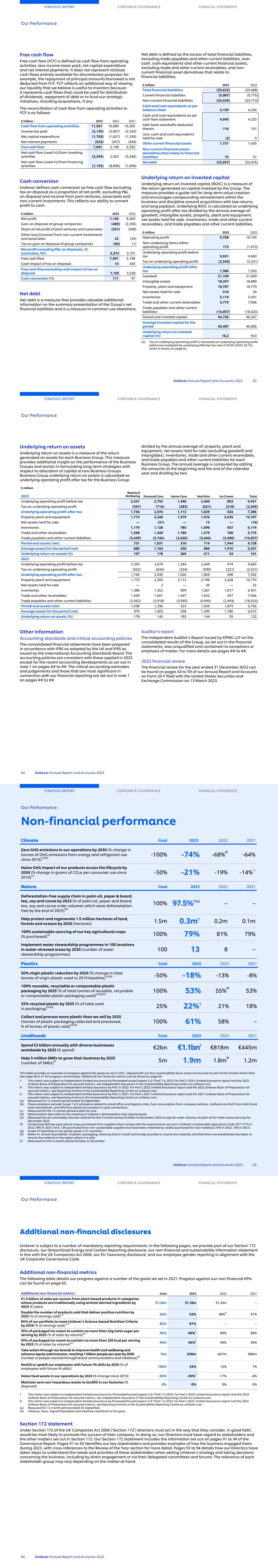 Free cash flow Free cash flow (FCF) is defined as cash flow from operating activities, less income taxes paid, net capital expenditure and net interest payments. It does not represent residual cash flows entirely available for discretionary purposes; for example, the repayment of principal amounts borrowed is not deducted from FCF. FCF reflects an additional way of viewing our liquidity that we believe is useful to investors because it represents cash flows that could be used for distribution of dividends, repayment of debt or to fund our strategic initiatives, including acquisitions, if any. The reconciliation of cash flow from operating activities to FCF is as follows: € million 2023 2022 2021 Cash flow from operating activities 11,561 10,089 10,305 Income tax paid (2,135) (2,807) (2,333) Net capital expenditure (1,703) (1,627) (1,239) Net interest payments (632) (457) (340) Free cash flow 7,091 5,198 6,393 Net cash flow (used in)/from investing activities (2,294) 2,453 (3,246) Net cash flow (used in)/from financing activities (7,193) (8,890) (7,099) Cash conversion Unilever defines cash conversion as free cash flow excluding tax on disposal as a proportion of net profit, excluding P&L on disposal and income from joint ventures, associates and non-current investments. This reflects our ability to convert profit to cash. € million 2023 2022 Net profit 7,140 8,269 Gain on disposal of group companies (489) (2,335) Share of net profit of joint ventures and associates (231) (208) Other loss/(income) from non-current investments and associates 22 (24) Tax on gain on disposal of group companies (69) (1) Net profit excluding P&L on disposals, JV, associates, NCI 6,373 5,701 Free cash flow 7,091 5,198 Cash impact of tax on disposal 14 330 Free cash flow excluding cash impact of tax on disposal 7,105 5,528 Cash conversion (%) 111 97 Net debt Net debt is a measure that provides valuable additional information on the summary presentation of the Group’s net financial liabilities and is a measure in common use elsewhere. Net debt is defined as the excess of total financial liabilities, excluding trade payables and other current liabilities, over cash, cash equivalents and other current financial assets, excluding trade and other current receivables, and non- current financial asset derivatives that relate to financial liabilities. € million 2023 2022 Total financial liabilities (29,622) (29,488) Current financial liabilities (5,087) (5,775) Non-current financial liabilities (24,535) (23,713) Cash and cash equivalents as per balance sheet 4,159 4,326 Cash and cash equivalents as per cash flow statement 4,045 4,225 Add: bank overdrafts deducted therein 116 101 Less: cash and cash equivalents held for sale (2) 0 Other current financial assets 1,731 1,435 Non-current financial assets derivatives that relate to financial liabilities 75 51 Net debt (23,657) (23,676) Underlying return on invested capital Underlying return on invested capital (ROIC) is a measure of the return generated on capital invested by the Group. The measure provides a guide rail for long-term value creation and encourages compounding reinvestment within the business and discipline around acquisitions with low returns and long payback. Underlying ROIC is calculated as underlying operating profit after tax divided by the annual average of: goodwill, intangible assets, property, plant and equipment, net assets held for sale, inventories, trade and other current receivables, and trade payables and other current liabilities. € million 2023 2022 Operating profit 9,758 10,755 Non-underlying items within operating profit 173 (1,072) Underlying operating profit before tax 9,931 9,683 Tax on underlying operating profit (2,545) (2,331) Underlying operating profit after tax 7,386 7,352 Goodwill 21,109 21,609 Intangible assets 18,357 18,880 Property, plant and equipment 10,707 10,770 Net assets held for sale 516 24 Inventories 5,119 5,931 Trade and other current receivables 5,775 7,056 Trade payables and other current liabilities (16,857) (18,023) Period-end invested capital 44,726 46,247 Average invested capital for the period 45,487 46,005 Underlying return on invested capital (%) 16.2 16.0 (a) Tax on underlying operating profit is calculated as underlying operating profit before tax multiplied by underlying effective tax rate of 25.6% (2022: 24.1%) which is shown on page 62. STRATEGIC REPORT CORPORATE GOVERNANCE FINANCIAL STATEMENTS Our Performance Unilever Annual Report and Accounts 2023 63 Underlying return on assets Underlying return on assets is a measure of the return generated on assets for each Business Group. This measure provides additional insight on the performance of the Business Groups and assists in formulating long-term strategies with respect to allocation of capital across Business Groups. Business Group underlying return on assets is calculated as underlying operating profit after tax for the Business Group divided by the annual average of: property, plant and equipment, net assets held for sale (excluding goodwill and intangibles), inventories, trade and other current receivables, and trade payables and other current liabilities for each Business Group. The annual average is computed by adding the amounts at the beginning and the end of the calendar year and dividing by two. € million 2023 Beauty & Wellbeing Personal Care Home Care Nutrition Ice Cream Total Underlying operating profit before tax 2,331 2,792 1,496 2,460 852 9,931 Tax on underlying operating profit (597) (716) (383) (631) (218) (2,545) Underlying operating profit after tax 1,734 2,076 1,113 1,829 634 7,386 Property plant and equipment 1,773 2,340 1,979 1,976 2,639 10,707 Net assets held for sale — (31) — 15 — (16) Inventories 1,179 1,128 785 1,090 937 5,119 Trade and other receivables 1,208 1,340 1,180 1,279 768 5,775 Trade payables and other current liabilities (3,439) (3,746) (3,626) (3,646) (2,400) (16,857) Period-end assets (net