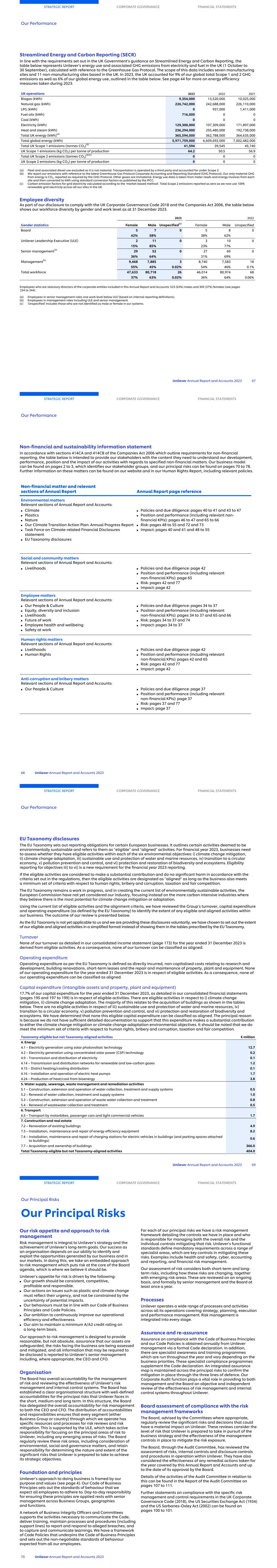 Streamlined Energy and Carbon Reporting (SECR) In line with the requirements set out in the UK Government’s guidance on Streamlined Energy and Carbon Reporting, the table below represents Unilever’s energy use and associated GHG emissions from electricity and fuel in the UK (1 October to 30 September), calculated with reference to the Greenhouse Gas Protocol. The scope of this data includes seven manufacturing sites and 11 non-manufacturing sites based in the UK. In 2023, the UK accounted for 9% of our global total Scope 1 and 2 GHG emissions as well as 6% of our global energy use, outlined in the table below. See page 44 for more on energy efficiency measures taken during 2023. UK operations 2023 2022 2021 Biogas (kWh) 9,354,000 13,520,000 10,025,000 Natural gas (kWh) 226,742,000 242,688,000 226,110,000 LPG (kWh) 0 937,000 1,411,000 Fuel oils (kWh) 716,000 0 0 Coal (kWh) 0 0 0 Electricity (kWh) 129,300,000 107,309,000 171,897,000 Heat and steam (kWh) 236,294,000 255,480,000 192,738,000 Total UK energy (kWh)(a) 365,594,000 362,788,000 364,635,000 Total global energy (kWh) 5,971,759,000 6,609,692,000 7,002,482,000 Total UK Scope 1 emissions (tonnes CO2)(b) 41,594 39,545 45,740 UK Scope 1 emissions (kg CO2) per tonne of production 64.2 50.5 56.9 Total UK Scope 2 emissions (tonnes CO2)(b)(c) 0 0 0 UK Scope 2 emissions (kg CO2) per tonne of production 0 0 0 (a) Fleet and associated diesel use excluded as it is not material. Transportation is operated by a third party and accounted for under Scope 3. (b) We report our emissions with reference to the latest Greenhouse Gas Protocol Corporate Accounting and Reporting Standard (GHG Protocol). Our only material GHG from energy is CO2, reported as required by the GHG Protocol. Other gases are immaterial. Energy use data is taken from meter reads and energy invoices from each site and then converted to kWh using standard conversion factors as published by the IPCC. (c) Carbon emission factors for grid electricity calculated according to the ‘market-based method’. Total Scope 2 emissions reported as zero as we now use 100% renewable grid electricity across all our sites in the UK. Employee diversity As part of our disclosure to comply with the UK Corporate Governance Code 2018 and the Companies Act 2006, the table below shows our workforce diversity by gender and work level as at 31 December 2023. 2023 2022 Gender statistics Female Male Unspecified(c) Female Male Unspecified Board 5 7 0 5 8 0 42% 58% 38% 62% Unilever Leadership Executive (ULE) 2 11 0 3 10 0 15% 85% 23% 77% Senior management(a) 29 52 0 27 60 0 36% 64% 31% 69% Management(b) 9,468 7,885 3 8,740 7,583 18 55% 45% 0.02% 54% 46% 0.1% Total workforce 47,633 80,718 26 46,014 80,974 68 37% 63% 0.02% 36% 64% 0.06% Employees who are statutory directors of the corporate entities included in this Annual Report and Accounts: 523 (63%) males and 309 (37%) females (see pages 234 to 244). (a) Employees in senior management roles one work level below ULE (based on internal reporting definitions). (b) Employees in management roles Including ULE and senior management. (c) 'Unspecified' includes those who are not identified as male or female in our systems. STRATEGIC REPORT CORPORATE GOVERNANCE FINANCIAL STATEMENTS Our Performance Unilever Annual Report and Accounts 2023 67 Non-financial and sustainability information statement In accordance with sections 414CA and 414CB of the Companies Act 2006 which outline requirements for non-financial reporting, the table below is intended to provide our stakeholders with the content they need to understand our development, performance, position and the impact of our activities with regards to specified non-financial matters. Our business model can be found on pages 2 to 3, which identifies our stakeholder groups, and our principal risks can be found on pages 70 to 78. Further information on these matters can be found on our website and in our Human Rights Report, including relevant policies. Non-financial matter and relevant sections of Annual Report Annual Report page reference Environmental matters Relevant sections of Annual Report and Accounts: ■ Climate ■ Plastics ■ Nature ■ Our Climate Transition Action Plan: Annual Progress Report ■ Task Force on Climate-related Financial Disclosures statement ■ EU Taxonomy disclosures ■ Policies and due diligence: pages 40 to 41 and 43 to 47 ■ Position and performance (including relevant non- financial KPIs): pages 46 to 47 and 65 to 66 ■ Risk: pages 48 to 55 and 72 and 73 ■ Impact: pages 40 and 41 and 48 to 55 Social and community matters Relevant sections of Annual Report and Accounts: ■ Livelihoods ■ Policies and due diligence: page 42 ■ Position and performance (including relevant non-financial KPIs): page 65 ■ Risk: pages 42 and 77 ■ Impact: page 42 Employee matters Relevant sections of Annual Report and Accounts: ■ Our People & Culture ■ Equity, diversity and inclusion ■ Livelihoods ■ Future of work ■ Employee health and wellbeing ■ Safety at work ■ Policies and due diligence: pages 34 to 37 ■ Position and performance (including relevant non-financial KPIs): pages 34 to 37 and 65 and 66 ■ Risk: pages 34 to 37 and 74 ■ Impact: pages 34 to 37 Human rights matters Relevant sections of Annual Report and Accounts: ■ Livelihoods ■ Human Rights ■ Policies and due diligence: page 42 ■ Position and performance (including relevant non-financial KPIs): pages 42 and 65 ■ Risk: pages 42 and 77 ■ Impact: page 42 Anti-corruption and bribery matters Relevant sections of Annual Report and Accounts: ■ Our People & Culture ■ Policies and due diligence: page 37 ■ Position and performance (including relevant non-financial KPIs): page 37 ■ Risk: pages 37 and 77 ■ Impact: page 37 STRATEGIC REPORT CORPORATE GOVERNANCE FINANCIAL STATEMENTS Our Performance 68 Unilever Annual Report and Accounts 2023 EU Taxonomy disclosures The EU Taxonomy sets out reporting o