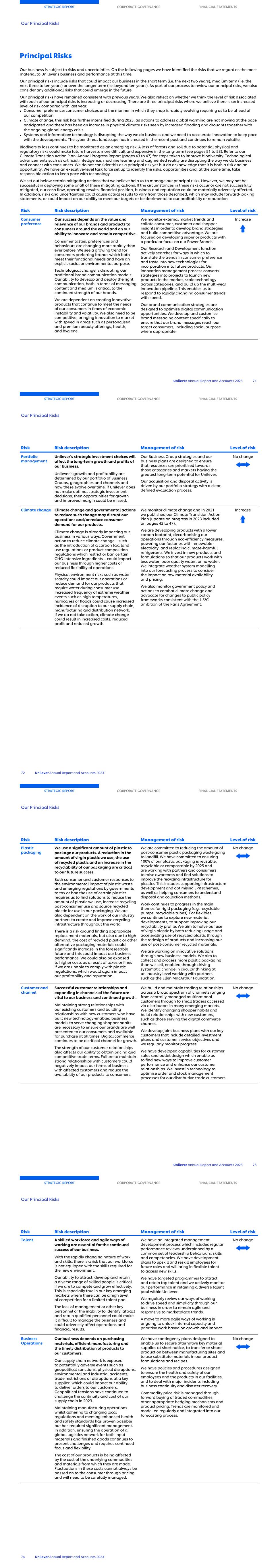 Principal Risks Our business is subject to risks and uncertainties. On the following pages we have identified the risks that we regard as the most material to Unilever’s business and performance at this time. Our principal risks include risks that could impact our business in the short term (i.e. the next two years), medium term (i.e. the next three to ten years) or over the longer term (i.e. beyond ten years). As part of our process to review our principal risks, we also consider any additional risks that could emerge in the future. Our principal risks have remained consistent with previous years. We also reflect on whether we think the level of risk associated with each of our principal risks is increasing or decreasing. There are three principal risks where we believe there is an increased level of risk compared with last year: ■ Consumer preference: consumer choices and the manner in which they shop is rapidly evolving requiring us to be ahead of our competition. ■ Climate change: this risk has further intensified during 2023, as actions to address global warming are not moving at the pace anticipated and there has been an increase in physical climate risks seen by increased flooding and droughts together with the ongoing global energy crisis. ■ Systems and information: technology is disrupting the way we do business and we need to accelerate innovation to keep pace with the developments. The cyber threat landscape has increased in the recent past and continues to remain volatile. Biodiversity loss continues to be monitored as an emerging risk. A loss of forests and soil due to potential physical and regulatory risks could make future harvests more difficult and expensive in the long-term (see pages 51 to 53). Refer to our Climate Transition Action Plan: Annual Progress Report (pages 43 to 47) for steps taken to improve biodiversity. Technological advancements such as artificial intelligence, machine learning and augmented reality are disrupting the way we do business and connect with consumers. We do not consider this as a principal risk yet but do acknowledge that it is both a risk and an opportunity. We have an executive-level task force set up to identify the risks, opportunities and, at the same time, take responsible action to keep pace with technology. We set out below certain mitigating actions that we believe help us to manage our principal risks. However, we may not be successful in deploying some or all of these mitigating actions. If the circumstances in these risks occur or are not successfully mitigated, our cash flow, operating results, financial position, business and reputation could be materially adversely affected. In addition, risks and uncertainties could cause actual results to vary from those described, which may include forward-looking statements, or could impact on our ability to meet our targets or be detrimental to our profitability or reputation. Risk Risk description Management of risk Level of risk Consumer preference Our success depends on the value and relevance of our brands and products to consumers around the world and on our ability to innovate and remain competitive. Consumer tastes, preferences and behaviours are changing more rapidly than ever before. We see a growing trend for consumers preferring brands which both meet their functional needs and have an explicit social or environmental purpose. Technological change is disrupting our traditional brand communication models. Our ability to develop and deploy the right communication, both in terms of messaging content and medium is critical to the continued strength of our brands. We are dependent on creating innovative products that continue to meet the needs of our consumers in times of economic instability and volatility. We also need to be competitive, bringing innovation to market with speed in areas such as personalised and premium beauty offerings, health, and hygiene. We monitor external market trends and collate consumer, customer and shopper insights in order to develop brand strategies and build competitive advantage. We are focused on developing superior products with a particular focus on our Power Brands. Our Research and Development function actively searches for ways in which to translate the trends in consumer preference and taste into new technologies for incorporation into future products. Our innovation management process converts strategies into projects to launch new products in the market, scale technology across categories, and build up the multi-year innovation pipeline. This enables us to respond to rapidly changing consumer trends with speed. Our brand communication strategies are designed to optimise digital communication opportunities. We develop and customise brand messaging content specifically to ensure that our brand messages reach our target consumers, including social purpose where appropriate. Increase STRATEGIC REPORT CORPORATE GOVERNANCE FINANCIAL STATEMENTS Our Principal Risks Unilever Annual Report and Accounts 2023 71 Risk Risk description Management of risk Level of risk Portfolio management Unilever’s strategic investment choices will affect the long-term growth and profits of our business. Unilever’s growth and profitability are determined by our portfolio of Business Groups, geographies and channels and how these evolve over time. If Unilever does not make optimal strategic investment decisions, then opportunities for growth and improved margin could be missed. Our Business Group strategies and our business plans are designed to ensure that resources are prioritised towards those categories and markets having the greatest long-term potential for Unilever. Our acquisition and disposal activity is driven by our portfolio strategy with a clear, defined evaluation process. No change Climate change Climate change and governmental actions to reduce such change may disrupt our operations and/or reduce consumer demand for our products. Cli
