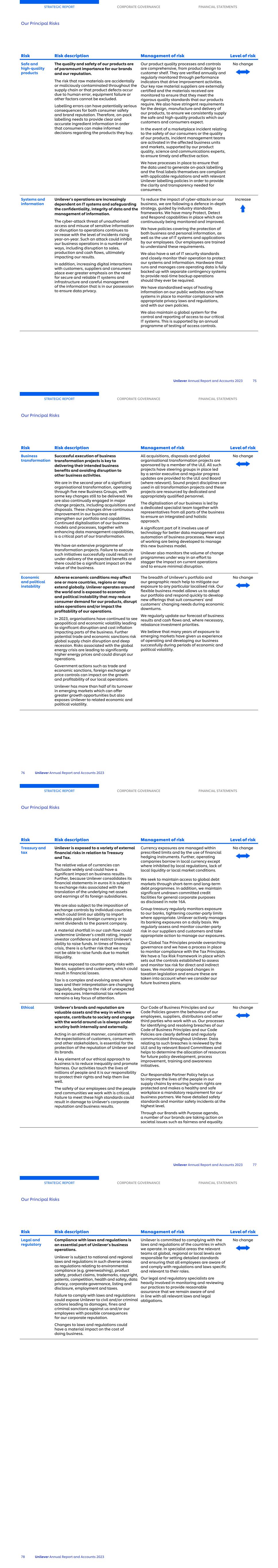 Risk Risk description Management of risk Level of risk Safe and high-quality products The quality and safety of our products are of paramount importance for our brands and our reputation. The risk that raw materials are accidentally or maliciously contaminated throughout the supply chain or that product defects occur due to human error, equipment failure or other factors cannot be excluded. Labelling errors can have potentially serious consequences for both consumer safety and brand reputation. Therefore, on-pack labelling needs to provide clear and accurate ingredient information in order that consumers can make informed decisions regarding the products they buy. Our product quality processes and controls are comprehensive, from product design to customer shelf. They are verified annually and regularly monitored through performance indicators that drive improvement activities. Our key raw material suppliers are externally certified and the materials received are monitored to ensure that they meet the rigorous quality standards that our products require. We also have stringent requirements for the design, manufacture and delivery of our products, to ensure we consistently supply the safe and high-quality products which our customers and consumers expect. In the event of a marketplace incident relating to the safety of our consumers or the quality of our products, incident management teams are activated in the affected business units and markets, supported by our product quality, science and communications experts, to ensure timely and effective action. We have processes in place to ensure that the data used to generate on-pack labelling and the final labels themselves are compliant with applicable regulations and with relevant Unilever labelling policies in order to provide the clarity and transparency needed for consumers. No change Systems and information Unilever’s operations are increasingly dependent on IT systems and safeguarding the confidentiality, integrity of data and the management of information. The cyber-attack threat of unauthorised access and misuse of sensitive information or disruption to operations continues to increase with the level of incidents rising year-on-year. Such an attack could inhibit our business operations in a number of ways, including disruption to sales, production and cash flows, ultimately impacting our results. In addition, increasing digital interactions with customers, suppliers and consumers place ever greater emphasis on the need for secure and reliable IT systems and infrastructure and careful management of the information that is in our possession to ensure data privacy. To reduce the impact of cyber-attacks on our business, we are following a defence in-depth strategy, guided by industry standards frameworks. We have many Protect, Detect and Respond capabilities in place which are continuously being monitored and improved. We have policies covering the protection of both business and personal information, as well as the use of IT systems and applications by our employees. Our employees are trained to understand these requirements. We also have a set of IT security standards and closely monitor their operation to protect our systems and information. Hardware that runs and manages core operating data is fully backed up with separate contingency systems to provide real-time backup operations should they ever be required. We have standardised ways of hosting information on our public websites and have systems in place to monitor compliance with appropriate privacy laws and regulations, and with our own policies. We also maintain a global system for the control and reporting of access to our critical IT systems. This is supported by an annual programme of testing of access controls. Increase STRATEGIC REPORT CORPORATE GOVERNANCE FINANCIAL STATEMENTS Our Principal Risks Unilever Annual Report and Accounts 2023 75 Risk Risk description Management of risk Level of risk Business transformation Successful execution of business transformation projects is key to delivering their intended business benefits and avoiding disruption to other business activities. We are in the second year of a significant organisational transformation, operating through five new Business Groups, with some key changes still to be delivered. We are also continually engaged in major change projects, including acquisitions and disposals. These changes drive continuous improvement in our business and strengthen our portfolio and capabilities. Continued digitalisation of our business models and processes, together with enhancing data management capabilities, is a critical part of our transformation. We have an extensive programme of transformation projects. Failure to execute such initiatives successfully could result in under-delivery of the expected benefits and there could be a significant impact on the value of the business. All acquisitions, disposals and global organisational transformation projects are sponsored by a member of the ULE. All such projects have steering groups in place led by a senior executive and regular progress updates are provided to the ULE and Board (where relevant). Sound project disciplines are used in all transformation projects and these projects are resourced by dedicated and appropriately qualified personnel. The digitalisation of our business is led by a dedicated specialist team together with representatives from all parts of the business to ensure an integrated and holistic approach. A significant part of it involves use of technology for better data management and automation of business processes. New ways of working are being developed to manage this new business model. Unilever also monitors the volume of change programmes under way in an effort to stagger the impact on current operations and to ensure minimal disruption. No change Economic and political instability Adverse economic conditions may affect one or more countries, 