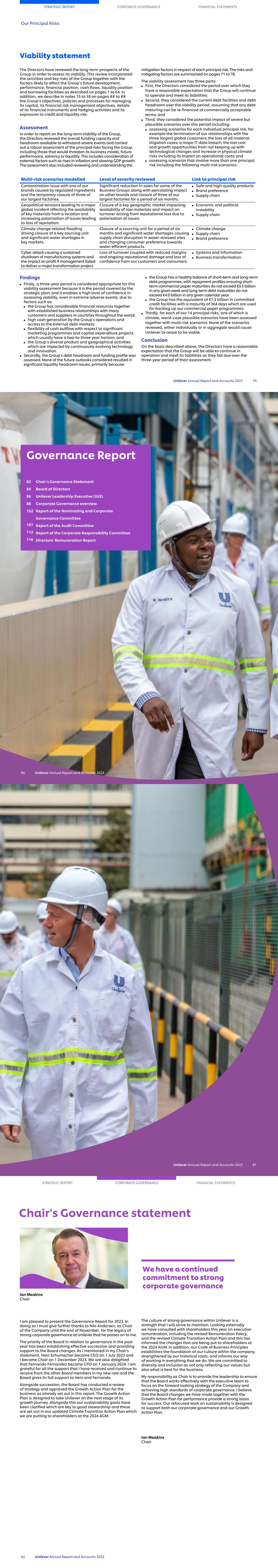 Viability statement The Directors have reviewed the long-term prospects of the Group in order to assess its viability. This review incorporated the activities and key risks of the Group together with the factors likely to affect the Group’s future development, performance, financial position, cash flows, liquidity position and borrowing facilities as described on pages 1 to 64. In addition, we describe in notes 15 to 18 on pages ## to ## the Group’s objectives, policies and processes for managing its capital, its financial risk management objectives, details of its financial instruments and hedging activities and its exposures to credit and liquidity risk. Assessment In order to report on the long-term viability of the Group, the Directors reviewed the overall funding capacity and headroom available to withstand severe events and carried out a robust assessment of the principal risks facing the Group, including those that would threaten its business model, future performance, solvency or liquidity. This includes consideration of external factors such as rises in inflation and slowing GDP growth. The assessment also included reviewing and understanding the mitigation factors in respect of each principal risk. The risks and mitigating factors are summarised on pages 71 to 78. The viability assessment has three parts: ■ First, the Directors considered the period over which they have a reasonable expectation that the Group will continue to operate and meet its liabilities; ■ Second, they considered the current debt facilities and debt headroom over the viability period, assuming that any debt maturing can be re-financed at commercially acceptable terms; and ■ Third, they considered the potential impact of severe but plausible scenarios over this period including: ■ assessing scenarios for each individual principal risk, for example the termination of our relationships with the three largest global customers; the loss of all material litigation cases; a major IT data breach; the lost cost and growth opportunities from not keeping up with technological changes and increase in physical climate risks including its impact on operational costs; and ■ assessing scenarios that involve more than one principal risk including the following multi-risk scenarios: Multi-risk scenarios modelled Level of severity reviewed Link to principal risk Contamination issue with one of our brands caused by regulated ingredients and the temporary closure of three of our largest factories. Significant reduction in sales for some of the Business Groups along with percolating impact on other brands and closure of three of our largest factories for a period of six months. ■ Safe and high-quality products ■ Brand preference ■ Supply chain Geopolitical tensions leading to a major global incident affecting the availability of key materials from a location and increasing polarisation of issues leading to loss of reputation. Closure of a key geographic market impacting availability of raw materials and impact on turnover arising from reputational loss due to polarisation of issues. ■ Economic and political instability ■ Supply chain Climate change-related flooding driving closure of a key sourcing unit and significant water shortages in key markets. Closure of a sourcing unit for a period of six months and significant water shortages causing supply chain disruption in water-stressed sites and changing consumer preference towards water-efficient products. ■ Climate change ■ Supply chain ■ Brand preference Cyber-attack causing a sustained shutdown of manufacturing systems and the impact on profit if management failed to deliver a major transformation project. Loss of turnover coupled with reduced margins and ongoing reputational damage and loss of confidence from our customers and consumers. ■ Systems and information ■ Business transformation Findings ■ Firstly, a three-year period is considered appropriate for this viability assessment because it is the period covered by the strategic plan; and it enables a high level of confidence in assessing viability, even in extreme adverse events, due to factors such as: ■ the Group has considerable financial resources together with established business relationships with many customers and suppliers in countries throughout the world; ■ high cash generation by the Group’s operations and access to the external debt markets; ■ flexibility of cash outflow with respect to significant marketing programmes and capital expenditure projects which usually have a two-to-three year horizon; and ■ the Group’s diverse product and geographical activities which are impacted by continuously evolving technology and innovation. ■ Secondly, the Group’s debt headroom and funding profile was assessed. None of the future outlooks considered resulted in significant liquidity headroom issues, primarily because: ■ the Group has a healthy balance of short-term and long-term debt programmes, with repayment profiles ensuring short- term commercial paper maturities do not exceed €0.5 billion in any given week and long-term debt maturities do not exceed €4.0 billion in any given calendar year ■ the Group has the equivalent of €7.3 billion in committed credit facilities with a maturity of 364 days which are used for backing up our commercial paper programmes. ■ Thirdly, for each of our 14 principal risks, one of which is climate, worst-case plausible scenarios have been assessed together with multi-risk scenarios. None of the scenarios reviewed, either individually or in aggregate would cause Unilever to cease to be viable. Conclusion On the basis described above, the Directors have a reasonable expectation that the Group will be able to continue in operation and meet its liabilities as they fall due over the three-year period of their assessment. STRATEGIC REPORT CORPORATE GOVERNANCE FINANCIAL STATEMENTS Our Principal Risks Unilever Annual Re
