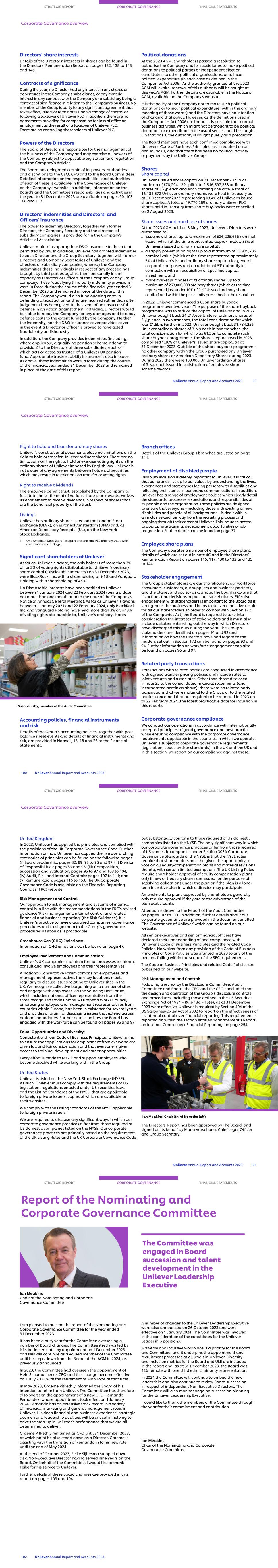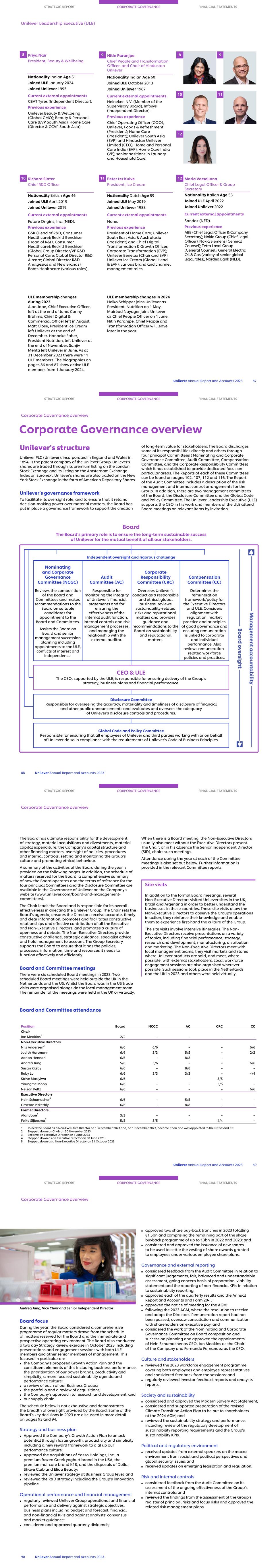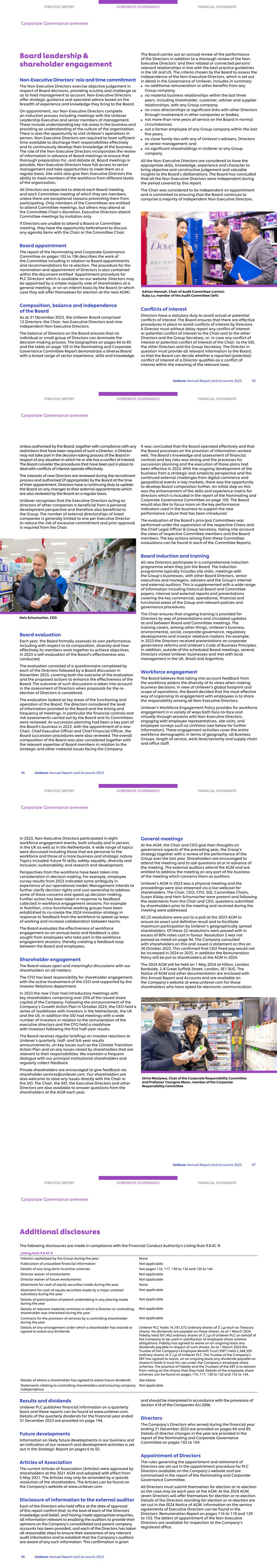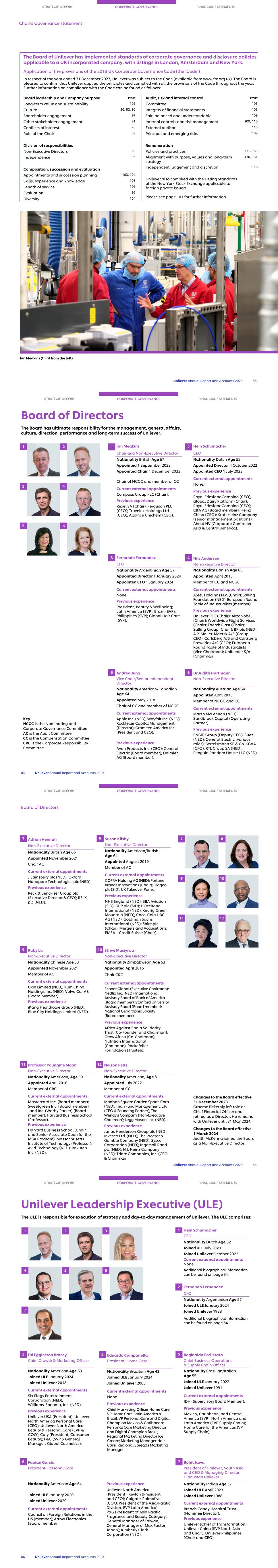 The Board of Unilever has implemented standards of corporate governance and disclosure policies applicable to a UK incorporated company, with listings in London, Amsterdam and New York. Application of the provisions of the 2018 UK Corporate Governance Code (the ‘Code’) In respect of the year ended 31 December 2023, Unilever was subject to the Code (available from www.frc.org.uk). The Board is pleased to confirm that Unilever applied the principles and complied with all the provisions of the Code throughout the year. Further information on compliance with the Code can be found as follows: STRATEGIC REPORT CORPORATE GOVERNANCE FINANCIAL STATEMENTS Chair's Governance statement Unilever Annual Report and Accounts 2023 83 Board leadership and Company purpose page Long-term value and sustainability 109 Culture 36, 82, 90 Shareholder engagement 97 Other stakeholder engagement 91 Conflicts of interest 95 Role of the Chair 89 Division of responsibilities Non-Executive Directors 89 Independence 95 Composition, succession and evaluation Appointments and succession planning 103, 104 Skills, experience and knowledge 105 Length of service 106 Evaluation 96 Diversity 104 Audit, risk and internal control page Committee 108 Integrity of financial statements 108 Fair, balanced and understandable 109 Internal controls and risk management 109, 110 External auditor 110 Principal and emerging risks 109 Remuneration Policies and practices 116-153 Alignment with purpose, values and long-term strategy 130, 131 Independent judgement and discretion 116 Unilever also complied with the Listing Standards of the New York Stock Exchange applicable to foreign private issuers. Please see page 101 for further information. Ian Meakins (third from the left) STRATEGIC REPORT CORPORATE GOVERNANCE FINANCIAL STATEMENTS Board of Directors The Board has ultimate responsibility for the management, general affairs, culture, direction, performance and long-term success of Unilever. 84 Unilever Annual Report and Accounts 2023 5 6 3 4 1 2 1 Ian Meakins Chair and Non-Executive Director Nationality British Age 67 Appointed 1 September 2023 Appointed Chair 1 December 2023 Chair of NCGC and member of CC Current external appointments Compass Group PLC (Chair). Previous experience Rexel SA (Chair); Ferguson PLC (CEO); Travelex Holdings Ltd (CEO); Alliance Unichem (CEO). 3 Fernando Fernandez CFO Nationality Argentinian Age 57 Appointed Director 1 January 2024 Appointed CFO 1 January 2024 Current external appointments None. Previous experience President, Beauty & Wellbeing; Latin America (EVP); Brazil (EVP); Philippines (SVP); Global Hair Care (SVP). 4 Nils Andersen Non-Executive Director Nationality Danish Age 65 Appointed April 2015 Member of CC and NCGC Current external appointments ASML Holdings N.V. (Chair); Salling Foundation (NED); European Round Table of Industrialists (member). Previous experience Unilever PLC (Chair); AkzoNobel (Chair); Worldwide Flight Services (Chair); Faerch Plast (Chair); Salling Group (Chair); BP plc (NED); A.P. Moller-Maersk A/S (Group CEO); Carlsberg A/S and Carlsberg Breweries A/S (CEO); European Round Table of Industrialists (Vice Chairman); Unifeeder S/A (Chairman). 6 Dr Judith Hartmann Non-Executive Director Nationality Austrian Age 54 Appointed April 2015 Member of NCGC and CC Current external appointments Marsh McLennan (NED); Sandbrook Capital (Operating Partner). Previous experience ENGIE Group (Deputy CEO); Suez (NED); General Electric (various roles); Bertelsmann SE & Co. KGaA (CFO); RTL Group SA (NED); Penguin Random House LLC (NED). 2 Hein Schumacher CEO Nationality Dutch Age 52 Appointed Director 4 October 2022 Appointed CEO 1 July 2023 Current external appointments None. Previous experience Royal FrieslandCampina (CEO); Global Dairy Platform (Chair); Royal FrieslandCampina (CFO); C&A AG (Board member); Heinz China (CEO); Kraft Heinz Company (senior management positions); Ahold NV (Corporate Controller Asia & Central America). 5 Andrea Jung Vice Chair/Senior Independent Director Nationality American/Canadian Age 64 Appointed May 2018 Chair of CC and member of NCGC Current external appointments Apple Inc. (NED); Wayfair Inc. (NED); Rockfeller Capital Management (Director); Grameen America Inc. (President and CEO). Previous experience Avon Products Inc. (CEO); General Electric (Board member); Daimler AG (Board member). Key NCGC is the Nominating and Corporate Governance Committee AC is the Audit Committee CC is the Compensation Committee CRC is the Corporate Responsibility Committee STRATEGIC REPORT CORPORATE GOVERNANCE FINANCIAL STATEMENTS Board of Directors Unilever Annual Report and Accounts 2023 85 9 10 11 12 7 87 Adrian Hennah Non-Executive Director Nationality British Age 66 Appointed November 2021 Chair AC Current external appointments J Sainsbury plc (NED); Oxford Nanopore Technologies plc (NED). Previous experience Reckitt Benckiser Group plc (Executive Director & CFO); RELX plc (NED). 8 Susan Kilsby Non-Executive Director Nationality American/British Age 64 Appointed August 2019 Member of AC Current external appointments COFRA Holding AG (NED); Fortune Brands Innovations (Chair); Diageo plc (SID); UK Takeover Panel. Previous experience NHS England (NED); BBA Aviation (SID); BHP plc (SID); L’Occitane International (NED); Keurig Green Mountain (NED); Coca-Cola HBC AG (NED); Goldman Sachs International (NED); Shire plc (Chair); Mergers and Acquisitions, EMEA – Credit Suisse (Chair). 9 Ruby Lu Non-Executive Director Nationality Chinese Age 53 Appointed November 2021 Member of AC Current external appointments Uxin Limited (NED); Yum China Holdings Inc. (NED); Volvo Car AB (Board Member). Previous experience iKang Healthcare Group (NED); Blue City Holdings Limited (NED). 10 Strive Masiyiwa Non-Executive Director Nationality Zimbabwean Age 63 Appointed April 2016 Chair CRC Current external appointments Econet Global (Executive Chairman); Netflix Inc. (NED); International Advisory B