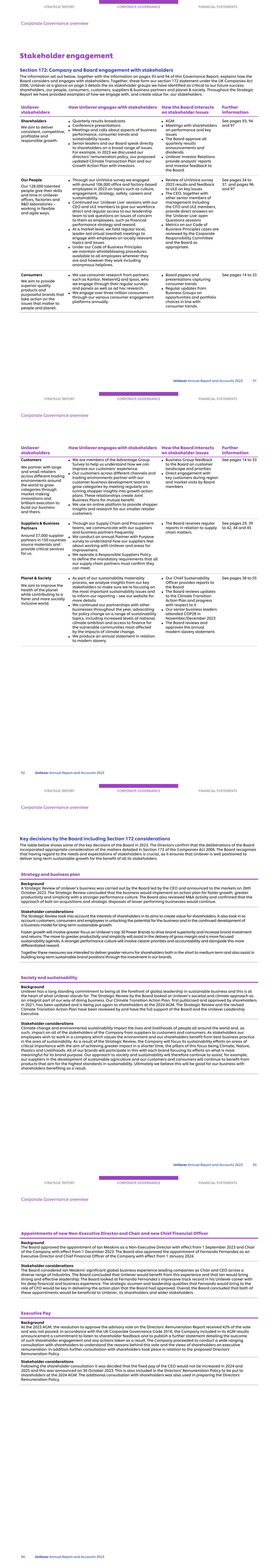 Stakeholder engagement Section 172: Company and Board engagement with stakeholders The information set out below, together with the information on pages 93 and 94 of this Governance Report, explains how the Board considers and engages with stakeholders. Together, these form our section 172 statement under the UK Companies Act 2006. Unilever at a glance on page 3 details the six stakeholder groups we have identified as critical to our future success: shareholders, our people, consumers, customers, suppliers & business partners and planet & society. Throughout the Strategic Report we have provided examples of how we engage with, and create value for, our stakeholders. Shareholders We aim to deliver consistent, competitive, profitable and responsible growth. ■ Quarterly results broadcasts ■ Conference presentations ■ Meetings and calls about aspects of business performance, consumer trends and sustainability issues. ■ Senior leaders and our Board speak directly to shareholders on a broad range of issues. For example, in 2023 we discussed our directors’ remuneration policy, our proposed updated Climate Transaction Plan and our Growth Action Plan with investors. ■ AGM ■ Meetings with shareholders on performance and key issues ■ The Board approve all quarterly results announcements and dividends ■ Unilever Investor Relations provide analysts' reports and investor feedback to the Board. See pages 93, 94 and 97 Our People Our 128,000 talented people give their skills and time in Unilever offices, factories and R&D laboratories – working in flexible and agile ways. ■ Through our UniVoice survey we engaged with around 106,000 office and factory-based employees in 2023 on topics such as culture, engagement, strategy, safety, careers and sustainability. ■ Continued our ‘Unilever Live’ sessions with our CEO and ULE members to give our workforce direct and regular access to our leadership team to ask questions on issues of concern to them as employees, such as financial performance strategy and reward. ■ At a market level, we held regular local, leader-led virtual townhall meetings to engage with employees on locally relevant topics and issues. ■ Under our Code of Business Principles we maintain whistleblowing procedures available to all employees wherever they are and however they work including anonymous helplines. ■ Review of UniVoice survey 2023 results and feedback to ULE on key issues ■ The CEO, together with other senior members of management including the CFO and ULE members, provide direct answers on the 'Unilever Live' open Questions sessions ■ Metrics on our Code of Business Principles cases are reviewed by the Corporate Responsibility Committee and the Board as appropriate. See pages 34 to 37, and pages 96 and 97 Consumers We aim to provide superior-quality products and purposeful brands that take action on the issues that matter to people and planet. ■ We use consumer research from partners such as Kantar, NielsenIQ and Ipsos, who we engage through their regular surveys and panels as well as ad hoc research. ■ We engage over three million consumers through our various consumer engagement platforms annually. ■ Board papers and presentations capturing consumer trends ■ Regular updates from Business Groups on opportunities and portfolio choices in line with consumer trends. See pages 14 to 33 Unilever stakeholders How Unilever engages with stakeholders How the Board interacts on stakeholder issues Further information STRATEGIC REPORT CORPORATE GOVERNANCE FINANCIAL STATEMENTS Corporate Governance overview Unilever Annual Report and Accounts 2023 91 Customers We partner with large and small retailers across different trading environments around the world to grow categories through market making innovations and brilliant execution to build our business and theirs. ■ We are members of the Advantage Group Survey to help us understand how we can improve our customers’ experience. ■ Our customers across different channels and trading environments partner with our customer business development teams to grow categories by meeting regularly on turning shopper insights into growth action plans. These relationships create Joint Business Plans for mutual benefit. ■ We use an online platform to provide shopper insights and research for our smaller retailer customers. ■ Business Group feedback to the Board on customer landscape and priorities ■ Direct engagement with key customers during region and market visits by Board members See pages 14 to 33 Suppliers & Business Partners Around 57,000 supplier partners in 150 countries source materials and provide critical services for us. ■ Through our Supply Chain and Procurement teams, we communicate with our suppliers and business partners frequently. ■ We conduct an annual Partner with Purpose survey to understand how our suppliers feel about working with Unilever and areas for improvement. ■ We operate a Responsible Suppliers Policy to define the mandatory requirements that all our supply chain partners must confirm they can meet. ■ The Board receives regular reports in relation to supply chain matters. See pages 29, 39 to 42, 44 and 45 Planet & Society We aim to improve the health of the planet while contributing to a fairer and more socially inclusive world. ■ As part of our sustainability materiality process, we analyse insights from our key stakeholders to make sure we’re focusing on the most important sustainability issues and to inform our reporting – see our website for more details. ■ We continued our partnerships with other businesses throughout the year, advocating for policy change on a range of sustainability topics, including increased levels of national climate ambition and access to finance for the vulnerable communities most affected by the impacts of climate change. ■ We produce an annual statement in relation to modern slavery. ■ Our Chief Sust
