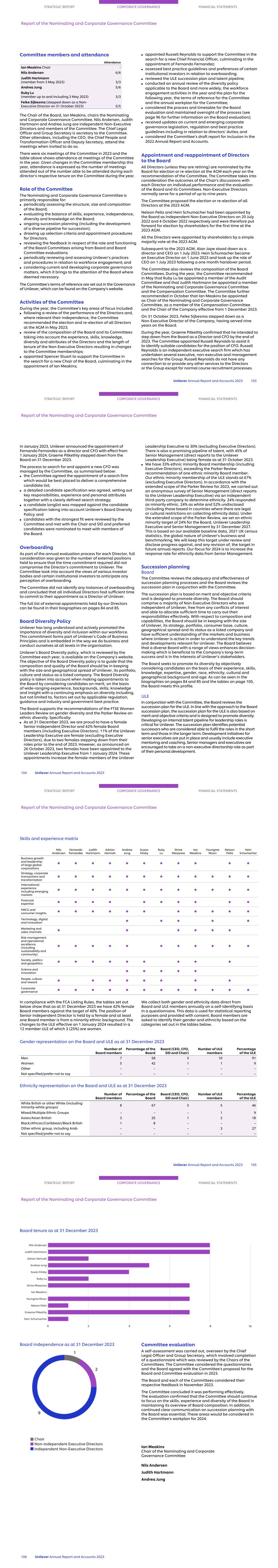 Committee members and attendance Attendance Ian Meakins Chair - Nils Andersen 6/6 Judith Hartmann (member from 3 May 2023) 3/3 Andrea Jung 5/6 Ruby Lu (member up to and including 3 May 2023) 3/3 Feike Sijbesma (stepped down as a Non- Executive Director on 31 October 2023) 5/5 The Chair of the Board, Ian Meakins, chairs the Nominating and Corporate Governance Committee. Nils Andersen, Judith Hartmann and Andrea Jung are independent Non-Executive Dircetors and members of the Committee. The Chief Legal Officer and Group Secretary is secretary to the Committee. Other attendees, including the CEO, the Chief People and Transformation Officer and Deputy Secretary, attend the meetings when invited to do so. There were six meetings of the Committee in 2023 and the table above shows attendance at meetings of the Committee in the year. Given changes in the Committee membership this year, attendance is expressed as the number of meetings attended out of the number able to be attended during each director’s respective tenure on the Committee during the year. Role of the Committee The Nominating and Corporate Governance Committee is primarily responsible for: ■ periodically assessing the structure, size and composition of the Board; ■ evaluating the balance of skills, experience, independence, diversity and knowledge on the Board; ■ ongoing succession planning (including the development of a diverse pipeline for succession); ■ drawing up selection criteria and appointment procedures for Directors; ■ reviewing the feedback in respect of the role and functioning of the Board Committees arising from Board and Board Committee evaluations; ■ periodically reviewing and assessing Unilever’s practices and procedures in relation to workforce engagement; and ■ considering current and developing corporate governance matters, which it brings to the attention of the Board where deemed necessary. The Committee’s terms of reference are set out in the Governance of Unilever, which can be found on the Company’s website. Activities of the Committee During the year, the Committee’s key areas of focus included: ■ following a review of the performance of the Directors and, where relevant their independence, the Committee recommended the election and re-election of all Directors at the AGM in May 2023; ■ review of the composition of the Board and its Committees taking into account the experience, skills, knowledge, diversity and attributes of the Directors and the length of tenure of the Non-Executive Directors resulting in changes to the Committee memberships; ■ appointed Spencer Stuart to support the Committee in the search for a new Chair of the Board, culminating in the appointment of Ian Meakins; ■ appointed Russell Reynolds to support the Committee in the search for a new Chief Financial Officer, culminating in the appointment of Fernando Fernandez; ■ assessed best practice guidelines and preferences of certain institutional investors in relation to overboarding; ■ reviewed the ULE succession plan and talent pipeline; ■ conducted an annual review of the diversity policy applicable to the Board and more widely, the workforce engagement activities in the year and the plan for the following year, the terms of reference for the Committee and the annual workplan for the Committee; ■ considered the process and timetable for the Board evaluation and maintained oversight of the process (see page 96 for further information on the Board evaluation); ■ received updates on current and emerging corporate governance legislation, regulation and best practice guidelines including in relation to directors’ duties; and ■ considered the Committee’s draft report for inclusion in the 2022 Annual Report and Accounts. Appointment and reappointment of Directors to the Board All Directors (unless they are retiring) are nominated by the Board for election or re-election at the AGM each year on the recommendation of the Committee. The Committee takes into consideration the outcomes of the Chair's discussions with each Director on individual performance and the evaluation of the Board and its Committees. Non-Executive Directors normally serve for a period of up to nine years. The Committee proposed the election or re-election of all Directors at the 2023 AGM. Nelson Peltz and Hein Schumacher had been appointed by the Board as independent Non-Executive Directors on 20 July 2022 and 4 October 2022 respectively and were therefore put forward for election by shareholders for the first time at the 2023 AGM. All the Directors were appointed by shareholders by a simple majority vote at the 2023 AGM. Subsequent to the 2023 AGM, Alan Jope stood down as a director and CEO on 1 July 2023. Hein Schumacher became an Executive Director on 1 June 2023 and took up the role of CEO on 1 July 2023 following a one month handover period. The Committee also reviews the composition of the Board Committees. During the year, the Committee recommended in May that Ruby Lu be appointed a member of the Audit Committee and that Judith Hartmann be appointed a member of the Nominating and Corporate Governance Committee and the Compensation Committee. The Committee further recommended in October that Ian Meakins be appointed as Chair of the Nominating and Corporate Governance Committee, as a member of the Compensation Committee and the Chair of the Company effective from 1 December 2023. On 31 October 2023, Feike Sijbesma stepped down as a Non-Executive Director of the Company, having served nine years on the Board. During the year, Graeme Pitkethly confirmed that he intended to step down from the Board as a Director and CFO by the end of 2023. The Committee appointed Russell Reynolds to assist it to identify suitable candidates for the position of CFO. Russell Reynolds is an independent executive search firm which has undertaken several executive, non-executive and management searches for the Group. Russell Re