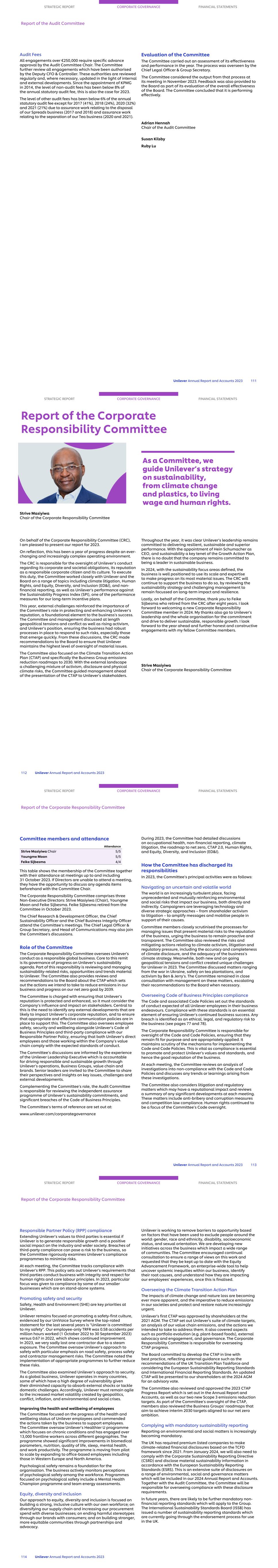 Audit Fees All engagements over €250,000 require specific advance approval by the Audit Committee Chair. The Committee further review all engagements which have been authorised by the Deputy CFO & Controller. These authorities are reviewed regularly and, where necessary, updated in the light of internal and external developments. Since the appointment of KPMG in 2014, the level of non-audit fees has been below 8% of the annual statutory audit fee, this is also the case for 2023. The level of other audit fees has been below 6% of the annual statutory audit fee except for 2017 (41%), 2018 (24%), 2020 (32%) and 2021 (21%) due to assurance work relating to the disposal of our Spreads business (2017 and 2018) and assurance work relating to the separation of our Tea business (2020 and 2021). Evaluation of the Committee The Committee carried out an assessment of its effectiveness and performance in the year. The process was overseen by the Chief Legal Officer & Group Secretary. The Committee considered the output from that process at its meeting in November 2023. Feedback was also provided to the Board as part of its evaluation of the overall effectiveness of the Board. The Committee concluded that it is performing effectively. Adrian Hennah Chair of the Audit Committee Susan Kilsby Ruby Lu STRATEGIC REPORT CORPORATE GOVERNANCE FINANCIAL STATEMENTS Report of the Audit Committee Unilever Annual Report and Accounts 2023 111 As a Committee, we guide Unilever’s strategy on sustainability, from climate change and plastics, to living wage and human rights. Strive Masiyiwa Chair of the Corporate Responsibility Committee On behalf of the Corporate Responsibility Committee (CRC), I am pleased to present our report for 2023. On reflection, this has been a year of progress despite an ever- changing and increasingly complex operating environment. The CRC is responsible for the oversight of Unilever’s conduct regarding its corporate and societal obligations, its reputation as a responsible corporate citizen and its culture. To execute this duty, the Committee worked closely with Unilever and the Board on a range of topics including climate litigation, Human Rights, and Equity, Diversity, and Inclusion (ED&I), and non- financial reporting, as well as Unilever’s performance against the Sustainability Progress Index (SPI), one of the performance measures for our long-term incentive plans. This year, external challenges reinforced the importance of the Committee’s role in protecting and enhancing Unilever’s reputation, a foundational element to the business's success. The Committee and management discussed at length geopolitical tensions and conflict as well as rising activism, and Unilever’s position, ensuring the business had robust processes in place to respond to such risks, especially those that emerge quickly. From these discussions, the CRC made recommendations to the Board to ensure that Unilever maintains the highest level of oversight of material issues. The Committee also focused on the Climate Transition Action Plan (CTAP) and specifically the Business Group emissions reduction roadmaps to 2030. With the external landscape a challenging mixture of activism, disclosure and physical climate risks, the Committee guided management ahead of the presentation of the CTAP to Unilever’s stakeholders. Throughout the year, it was clear Unilever’s leadership remains committed to delivering resilient, sustainable and superior performance. With the appointment of Hein Schumacher as CEO, and sustainability a key tenet of the Growth Action Plan, there is no doubt that the company remains committed to being a leader in sustainable business. In 2024, with the sustainability focus areas defined, the business is well positioned to use its scale and expertise to make progress on its most material issues. The CRC will continue to support the business to do so, by reviewing the sustainability strategy and challenging management to remain focussed on long-term impact and resilience. Lastly, on behalf of the Committee, thank you to Feike Sijbesma who retired from the CRC after eight years. I look forward to welcoming a new Corporate Responsibility Committee member in 2024. My thanks also go to Unilever’s leadership and the whole organisation for the commitment and drive to deliver sustainable, responsible growth. I look forward to the year ahead and further honest and constructive engagements with my fellow Committee members. Strive Masiyiwa Chair of the Corporate Responsibility Committee STRATEGIC REPORT CORPORATE GOVERNANCE FINANCIAL STATEMENTS Report of the Corporate Responsibility Committee 112 Unilever Annual Report and Accounts 2023 Committee members and attendance Attendance Strive Masiyiwa Chair 5/5 Youngme Moon 5/5 Feike Sijbesma 4/4 This table shows the membership of the Committee together with their attendance at meetings up to and including 31 October 2023. If Directors are unable to attend a meeting, they have the opportunity to discuss any agenda items beforehand with the Committee Chair. The Corporate Responsibility Committee comprises three Non-Executive Directors: Strive Masiyiwa (Chair), Youngme Moon and Feike Sijbesma. Feike Sijbesma retired from the Committee in October 2023. The Chief Research & Development Officer, the Chief Sustainability Officer and the Chief Business Integrity Officer attend the Committee’s meetings. The Chief Legal Officer & Group Secretary, and Head of Communications may also join the Committee's discussions. Role of the Committee The Corporate Responsibility Committee oversees Unilever’s conduct as a responsible global business. Core to this remit is its governance of progress on Unilever’s sustainability agenda. Part of this responsibility is reviewing and managing sustainability-related risks, opportunities and trends material to Unilever. The Committee also provides reviews and recommendations to the Board about the CTAP which