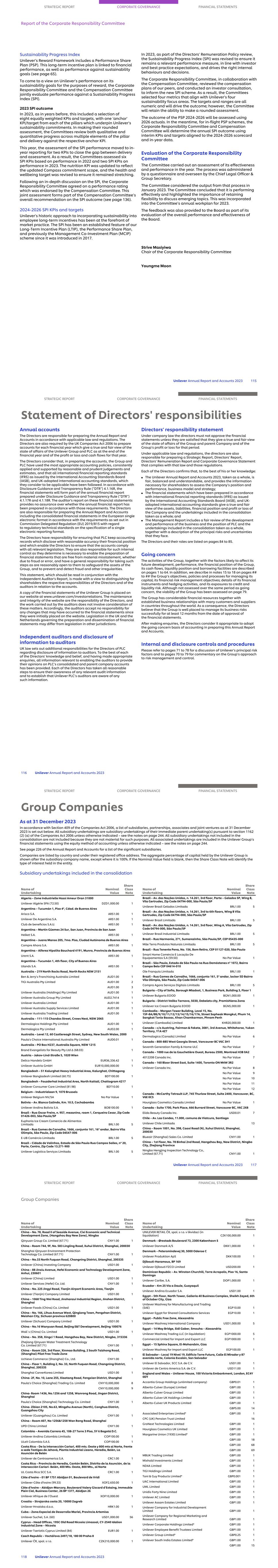 Sustainability Progress Index Unilever’s Reward Framework includes a Performance Share Plan (PSP). This long-term incentive plan is linked to financial performance, as well as performance against sustainability goals (see page 65). To come to a view on Unilever’s performance on its sustainability goals for the purposes of reward, the Corporate Responsibility Committee and the Compensation Committee jointly evaluate performance against a Sustainability Progress Index (SPI). 2023 SPI outcome In 2023, as in years before, this included a selection of eight equally weighted KPIs and targets, with one ‘anchor’ KPI/target from each of the pillars which underpin Unilever’s sustainability commitments. In making their rounded assessment, the Committees review both qualitative and quantitative progress across multiple elements of the pillar and delivery against the respective anchor KPI. This year, the assessment of the SPI performance moved to in- year reporting for two KPIs to close the gap between delivery and assessment. As a result, the Committees assessed six SPI KPIs based on performance in 2022 and two SPI KPIs on performance in 2023. The nutrition KPI was updated to reflect the updated Compass commitment scope, and the health and wellbeing target was revised to ensure it remained stretching. Following an in-depth discussion on the SPI, the Corporate Responsibility Committee agreed on a performance rating which was endorsed by the Compensation Committee. This joint assessment forms part of the Compensation Committee’s overall recommendation on the SPI outcome (see page 136). 2024-2026 SPI KPIs and targets Unilever’s historic approach to incorporating sustainability into employee long-term incentives has been at the forefront of market practice. The SPI has been an established feature of our Long-Term Incentive Plan (LTIP), the Performance Share Plan, and previously the Management Co-Investment Plan (MCIP) scheme since it was introduced in 2017. In 2023, as part of the Directors’ Remuneration Policy review, the Sustainability Progress Index (SPI) was revised to ensure it remains a relevant performance measure, in line with investor and best practice expectations, and drives the right internal behaviours and decisions. The Corporate Responsibility Committee, in collaboration with the Compensation Committee, reviewed the compensation plans of our peers, and conducted an investor consultation, to inform the new SPI scheme. As a result, the Committees selected four metrics that align with Unilever’s four sustainability focus areas. The targets and ranges are all numeric and will drive the outcome; however, the Committee will retain the ability to make a rounded assessment. The outcome of the PSP 2024-2026 will be assessed using 2026 actuals. In the meantime, for in-flight PSP schemes, the Corporate Responsibility Committee and Compensation Committee will determine the annual SPI outcome using interim KPIs and targets aligned to the 2024-2026 scorecard and in-year data. Evaluation of the Corporate Responsibility Committee The Committee carried out an assessment of its effectiveness and performance in the year. The process was administered by a questionnaire and overseen by the Chief Legal Officer & Group Secretary. The Committee considered the output from that process in January 2023. The Committee concluded that it is performing effectively and highlighted the importance of retaining flexibility to discuss emerging topics. This was incorporated into the Committee’s annual workplan for 2023. The feedback was also provided to the Board as part of its evaluation of the overall performance and effectiveness of the Board. Strive Masiyiwa Chair of the Corporate Responsibility Committee Youngme Moon STRATEGIC REPORT CORPORATE GOVERNANCE FINANCIAL STATEMENTS Report of the Corporate Responsibility Committee Unilever Annual Report and Accounts 2023 115 Annual accounts The Directors are responsible for preparing the Annual Report and Accounts in accordance with applicable law and regulations. The Directors are also required by the UK Companies Act 2006 to prepare accounts for each financial year which give a true and fair view of the state of affairs of the Unilever Group and PLC as at the end of the financial year and of the profit or loss and cash flows for that year. The Directors consider that, in preparing the accounts, the Group and PLC have used the most appropriate accounting policies, consistently applied and supported by reasonable and prudent judgements and estimates, and that all international financial reporting standards (IFRS) as issued by the International Accounting Standards Board (IASB), and UK-adopted international accounting standards, which they consider to be applicable have been followed. In accordance with Disclosure Guidance and Transparency Rule (“DTR”) 4.1.16R, the financial statements will form part of the annual financial report prepared under Disclosure Guidance and Transparency Rule (“DTR”) 4.1.17R and 4.1.18R. The auditor's report on these financial statements provides no assurance over whether the annual financial report has been prepared in accordance with those requirements. The Directors are also responsible for preparing the Annual Report and Accounts including the consolidated financial statements in the European single electronic format in accordance with the requirements as set out in Commission Delegated Regulation (EU) 2019/815 with regard to regulatory technical standards on the specification of a single electronic reporting format. The Directors have responsibility for ensuring that PLC keep accounting records which disclose with reasonable accuracy their financial position and which enable the Directors to ensure that the accounts comply with all relevant legislation. They are also responsible for such internal control as they determine is necessary to enable the preparation of financial statements that are free from mate